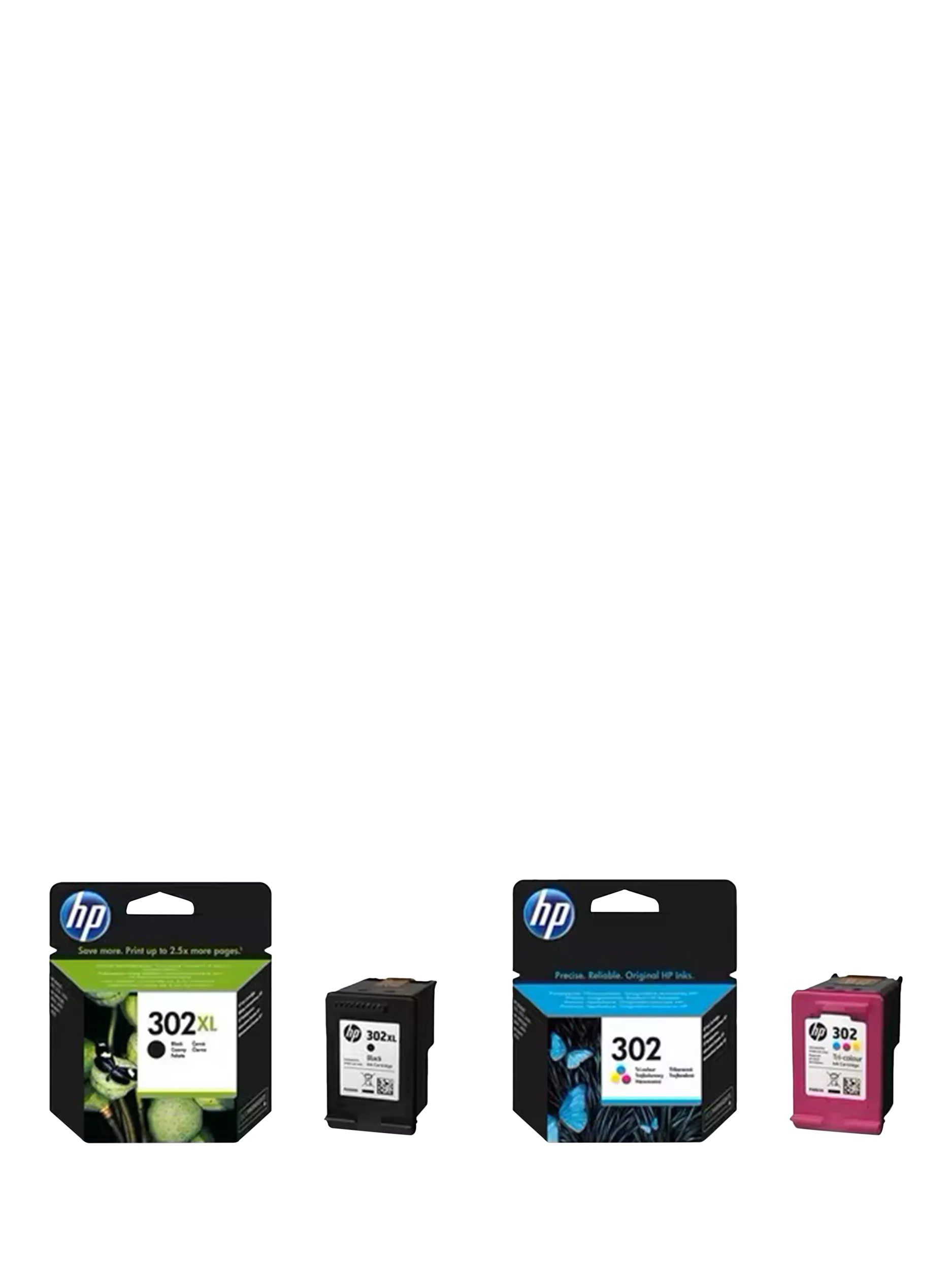 Print high-quality documents with this double pack of reliable HP Original Ink Cartridges, featuring 302XL High Yield Black and 302 Standard Yield Tri-Colour. The brand's commitment to sharp, long-lasting prints translates wonderfully to these affordable cartridges. XL high yield cartridges go further so you can print longer.