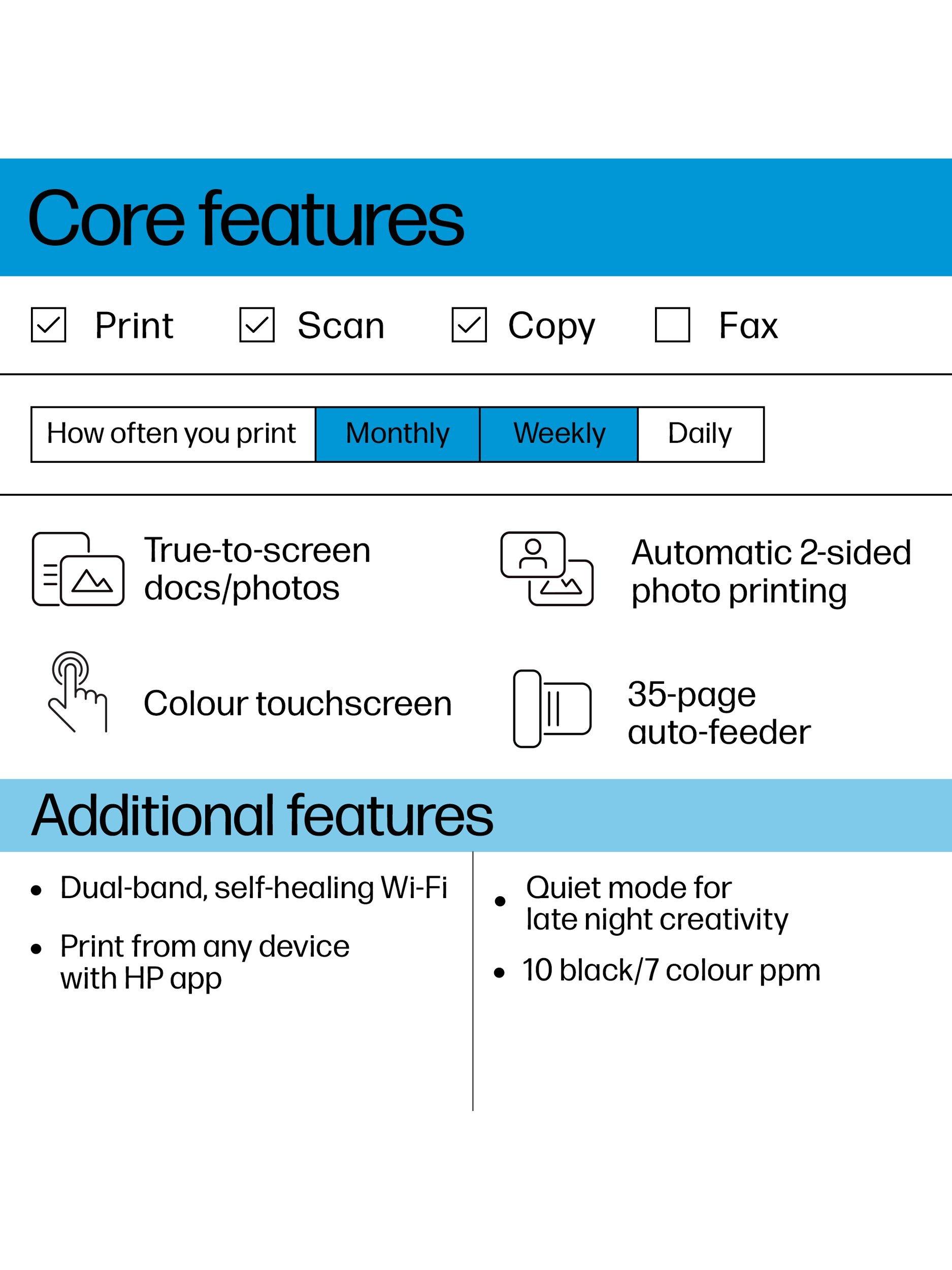 HP's wireless all in one colour photo printer, with automatic document feeder and the easy-to-use print app, offers vivid scanning, copying, duplex printing, and borderless photos. Print documents and photos that look like they do on your screen with HP's true-to-screen tech, and customise the backs of photos for personalised cards with HP's exclusive automatic 2-sided photo printing. You get Wi-Fi that actually works, automatically reconnecting if lost, with HP's dual-band, self-healing Wi-Fi. Plus, you can effortlessly set up, print, scan and copy from your phone or laptop with the app.