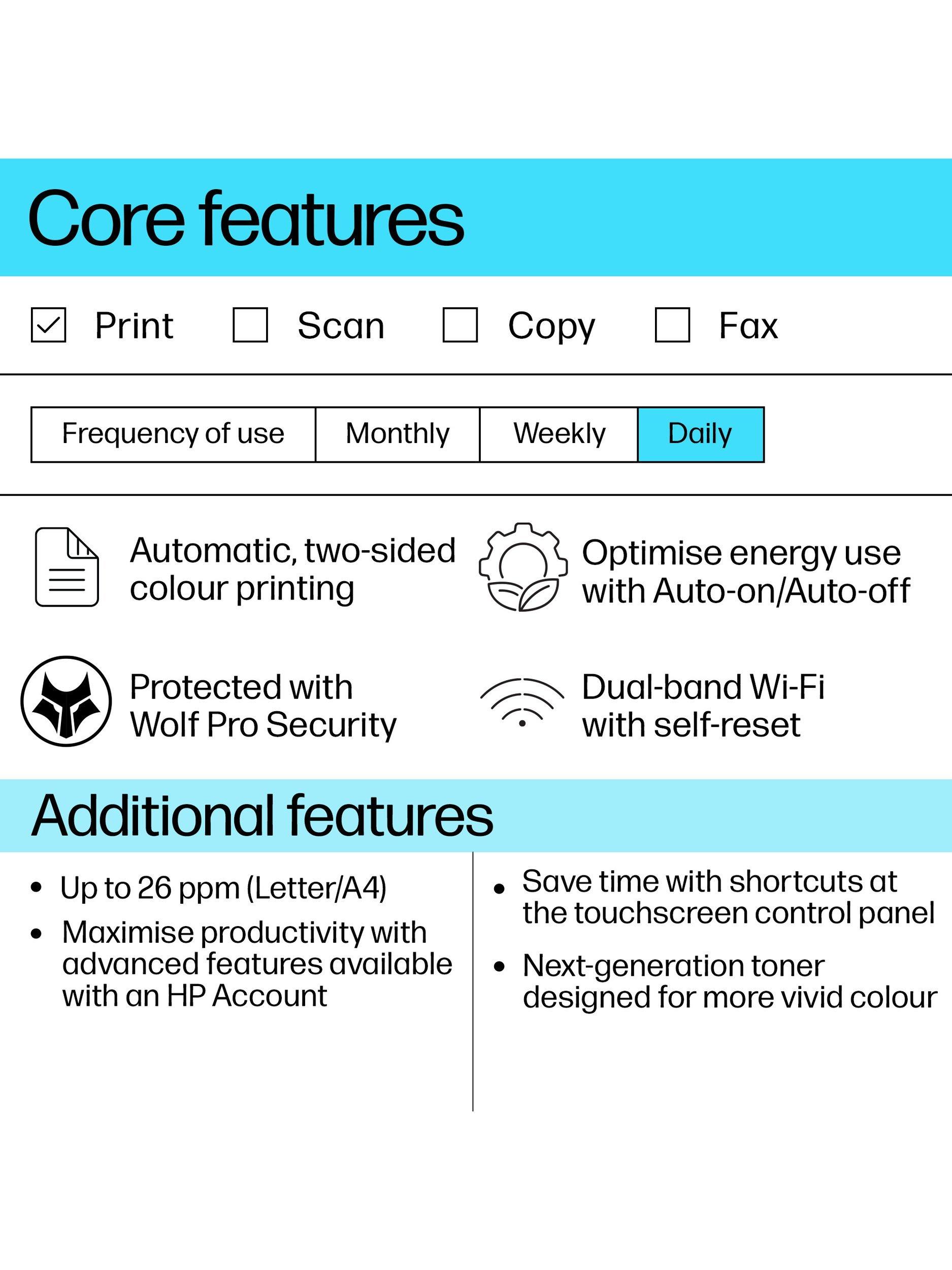 HP Auto-On/Auto-Off technology turns your printer on when you need it, and off when you don't, while Instant-On Technology saves time, delivering your first page in no time once the printer turns on.