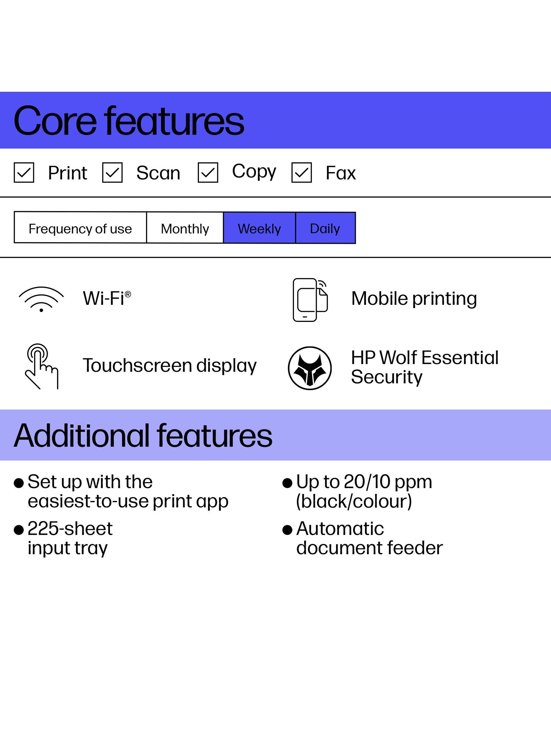 Use the touch screen to scan documents directly to shared network folders, into emails or to the cloud. The 35-page auto document feeder makes scanning or copying multi-page documents easy, while the paper trays can hold up to 225 sheets of A4 paper.