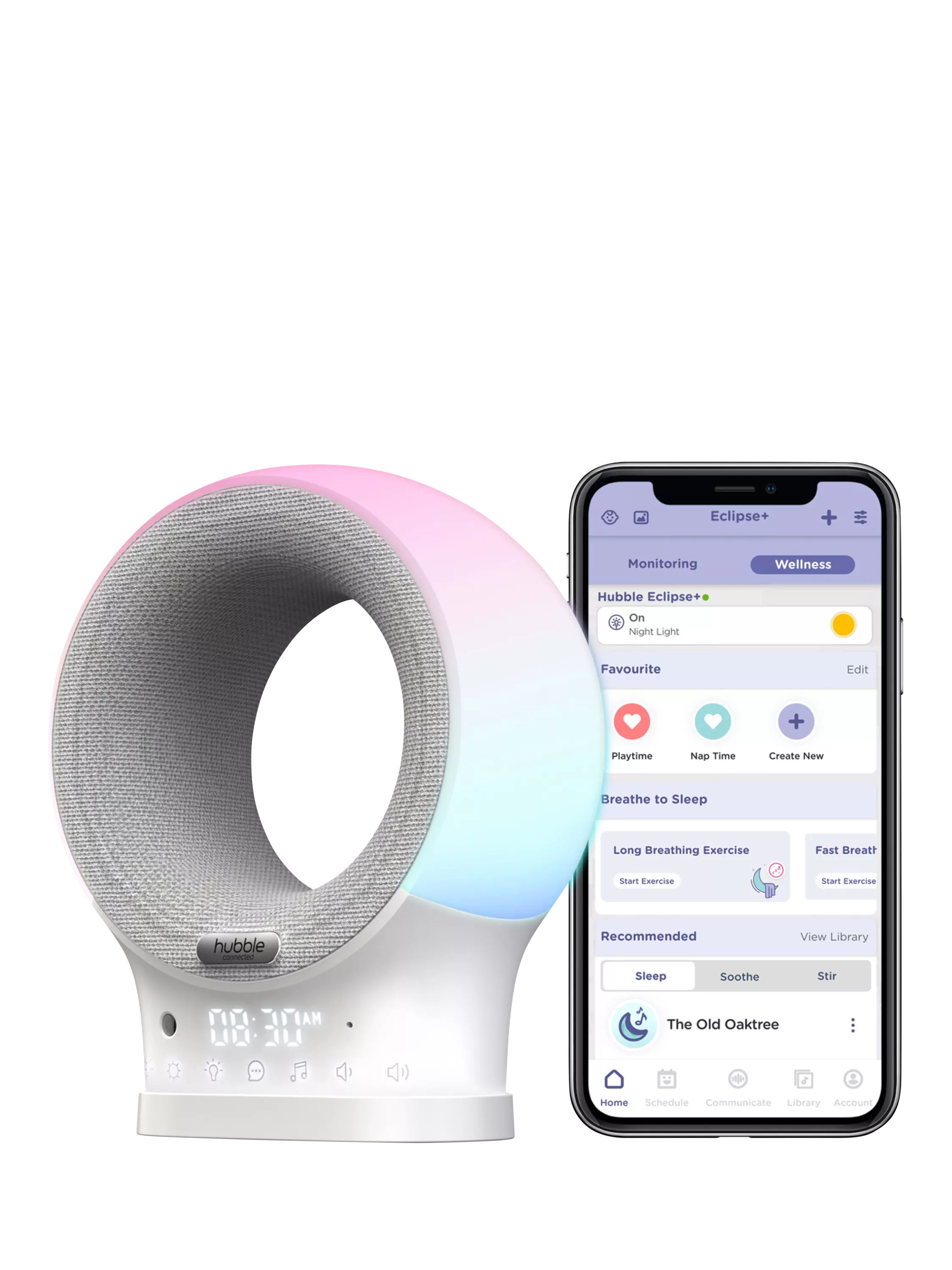 Create the perfect sleep environment for your little one with the Eclipse from Hubble - the Smart Wi-Fi Audio Monitor and Soother with Night Light and Bluetooth Speaker.
