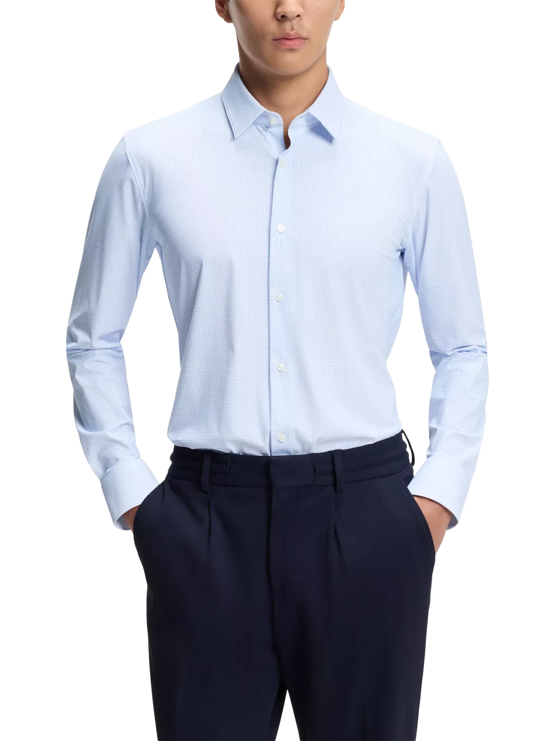 A subtle check pattern joins forces with a stretch-friendly fabric in this shirt, a slim-fitting design that offers both comfort and a welcome confidence boost.