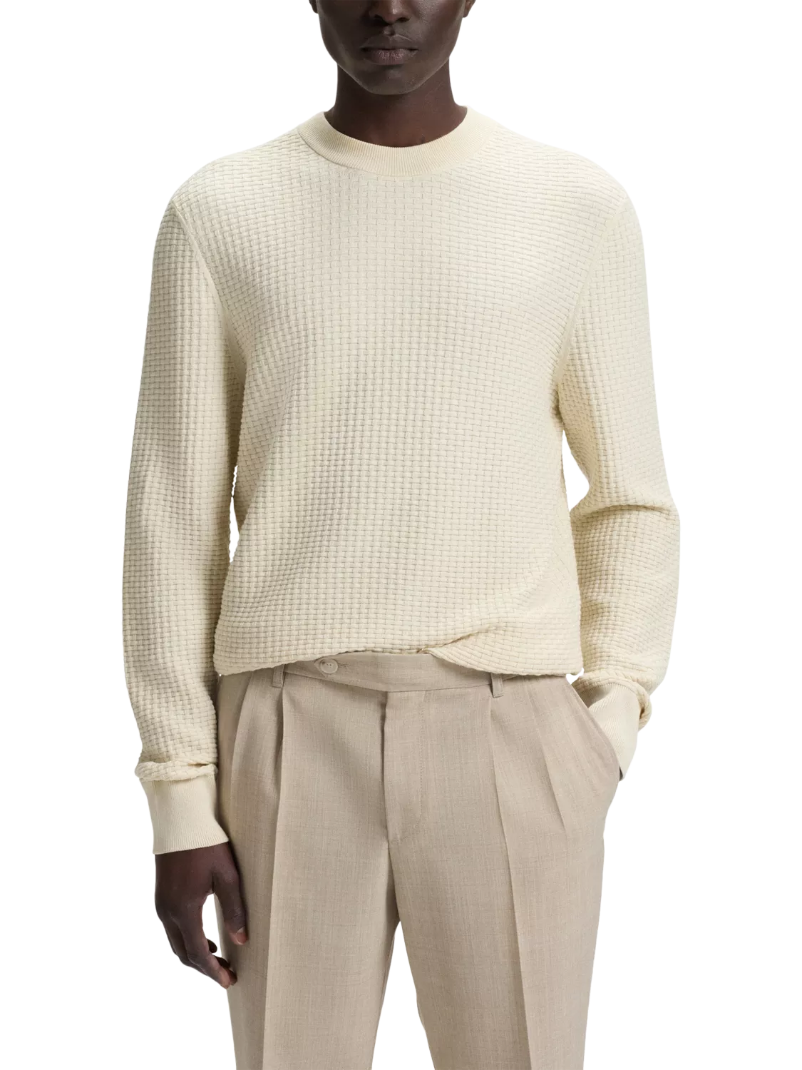 Ribbed detailing at the collar and cuffs lends a touch of sophistication to this textured cotton jumper.