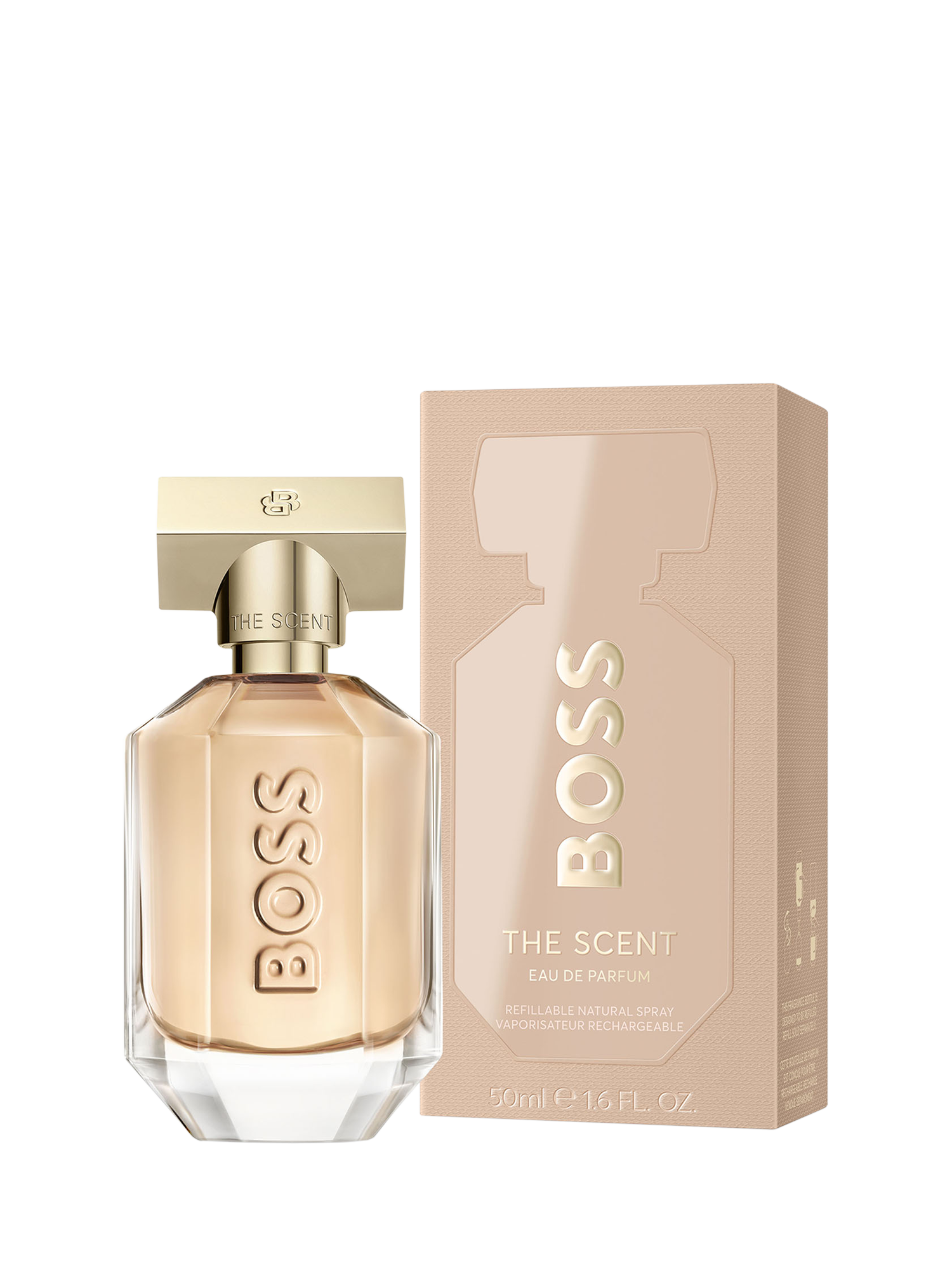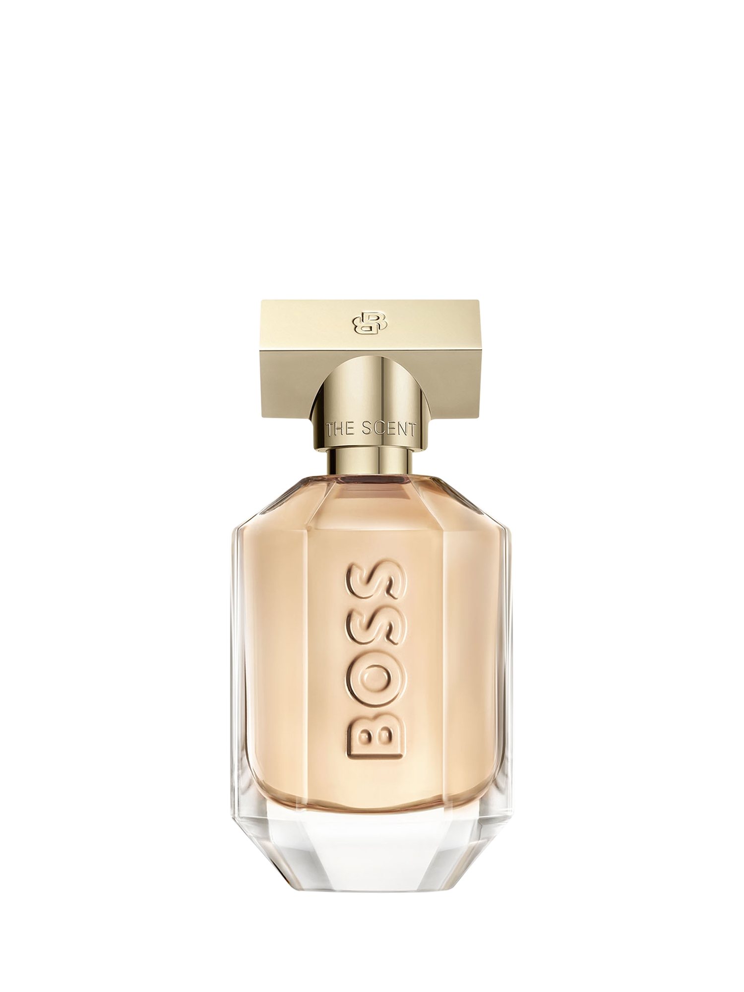 The bottle: BOSS The Scent Eau de Parfum for Women reinvents empowering sensuality in a crystalline, refillable bottle featuring the BOSS logo on translucent glass and a BOSS Double-B monogram icy-gold cap. Capturing the spotlight, its multi-faceted shape reflects the sensorial showdown within this peachy-coloured scent, while echoing the many sides of a power couple.