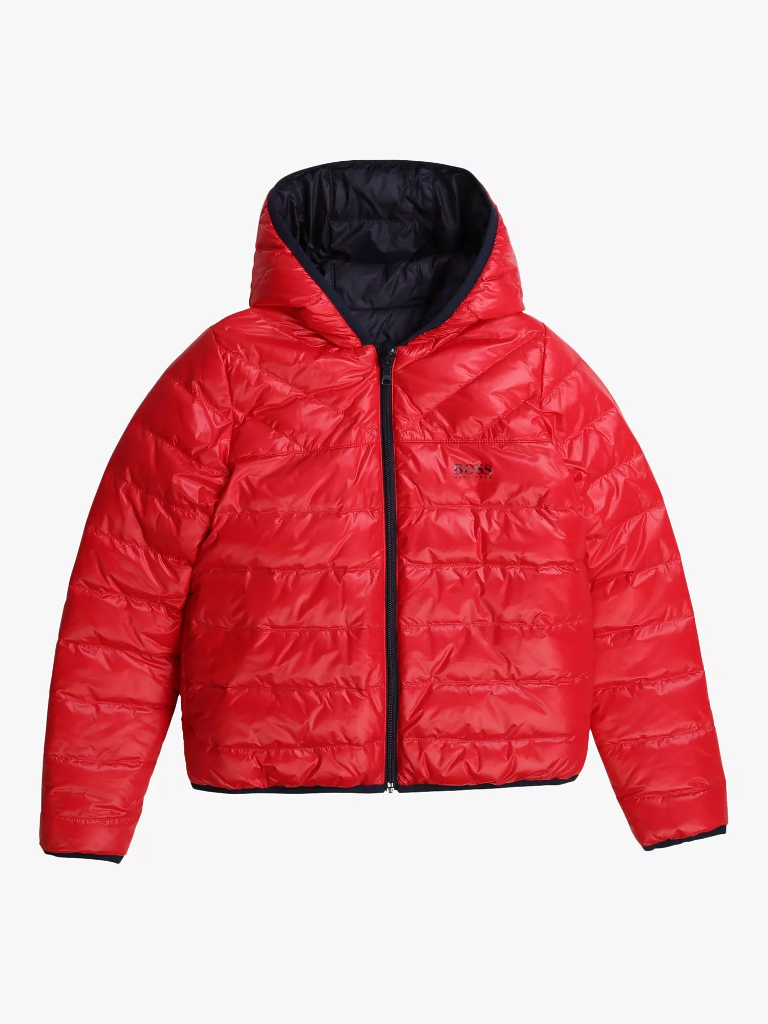 You will love this BOSS hooded down jacket in water-repellent, reversible polyamide. Equipped with a zip and two pockets, it is lined with down and duck feathers to provide superb warmth. One side is solid-coloured and the reverse has an all-over BOSS print.
