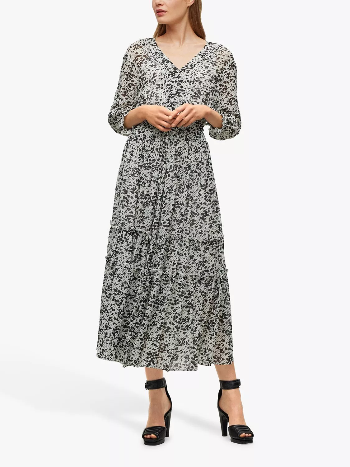 Tiered for a dramatic touch, this midi dress from HUGO BOSS is crafted from an airy viscose fabric. With a fuss-free but smart v-neckline and three quarter length sleeves, this style draws the eye with an abstract print.