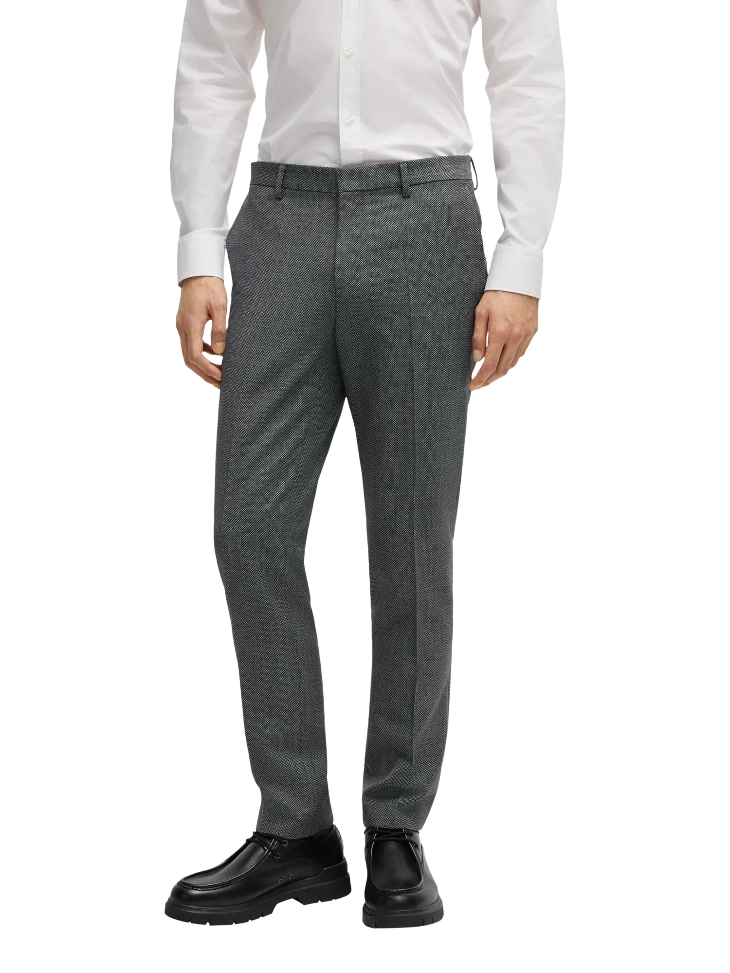 Formal trousers in a slim fit with a hook and zip closure, french side pockets, welt pockets on the back and a waistband with belt loops. Partially lined with an ironed crease and micro pattern with synthetic fibre mix.