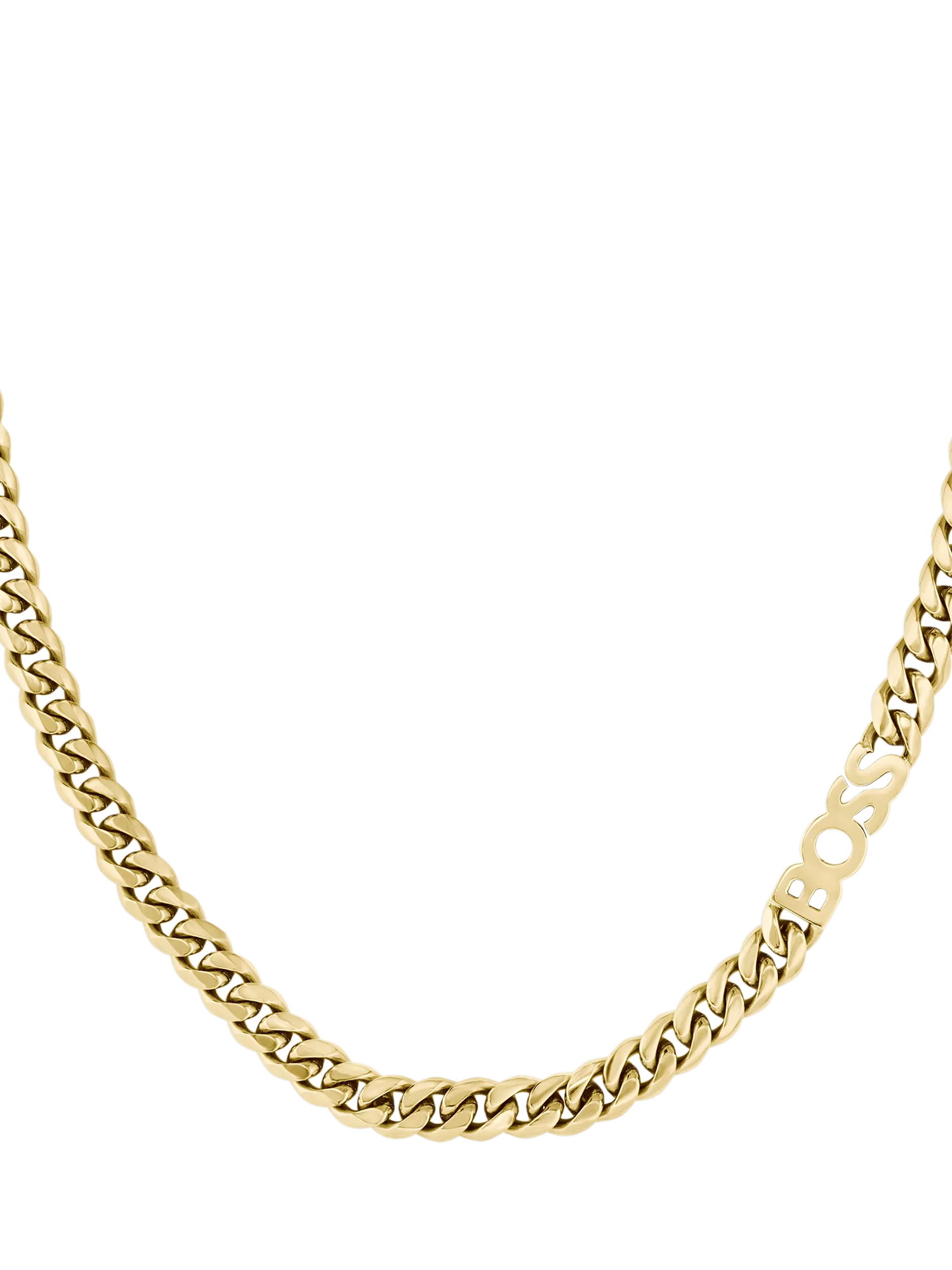 BOSS gents necklace from the Kassy collection. Featuring a light gold IP chain with integrated BOSS branding.