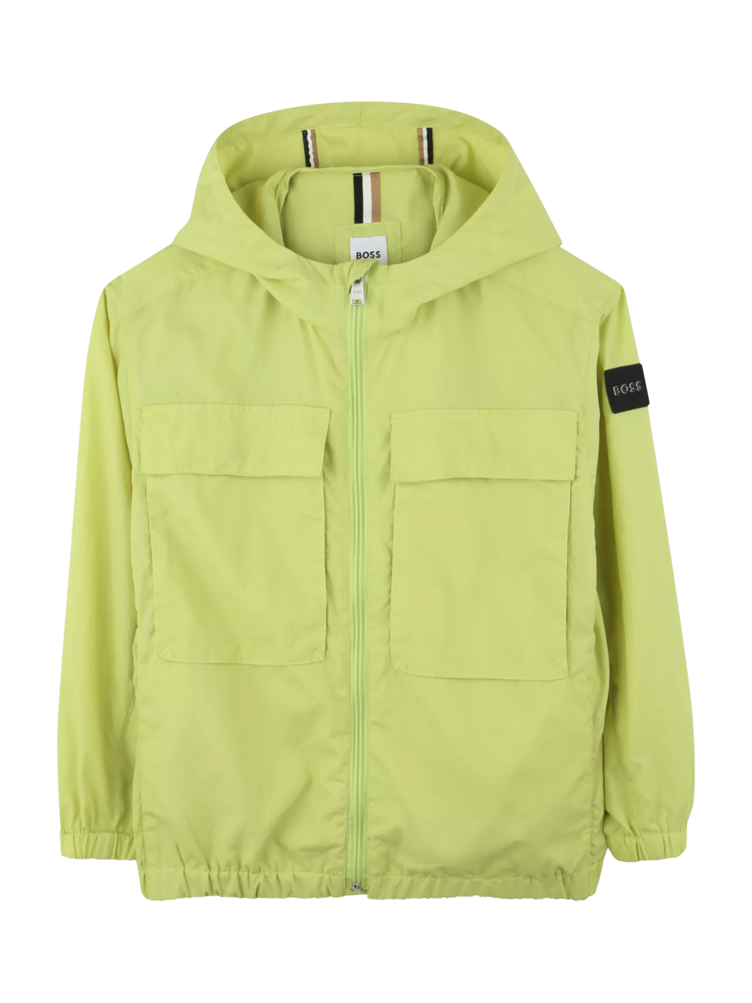 Hooded windbreaker in 100% polyamide crinkled material, three-color braids inside the hood, 2 front flap pockets, logo badge on the shoulder, three-color woven label on the back.