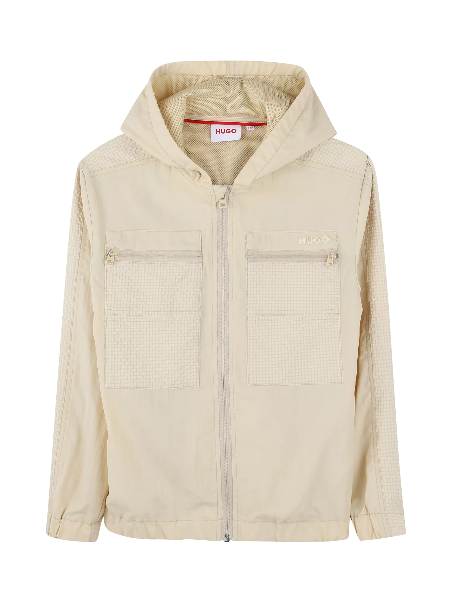 Zip-up windbreaker jacket with a hood, mesh lining, zip chest pockets and elasticated cuffs and hem. Finished with high density logo printed on the chest and at the back.