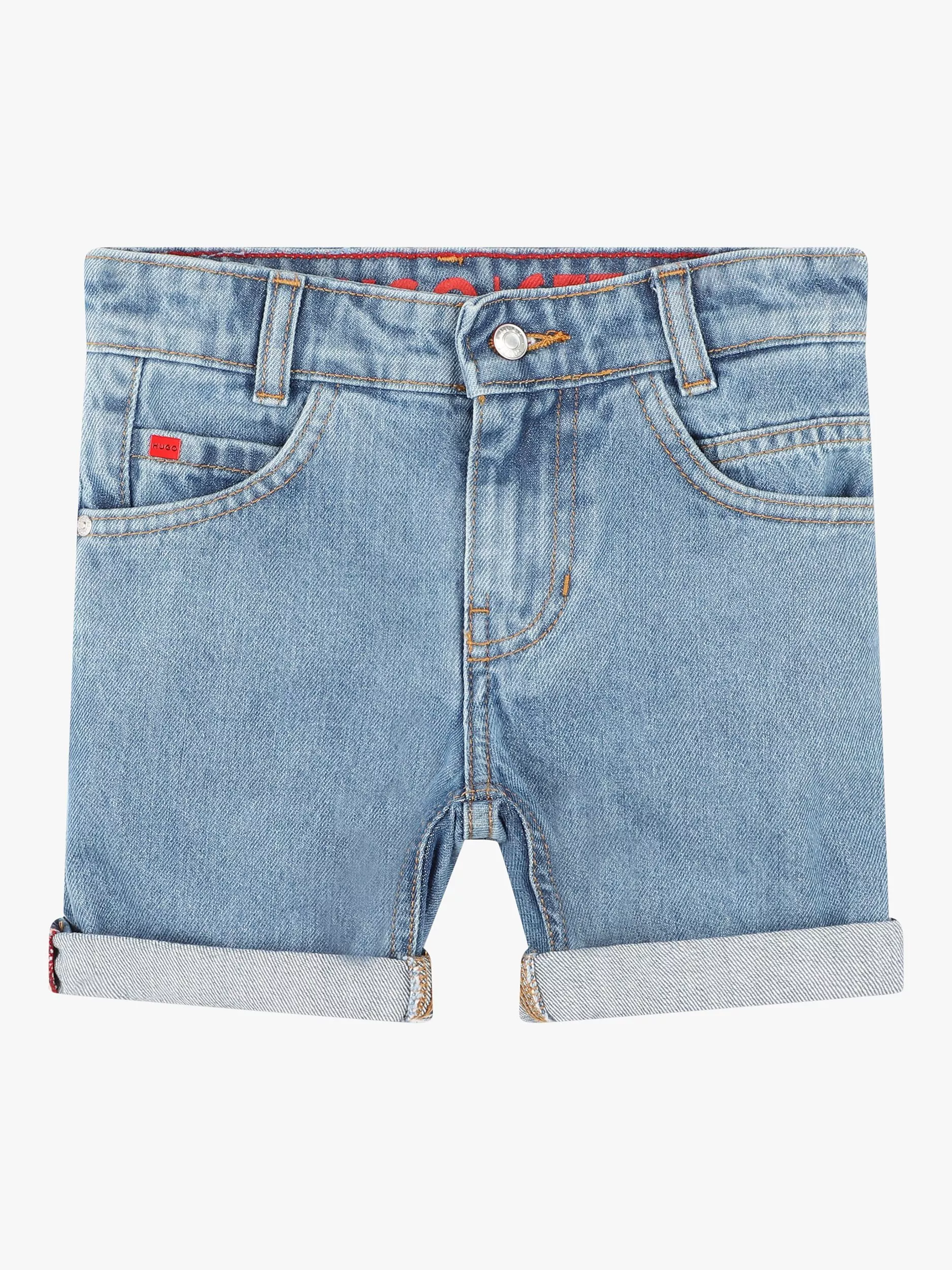 Classic five-pocket-style denim shorts made of 100% cotton. A regular fit, completed with a metal branded tag on the ticket pocket and a branded HUGO rubber label at the back.