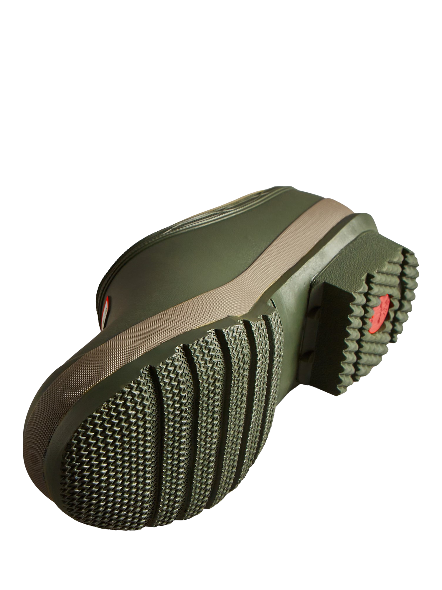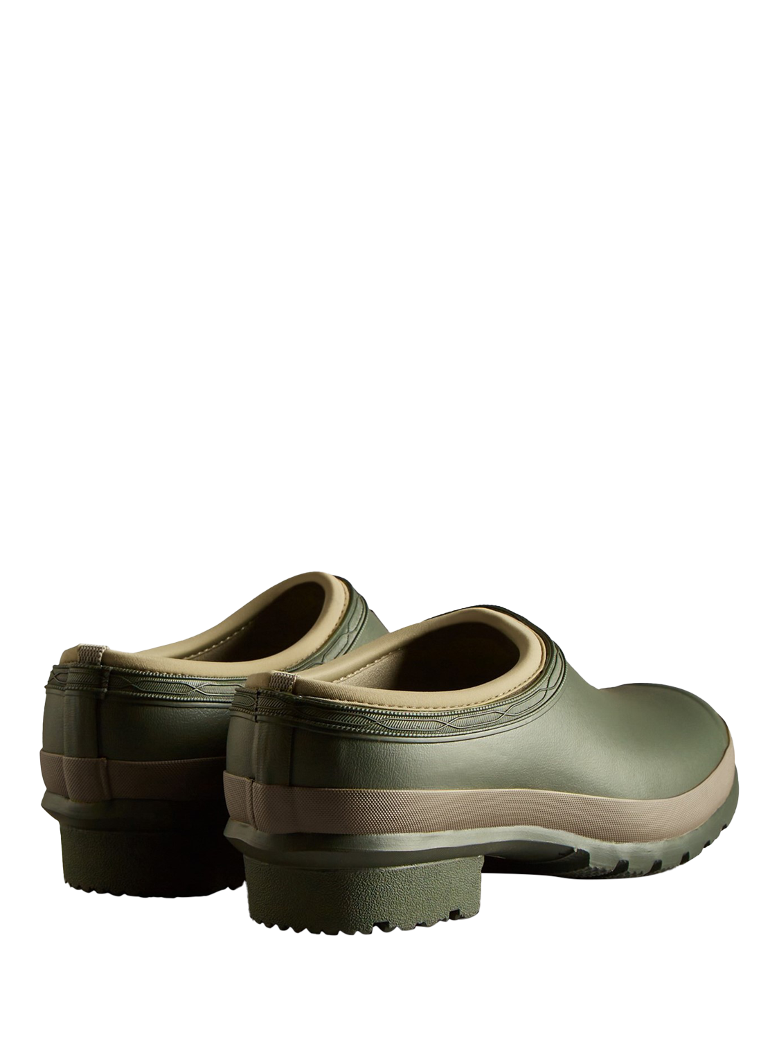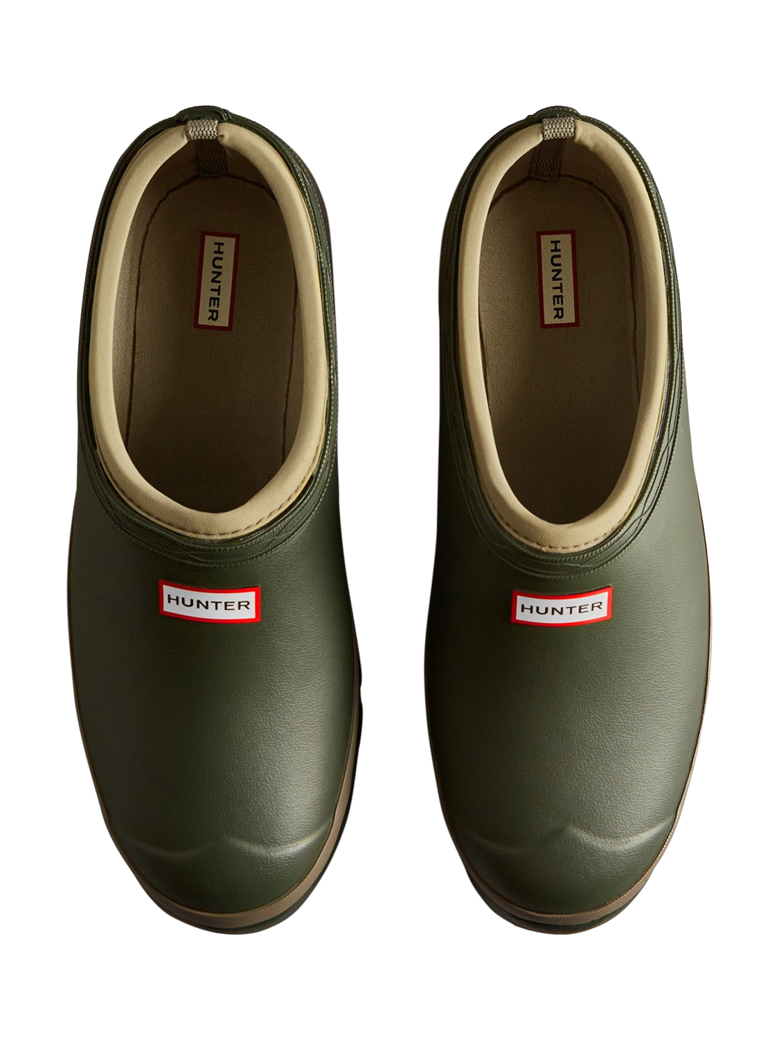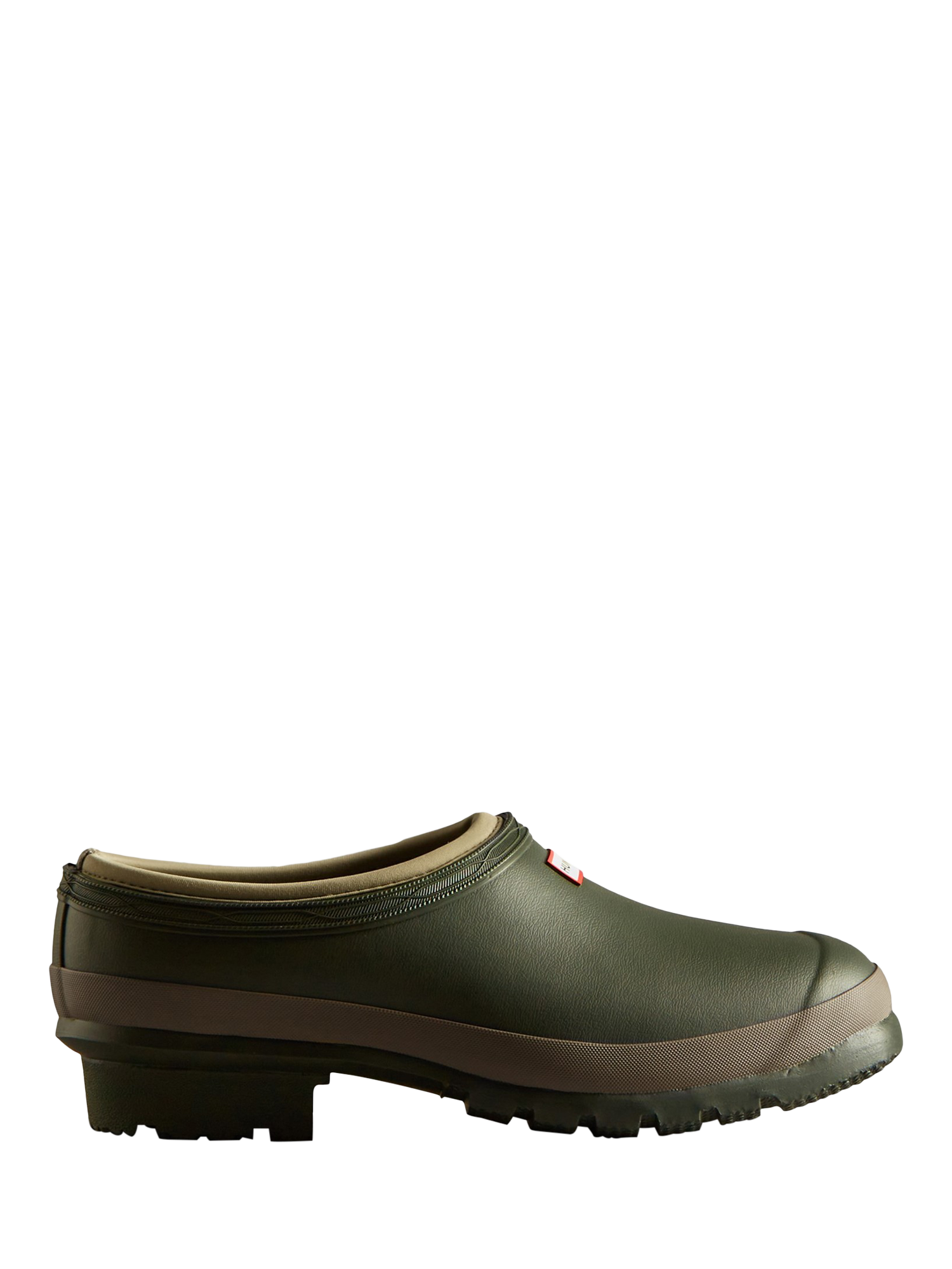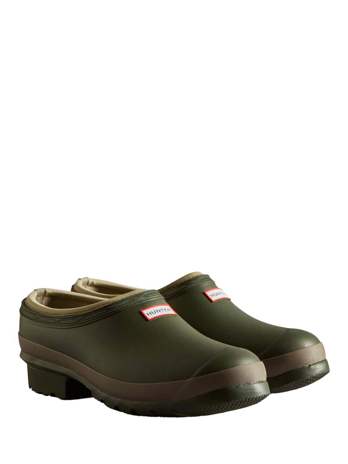 A dark green slip-on shoe from Hunter handcrafted from waterproof vegan rubber, designed for gardening. Updated with the iconic red box logo, the clog has a flexible natural rubber form and Hunter's signature tread providing grip.