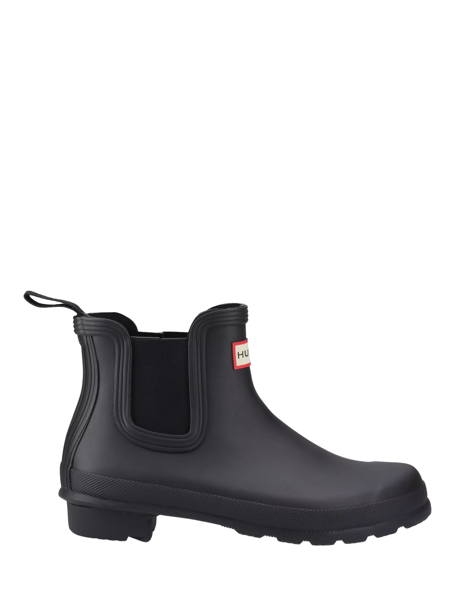 Twin side gusset. Rear pull-on loop. Hunter logo on face. Polyester lining. Rubber outsole with Hunter Original tread pattern. Elastic side gussets and nylon pull-tab. Crafted from natural vulcanised rubber with a matte finish.