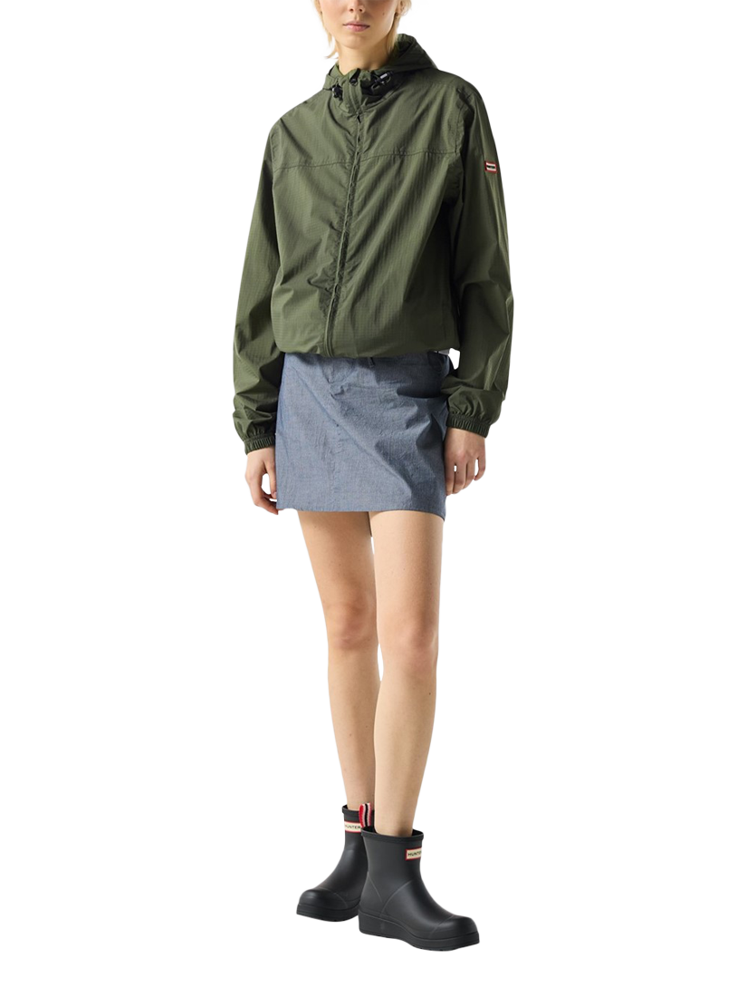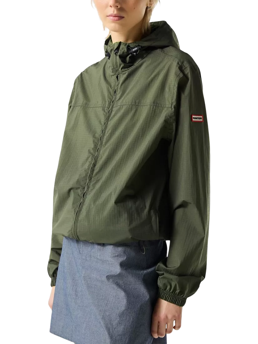 The ultimate rainy-day accessory, this lightweight unisex black rain jacket is water-resistant.. Side snap closures and a hood with an adjustable drawstring offer extra protection, whilst being able to be packed into an attached bag. Fashioned with our Hunter silicon badge, this rain jacket is easy to wear and perfect for festival fields or everyday city adventures.