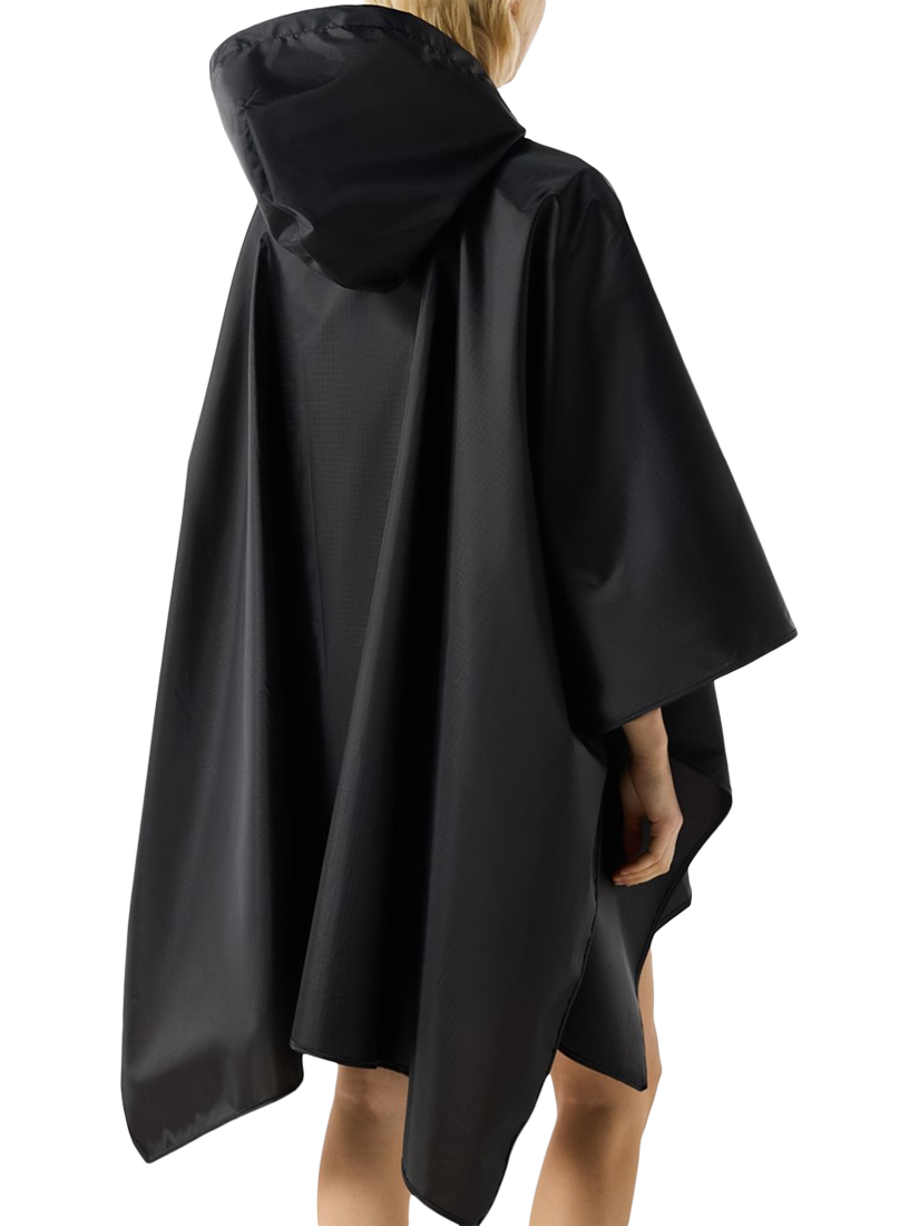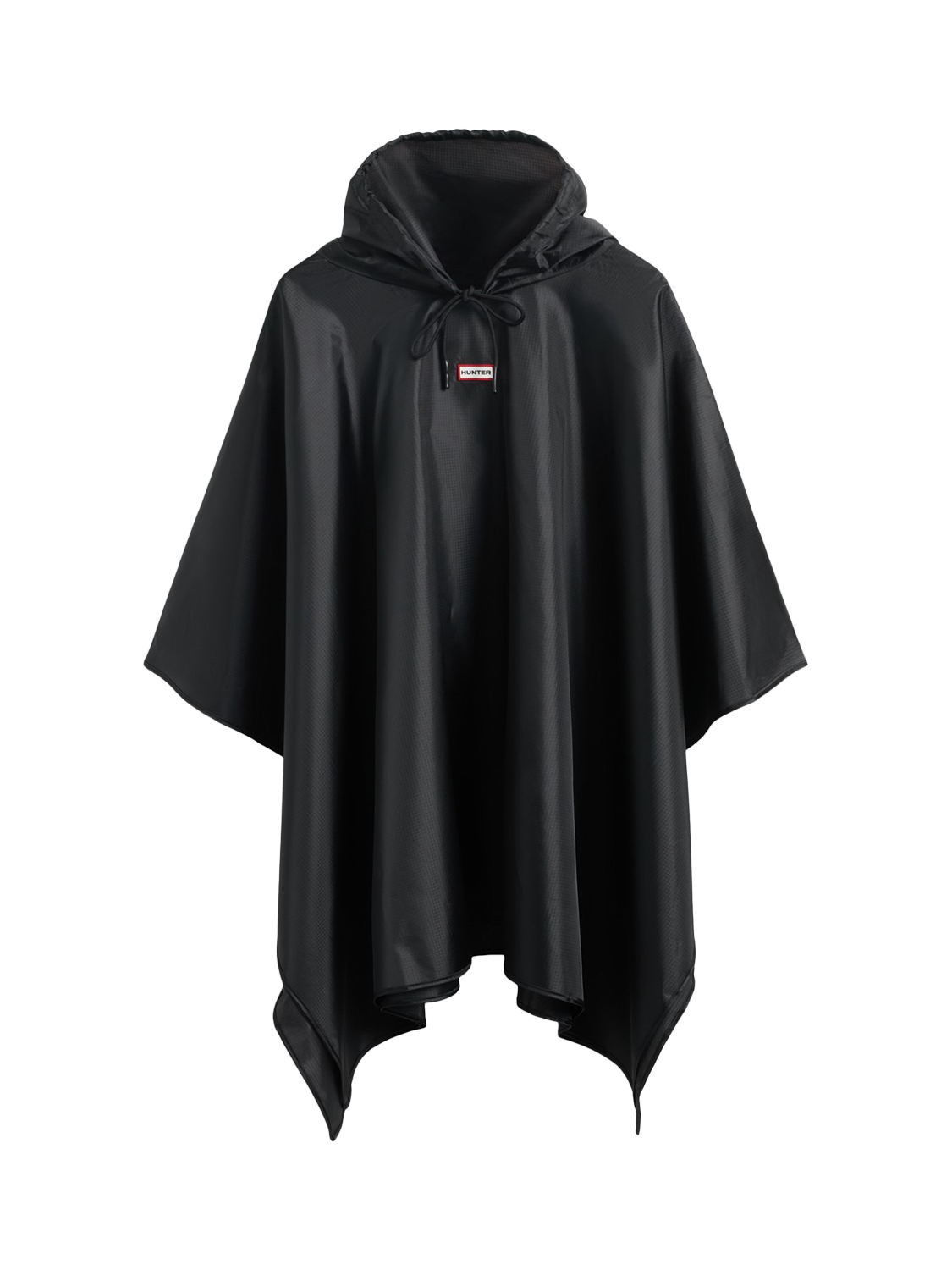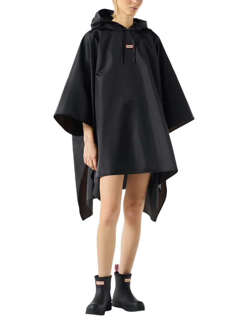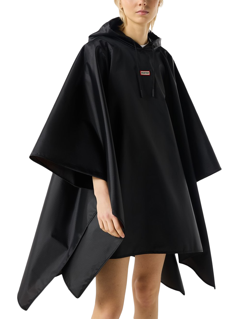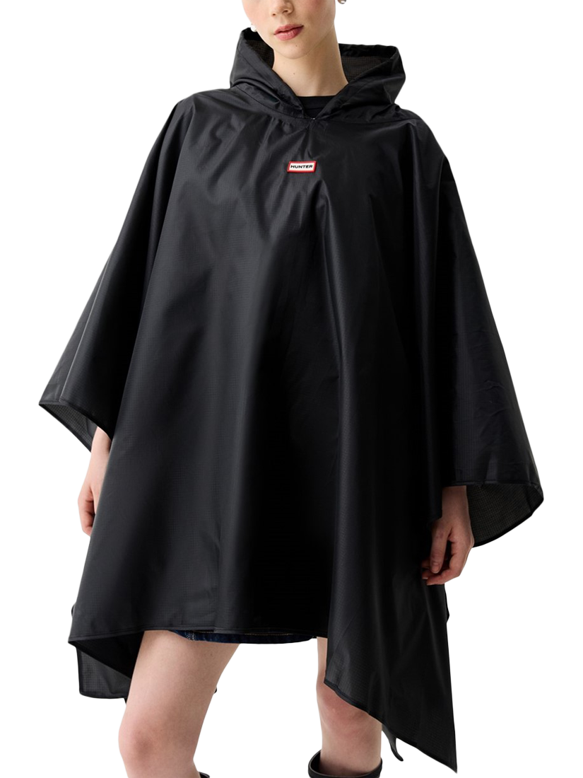 The ultimate rainy-day accessory, this lightweight unisex black poncho is water-resistant.. True to size, Unisex fit. Side snap closures and a hood with an adjustable drawstring offer extra protection, whilst being able to be packed into an attached bag.. Fashioned with our Hunter silicon badge, this poncho is easy to wear and perfect for festival fields or everyday city adventures.
