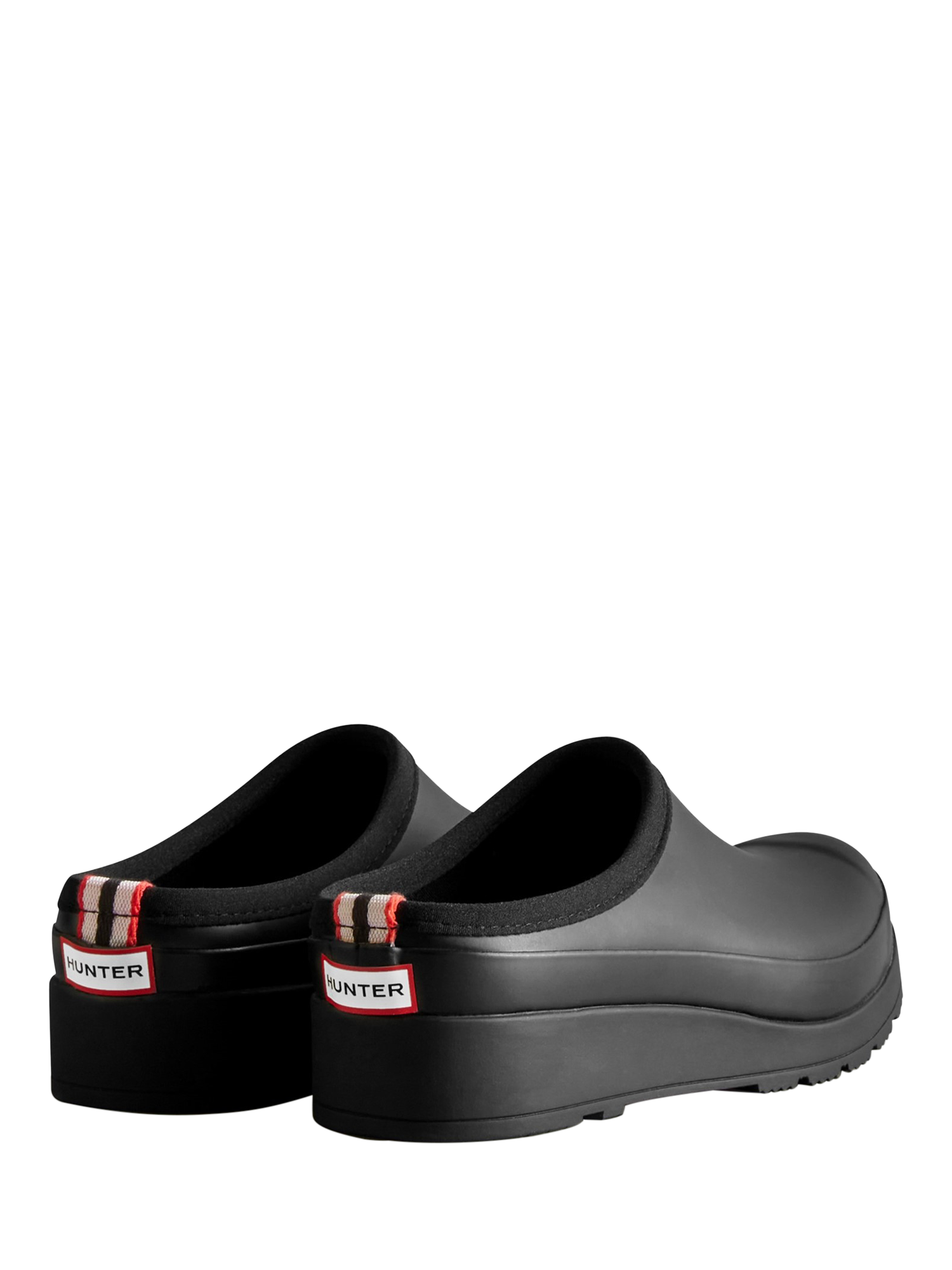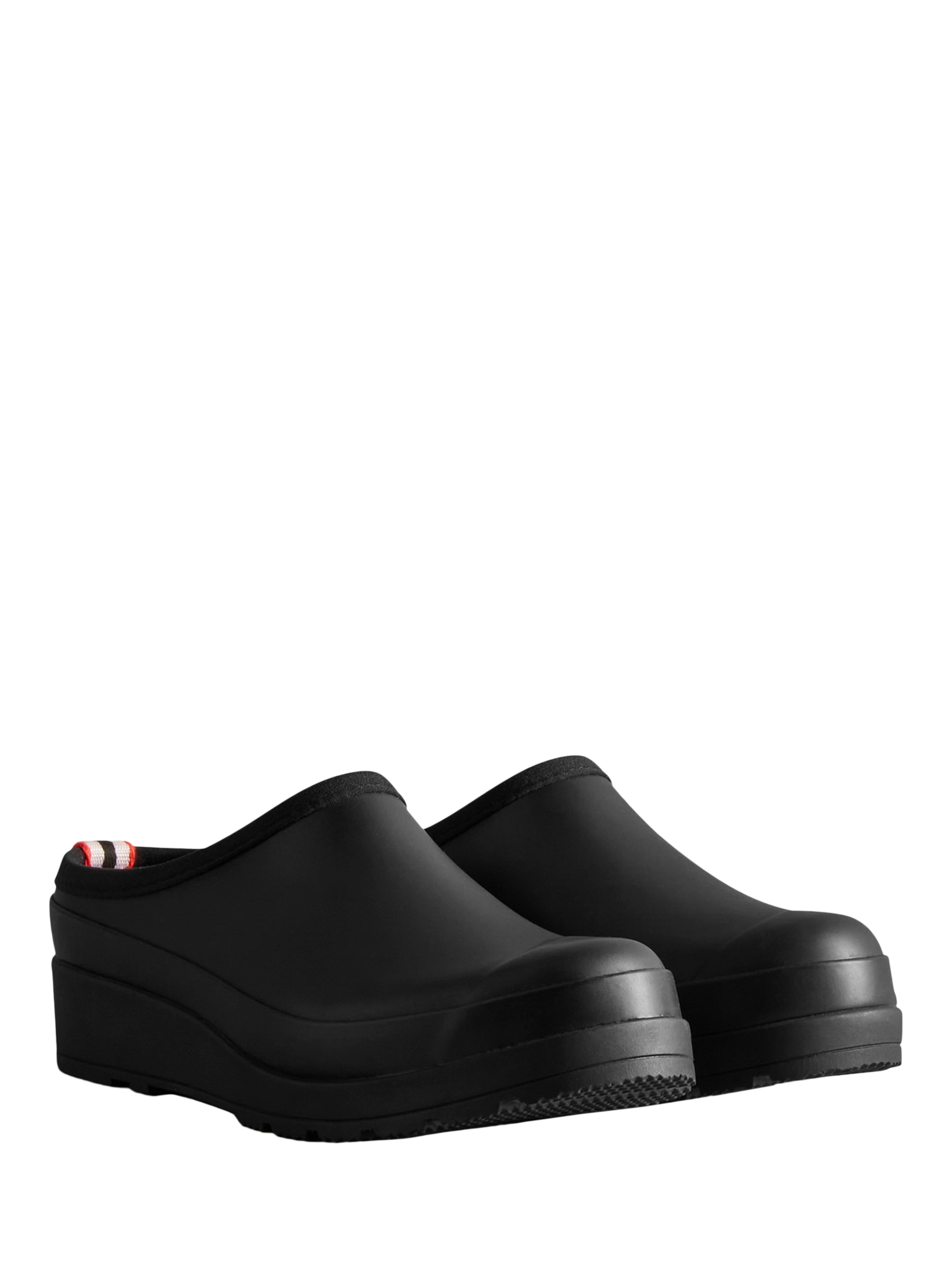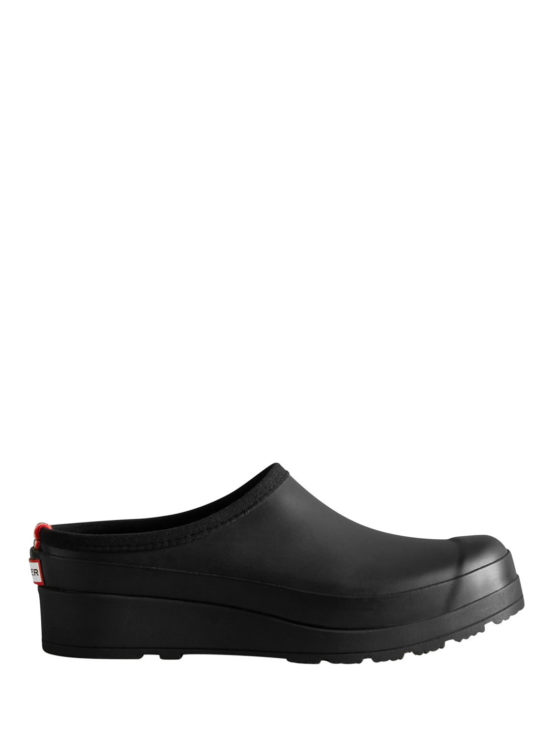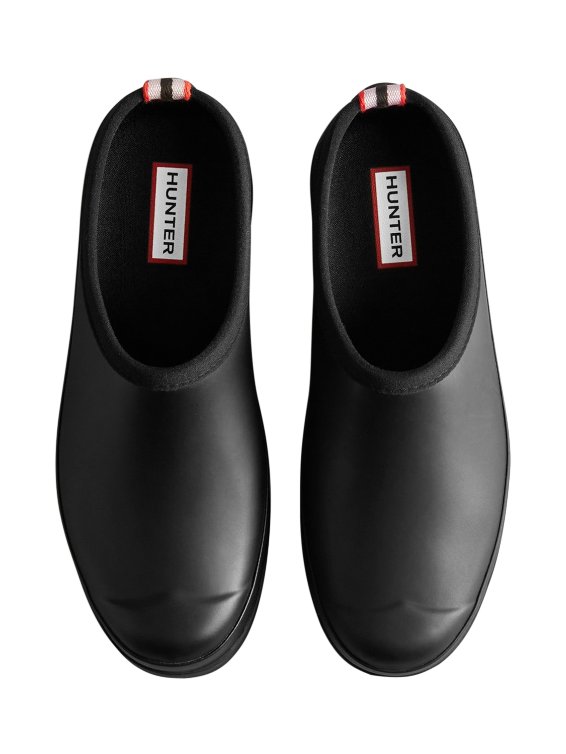 100% waterproof engineered with over 160-years of Hunter's all-weather intelligence. Matte-finished welly clog with a streamlined silhouette. Vegan friendly. Waterproof. Handcrafted. Recycled polyester lining. Slip on style. Engineered for a lghtweigh feel. Hunter branded outsole. Signature Play webbing detail on back heel.