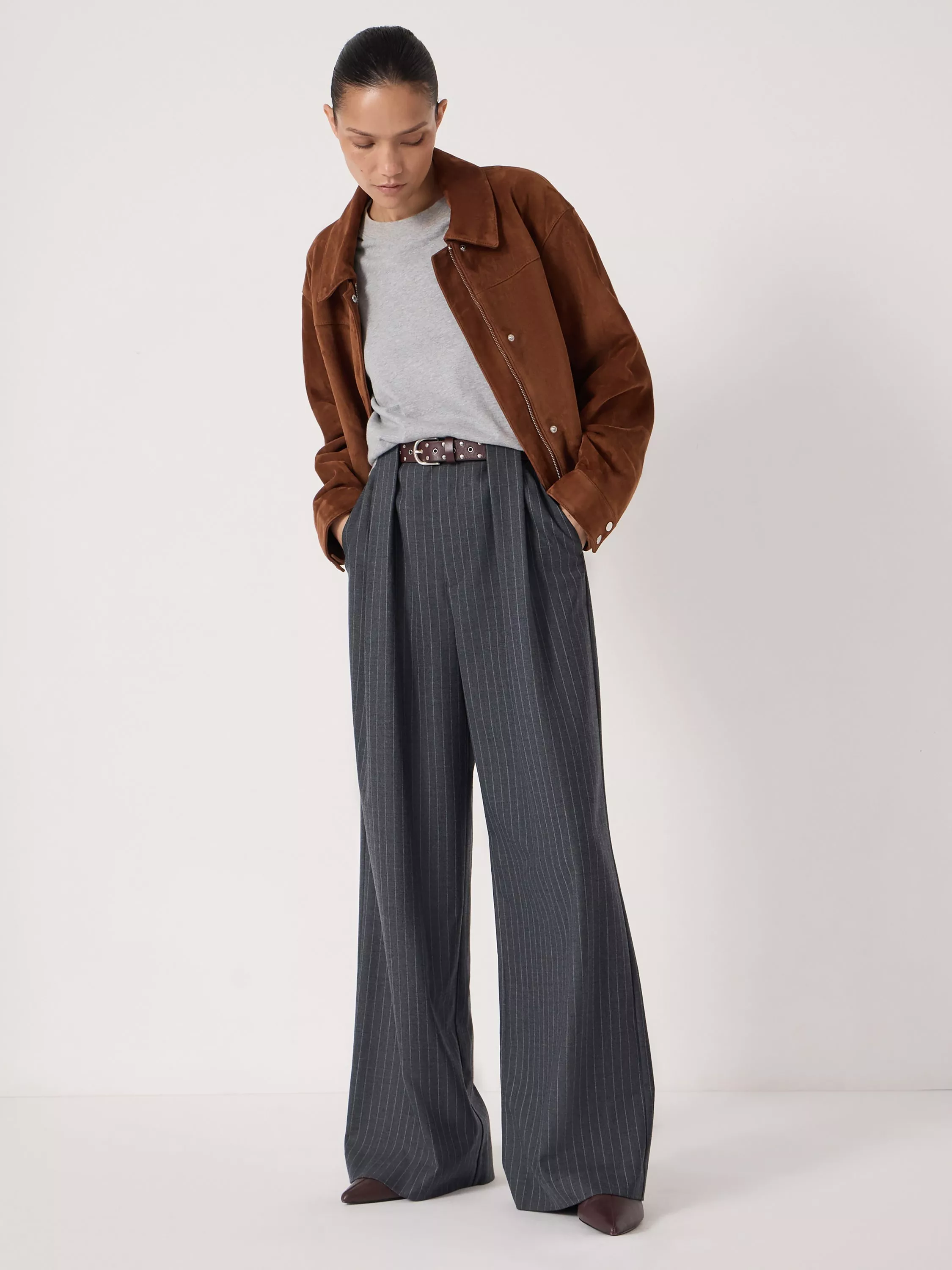 Made from a durable wool blend, these trousers from HUSH sit mid rise with a zip fly, stripes and hems that are fall past the ankle.
