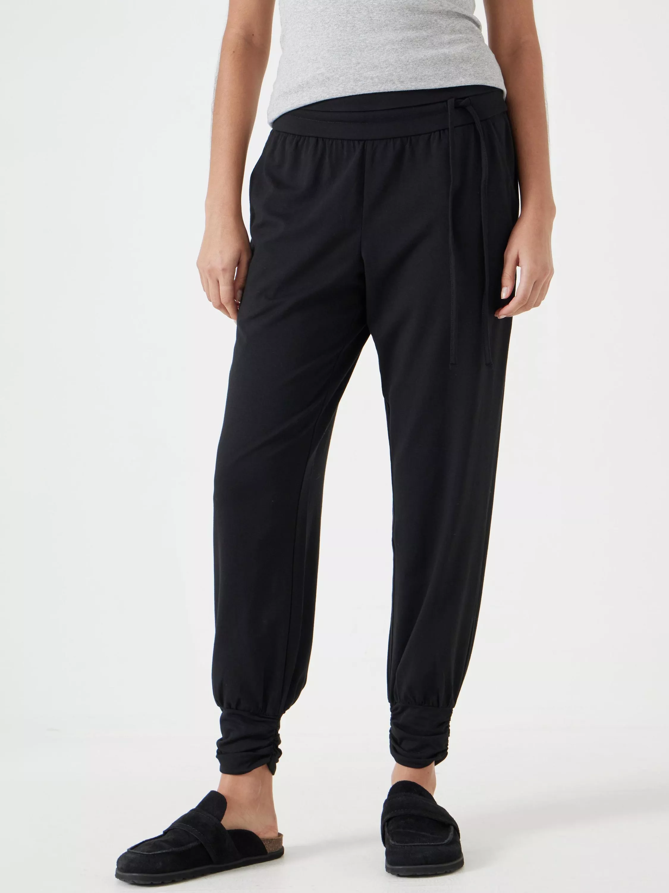 Pairing comfort with style, these trousers are crafted from a soft stretchy fabric with a wide fold over waistband, side pockets and ruched cuffs. An internal drawcord secures the cosy design. Pair with a denim jacket over a cotton tee and add high top flatforms for a fashion-forward finish.
