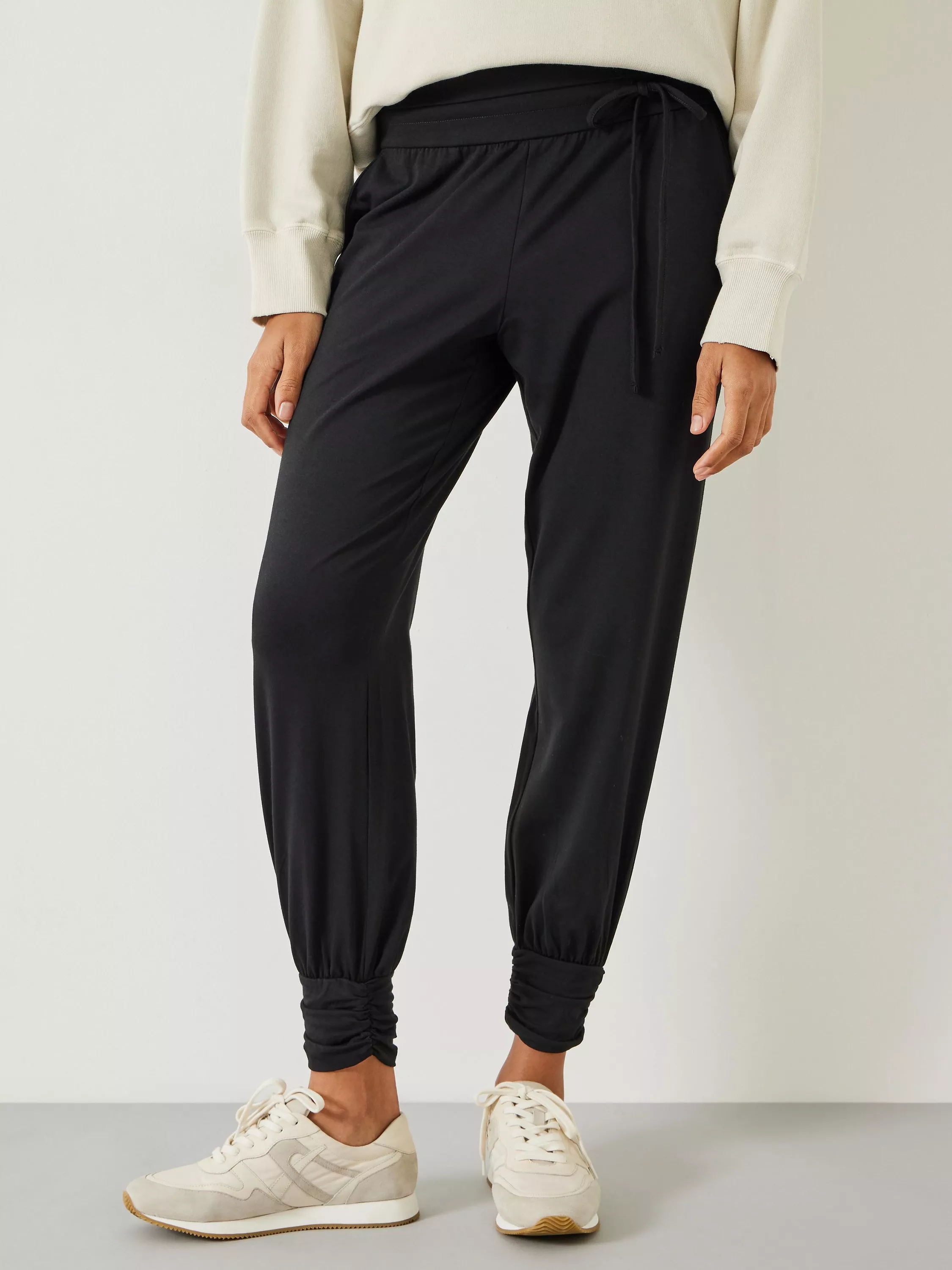 Pairing comfort with style, these trousers are crafted from a soft stretchy fabric with a wide fold over waistband, side pockets and ruched cuffs. An internal drawcord secures the cosy design. Pair with a denim jacket over a cotton tee and add high top flatforms for a fashion-forward finish.