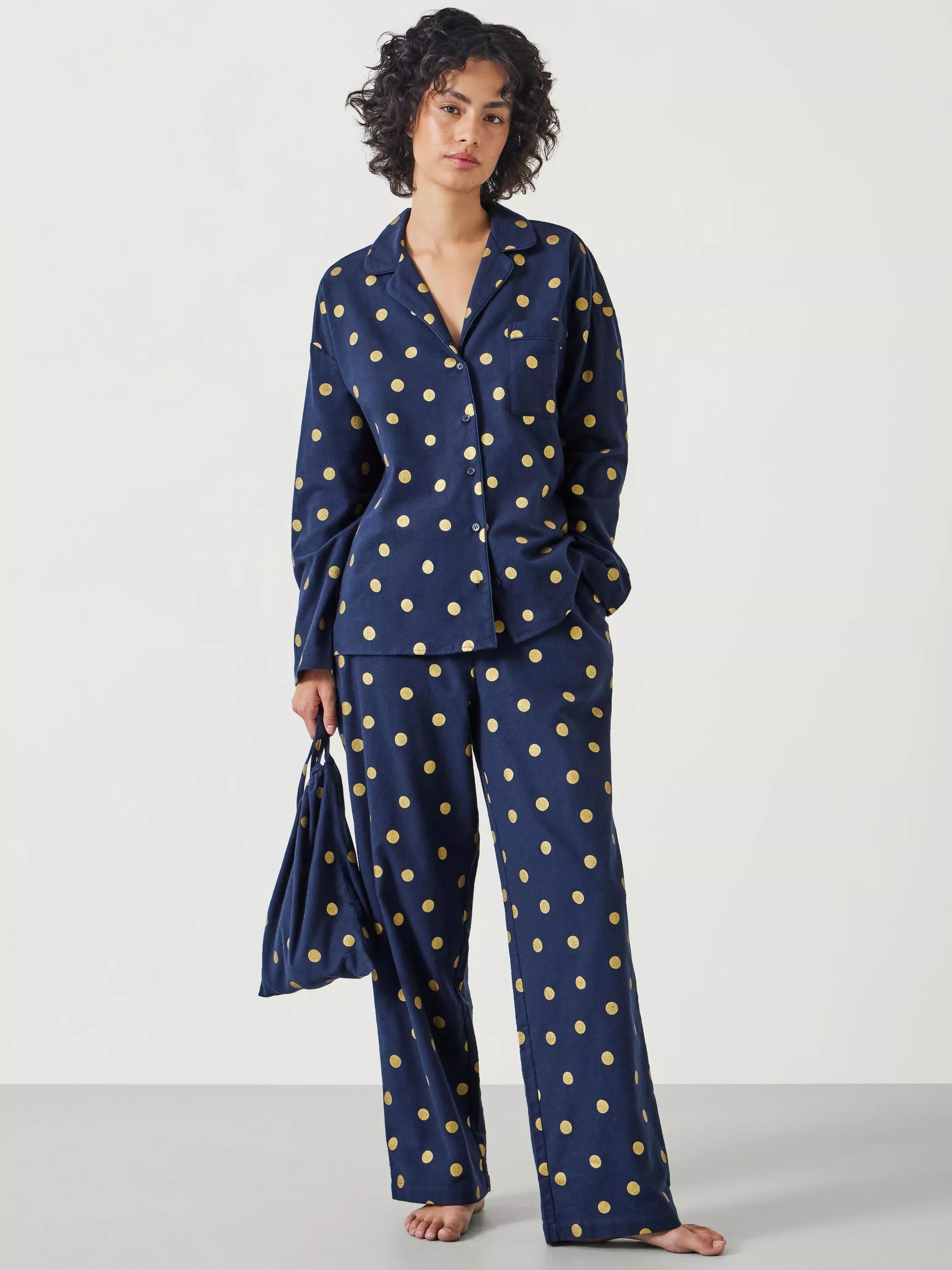 Nothing beats pulling on a pair of Amita pyjamas after a long hard day. This stylish sleepwear set is a bestseller season after season, and this time round we've updated the fabric in soft cotton-blend flannel to make them cosier than ever. We've even created a travel bag in the same polka dot fabric so they always stay organised, whether we're home or away.