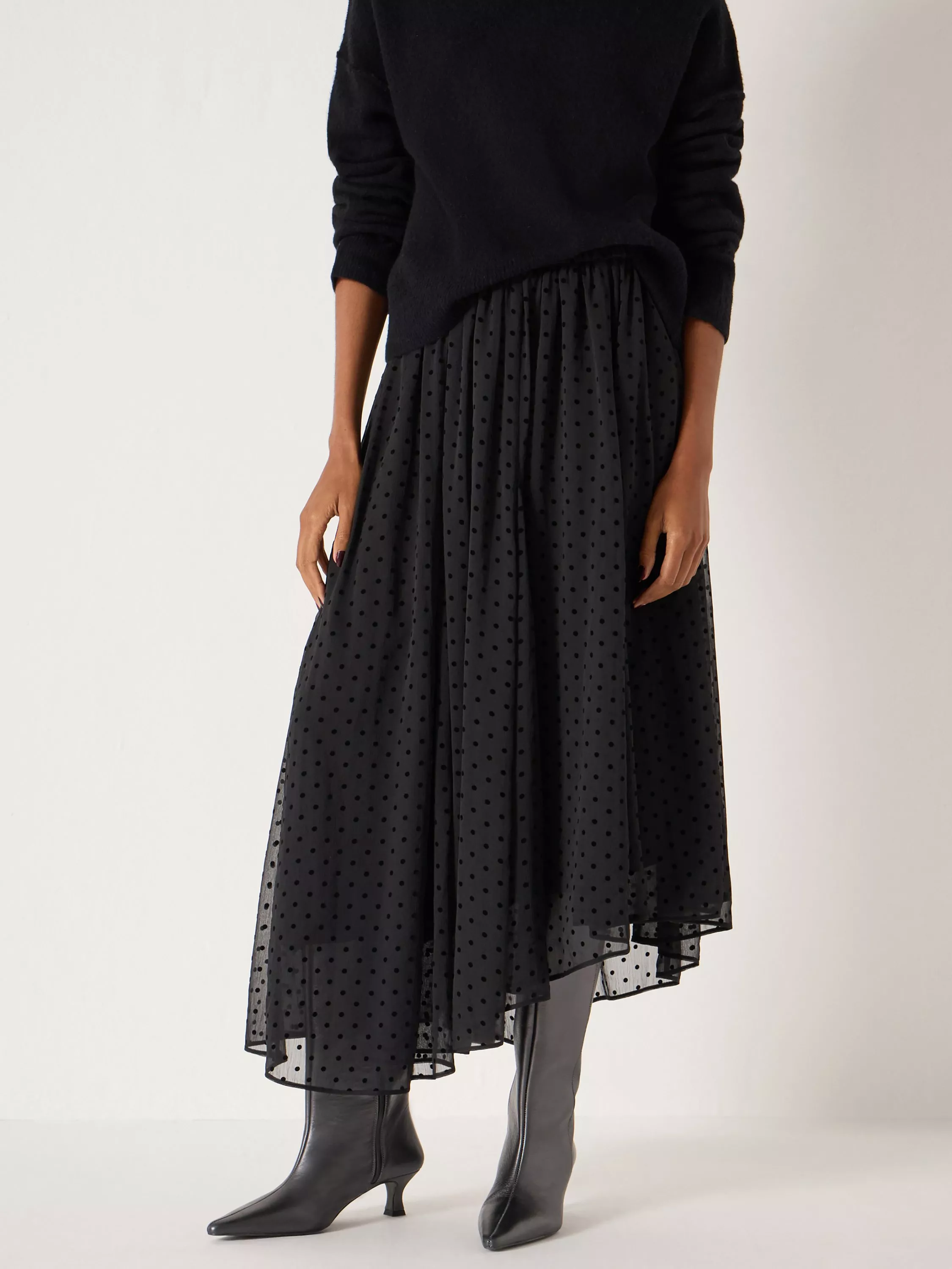 Asymmetrical at the hem for a modern feel, this skirt from HUSH is accented with subtle spots and secured by a zip closure.