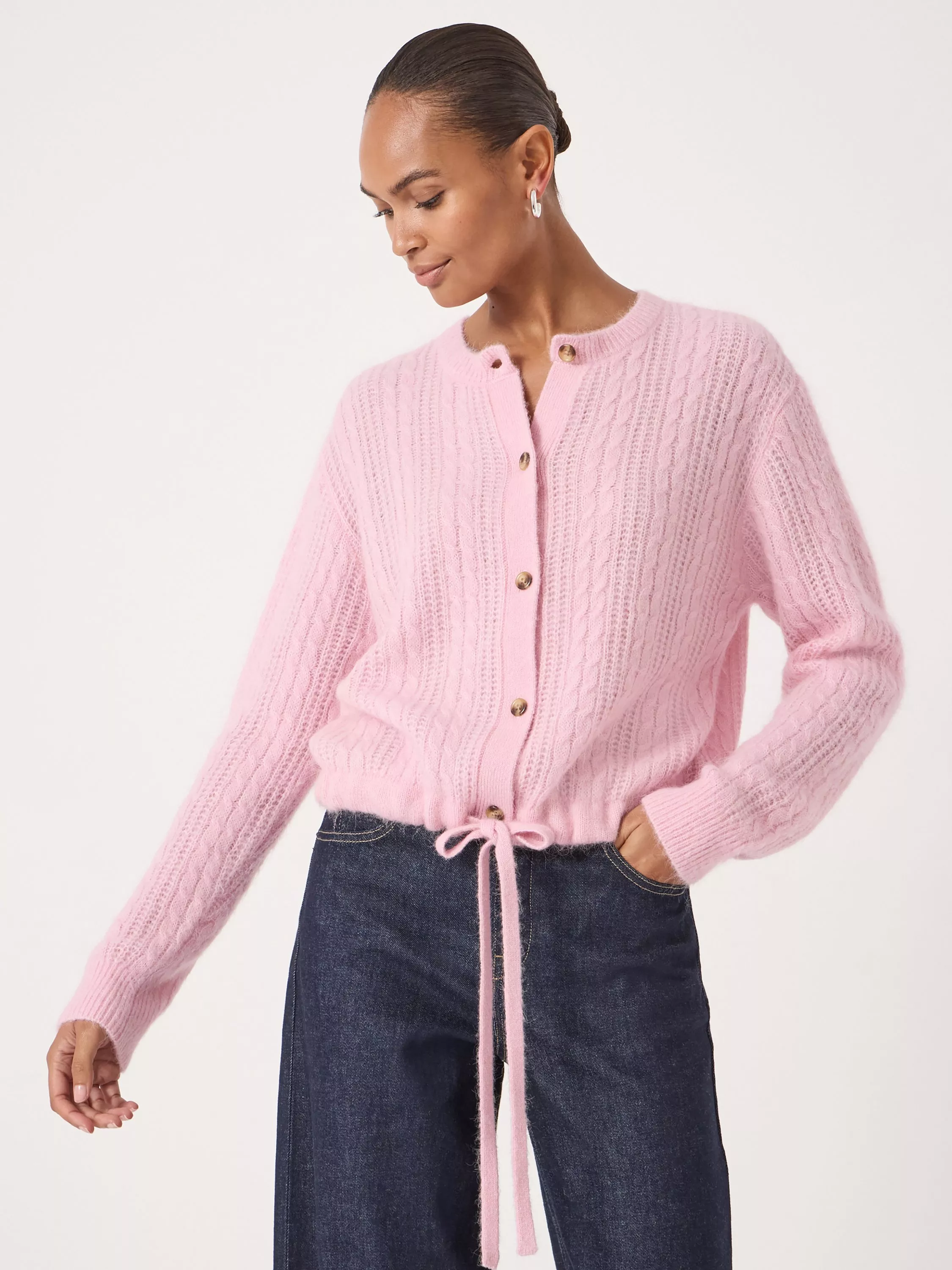 Shaped with a crew neckline and long sleeves, this drawstring cable knit cardigan from HUSH has cosy covered in a warming woollen blend.
