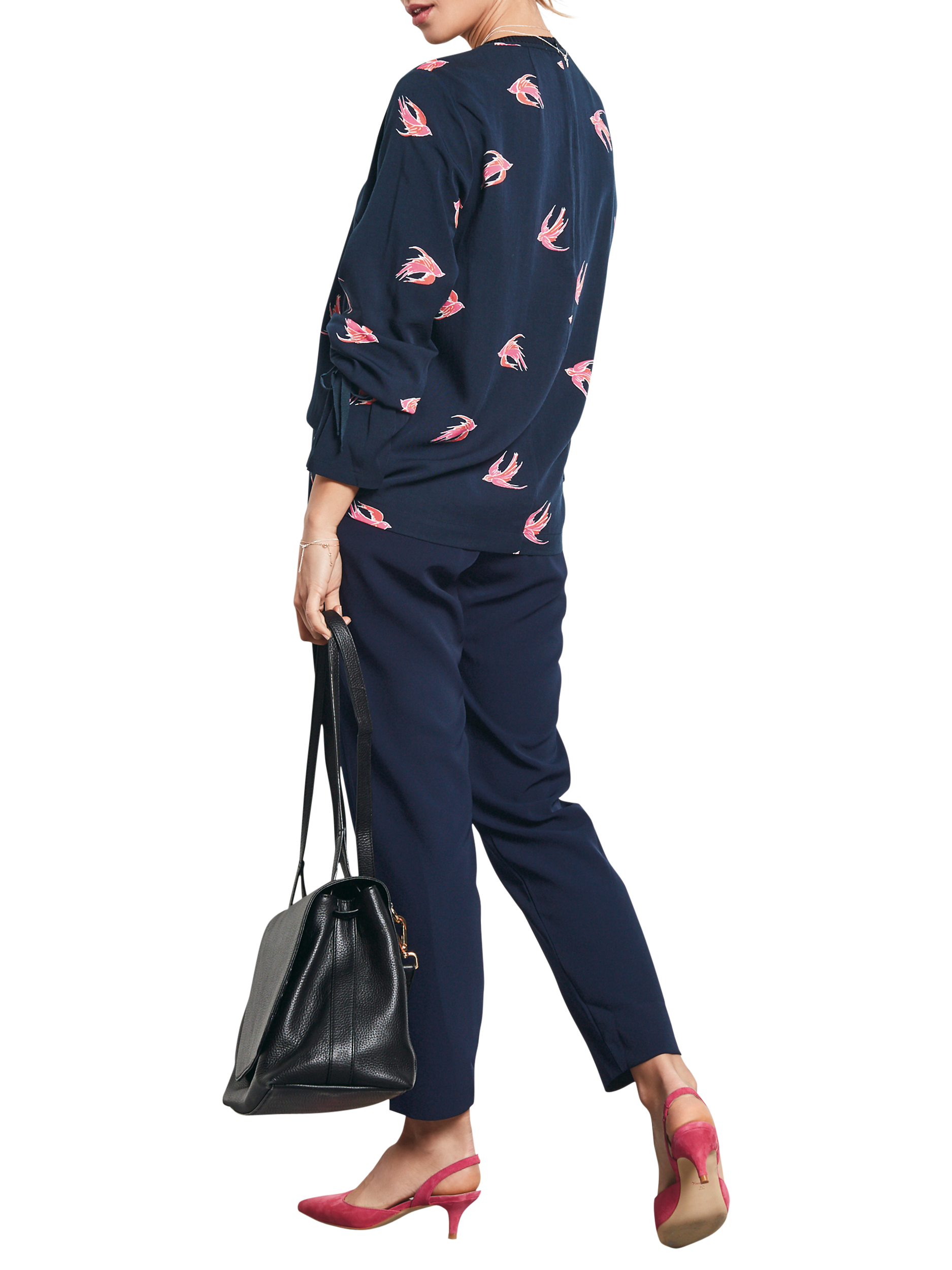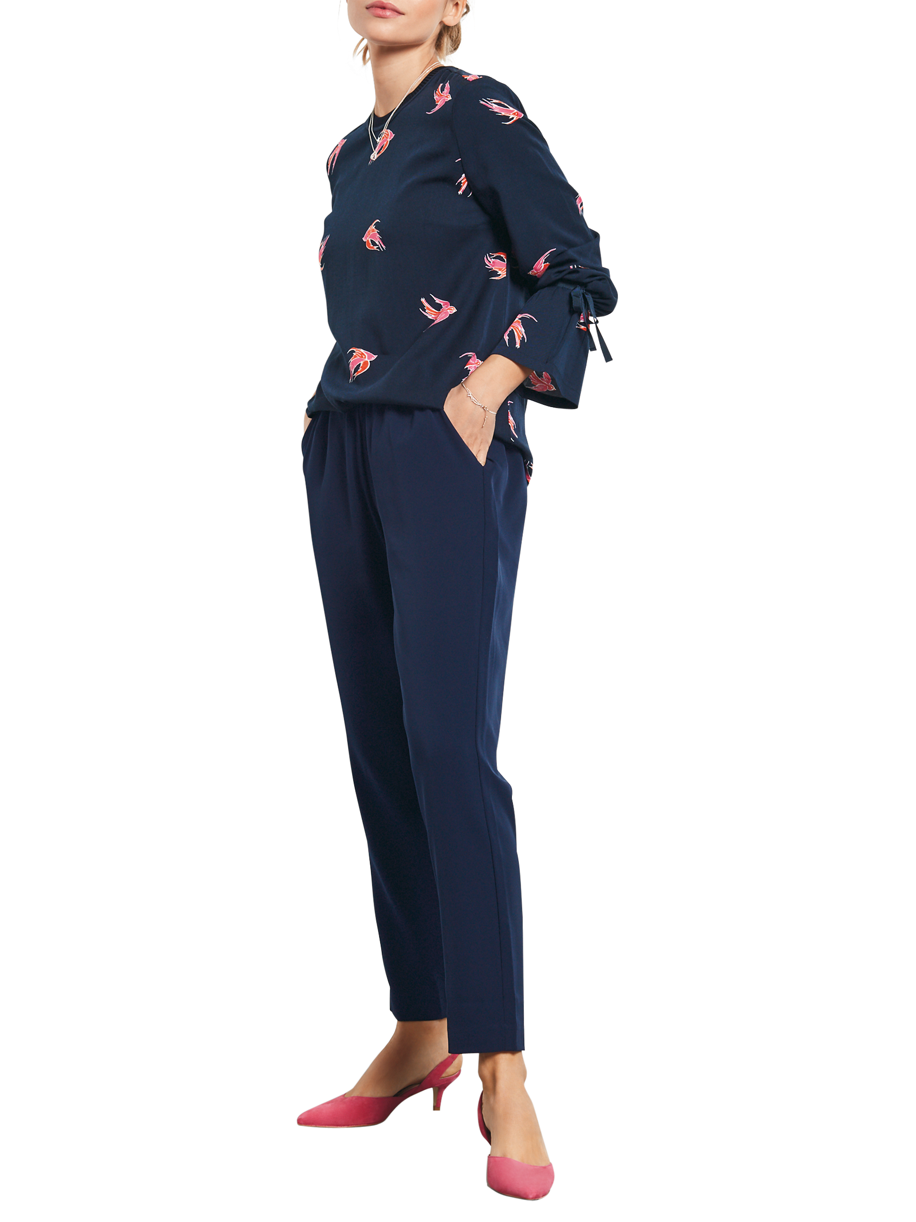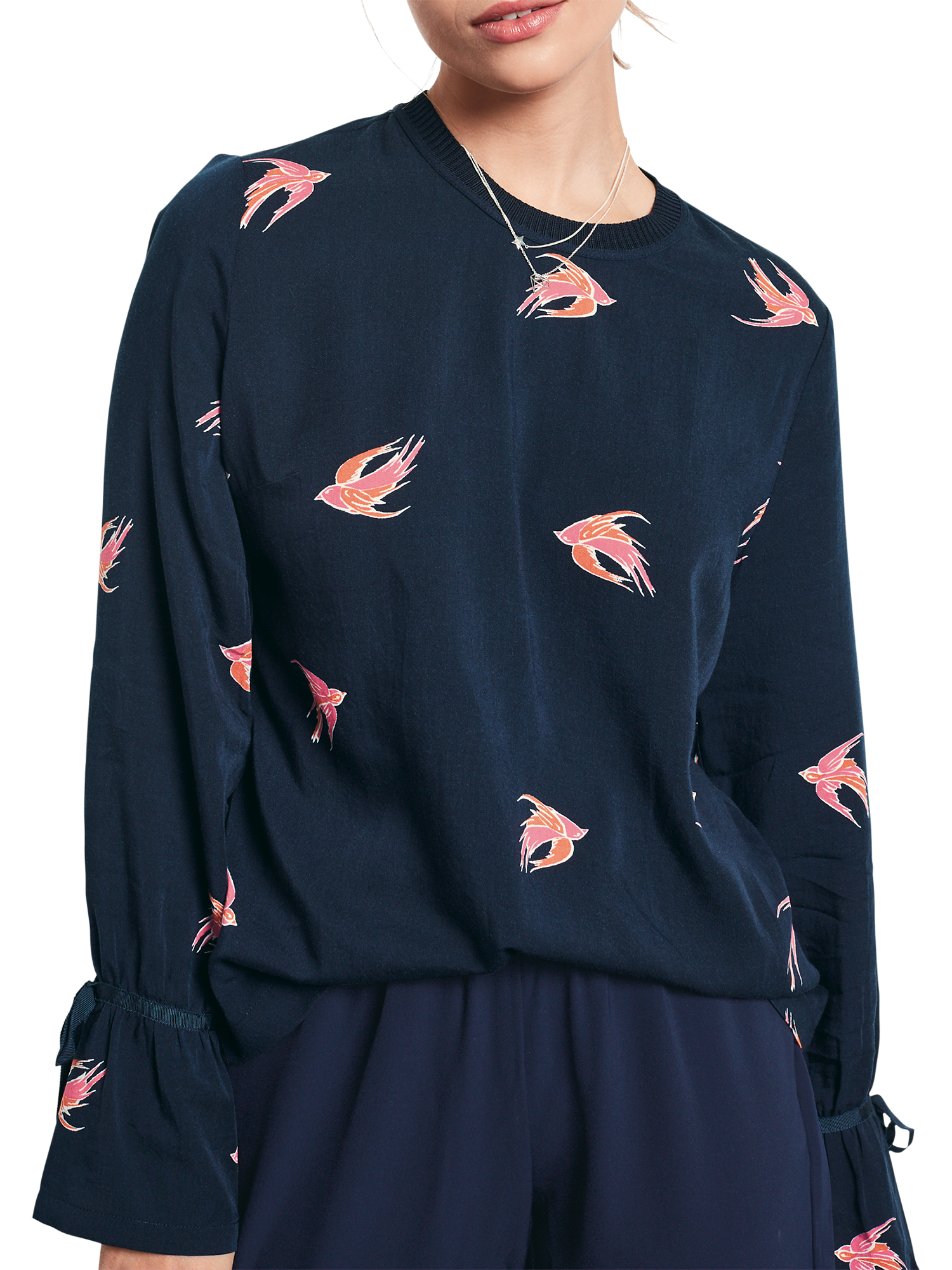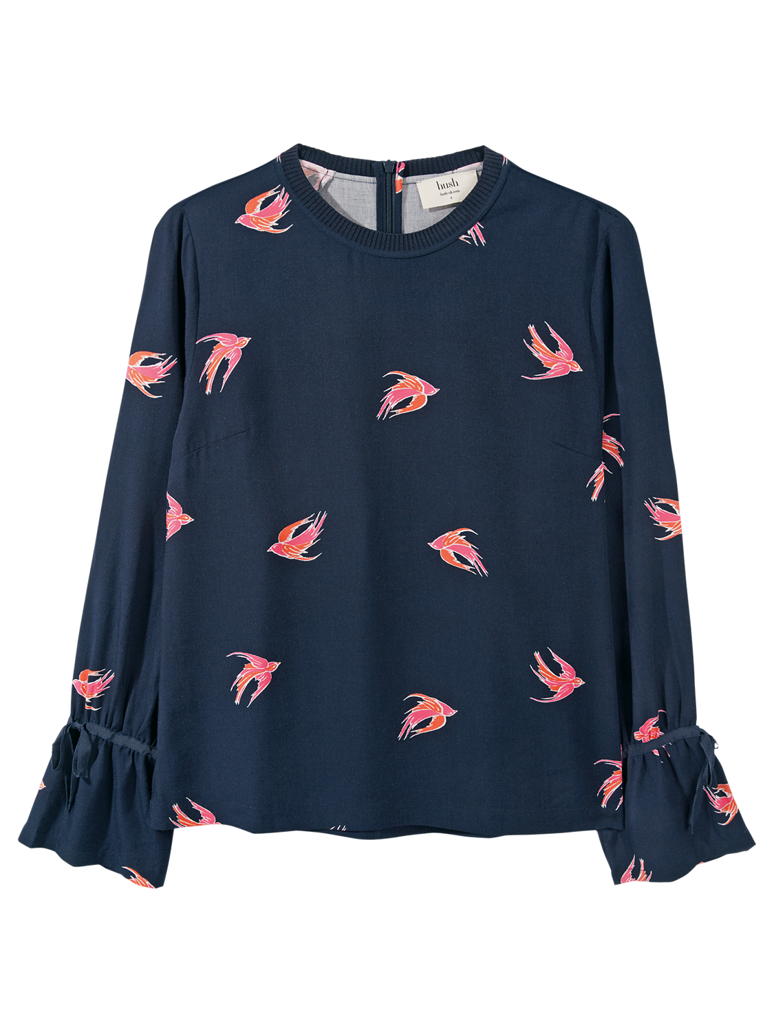 Lightweight and soft-to-the-touch, this blouse has flowing long sleeves with bell cuffs, finished with tie detailing. It is decorated with a pretty bird pattern and fastens with a concealed back zip.