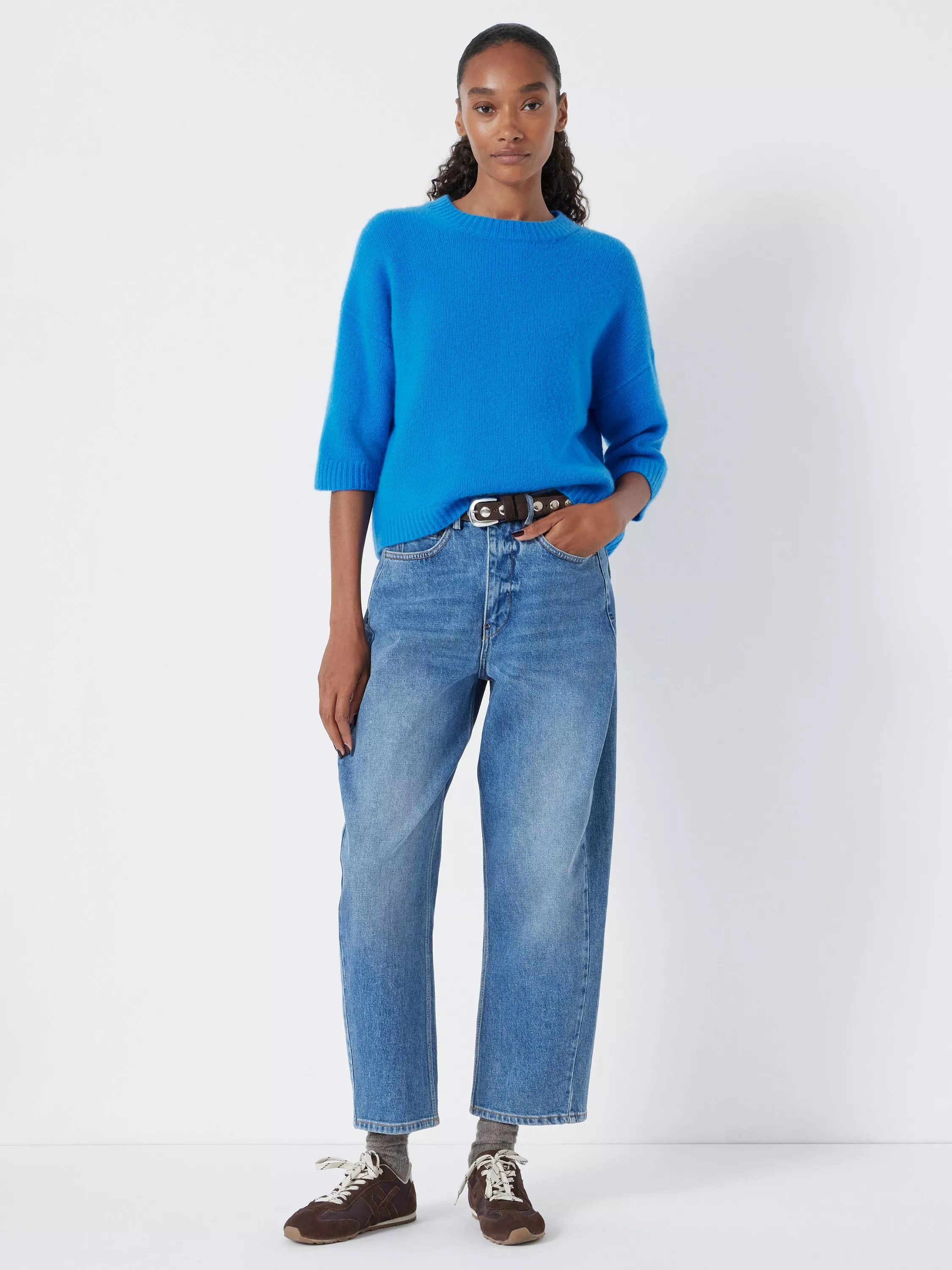 Soft but chunky cashmere makes this top a warm, comfortable choice for winter days. The round neck and three quarter sleeves give you room to move and layer with ease, making daily dressing simple and enjoyable.