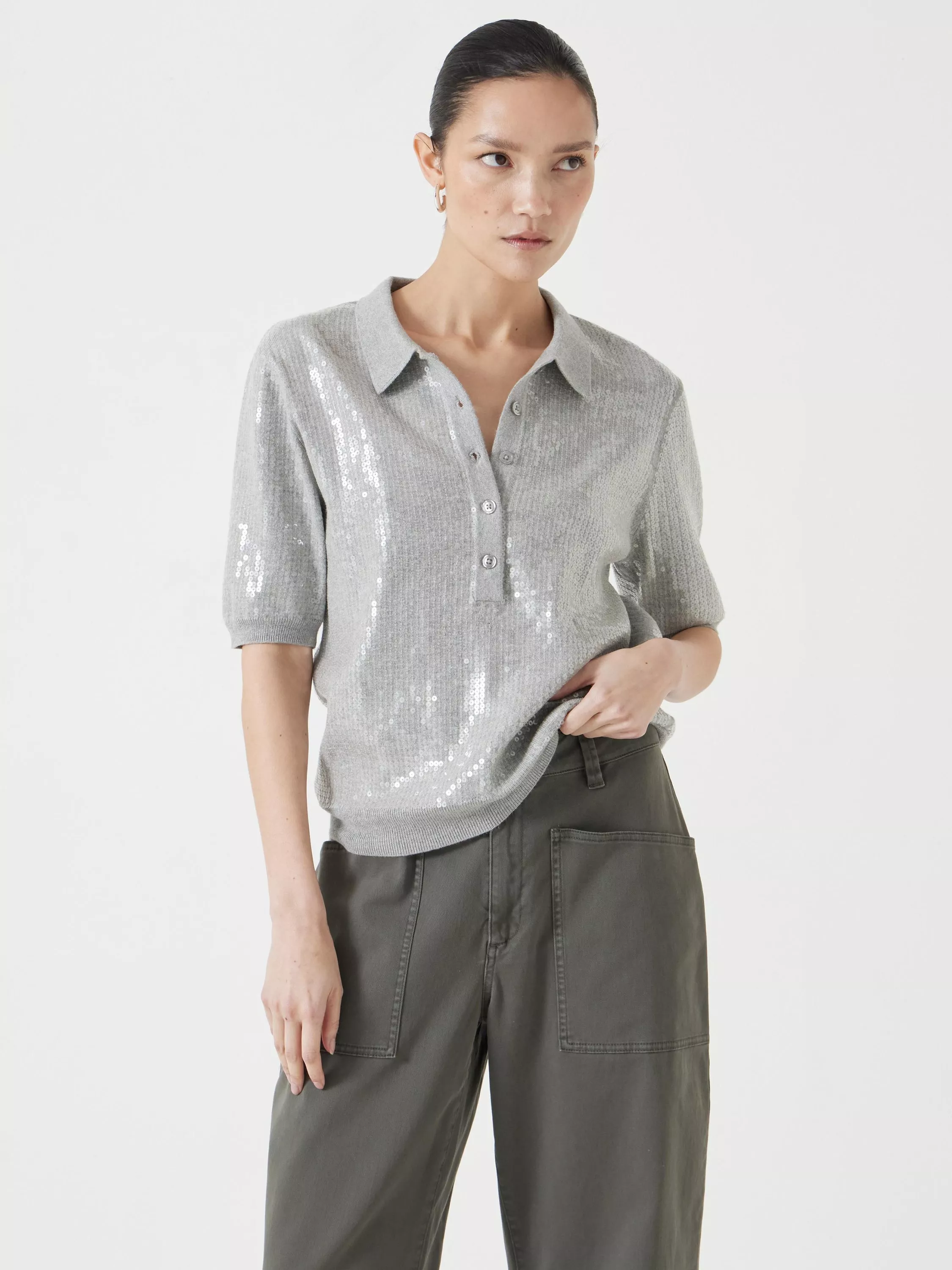 Need proof that sequins can feel summery? This fine-gauge knitted polo is making us see them in a completely different light, quite literally. These clear ones catch the sun beautifully without looking too dressy, so we can wear it with casual trousers and denim shorts.