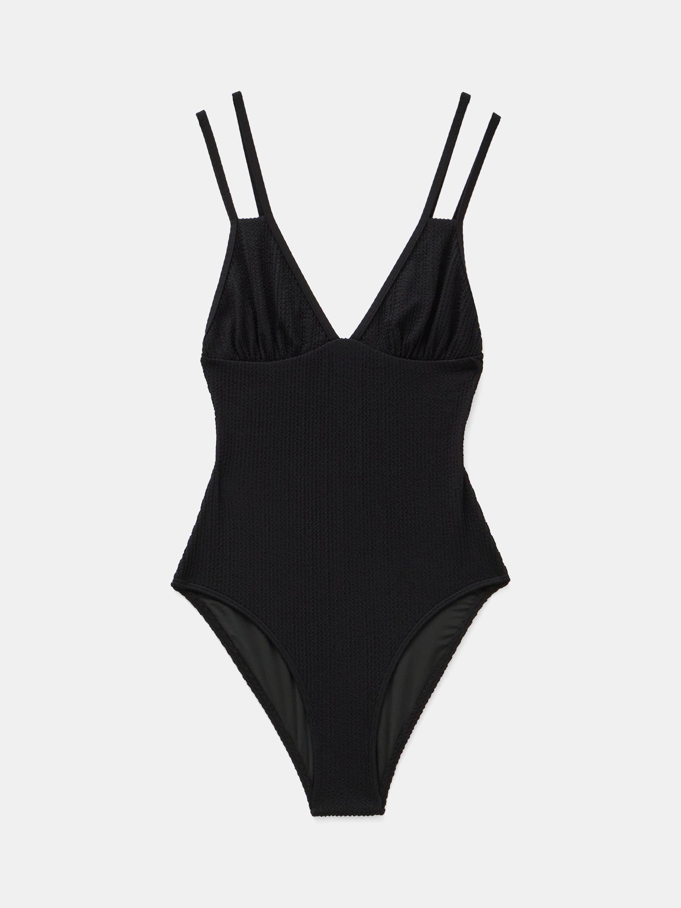 In a mini rib textured material, this swimsuit comes with a classy, double-strap design.