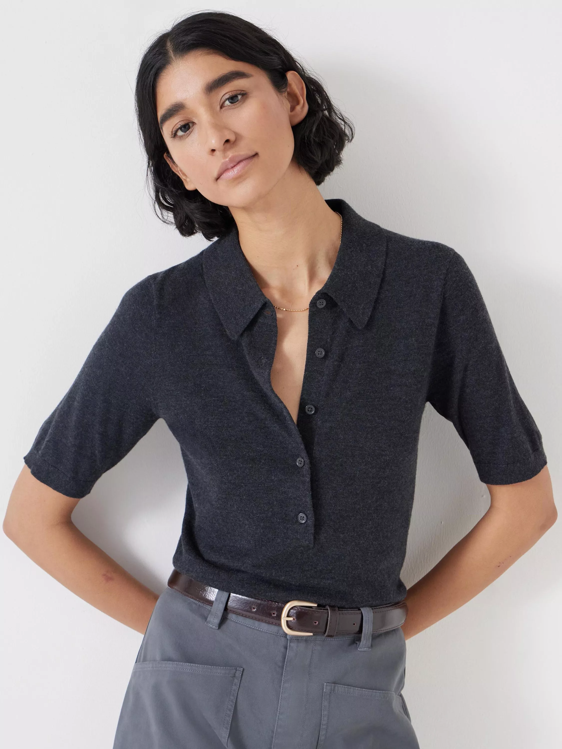 Ready to shed those heavy winter layers? The wait is almost over, but in the meantime we'll be wearing this short-sleeved polo top on repeat. It's crafted in a gorgeous merino wool blend that's super fine for a lighter, luxurious feel on skin, and we love the way the collar makes us feel put-together with minimal effort.