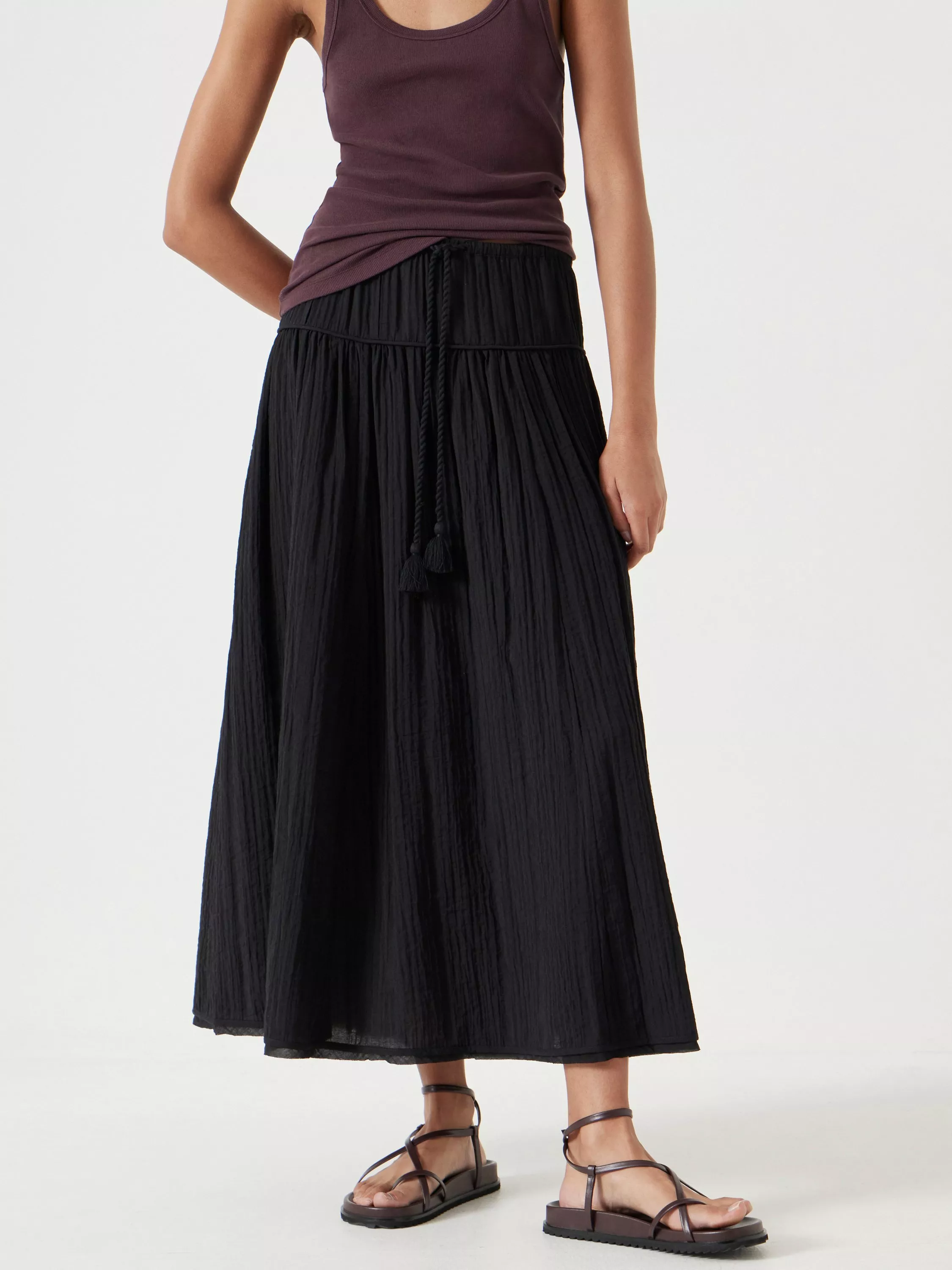 HUSH loves a look that is super comfortable but still looks put-together. This maxi skirt passes the check with its airy profile, while a fitted waist makes it feel a little more elevated.
