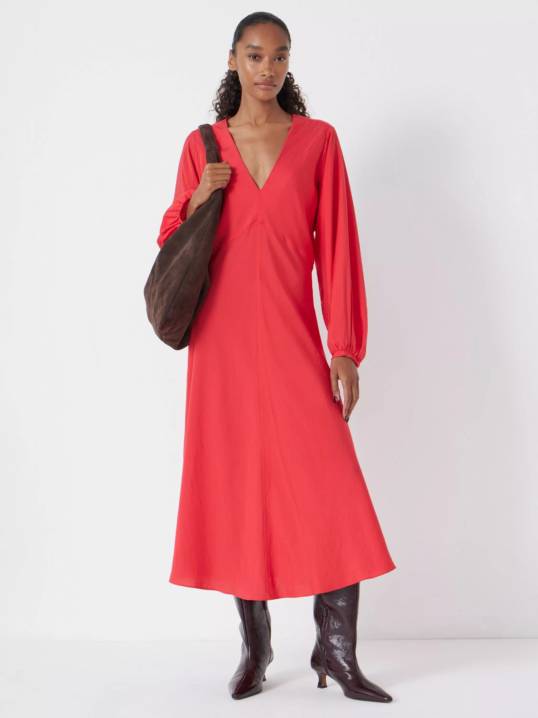 This HUSH midi dress is a versatile choice for any day out. Made from a comfortable viscose blend, it features a timeless plain pattern with a flattering A-line shape. The dress is designed with a V-neck and long sleeves, creating a classic and elegant silhouette.