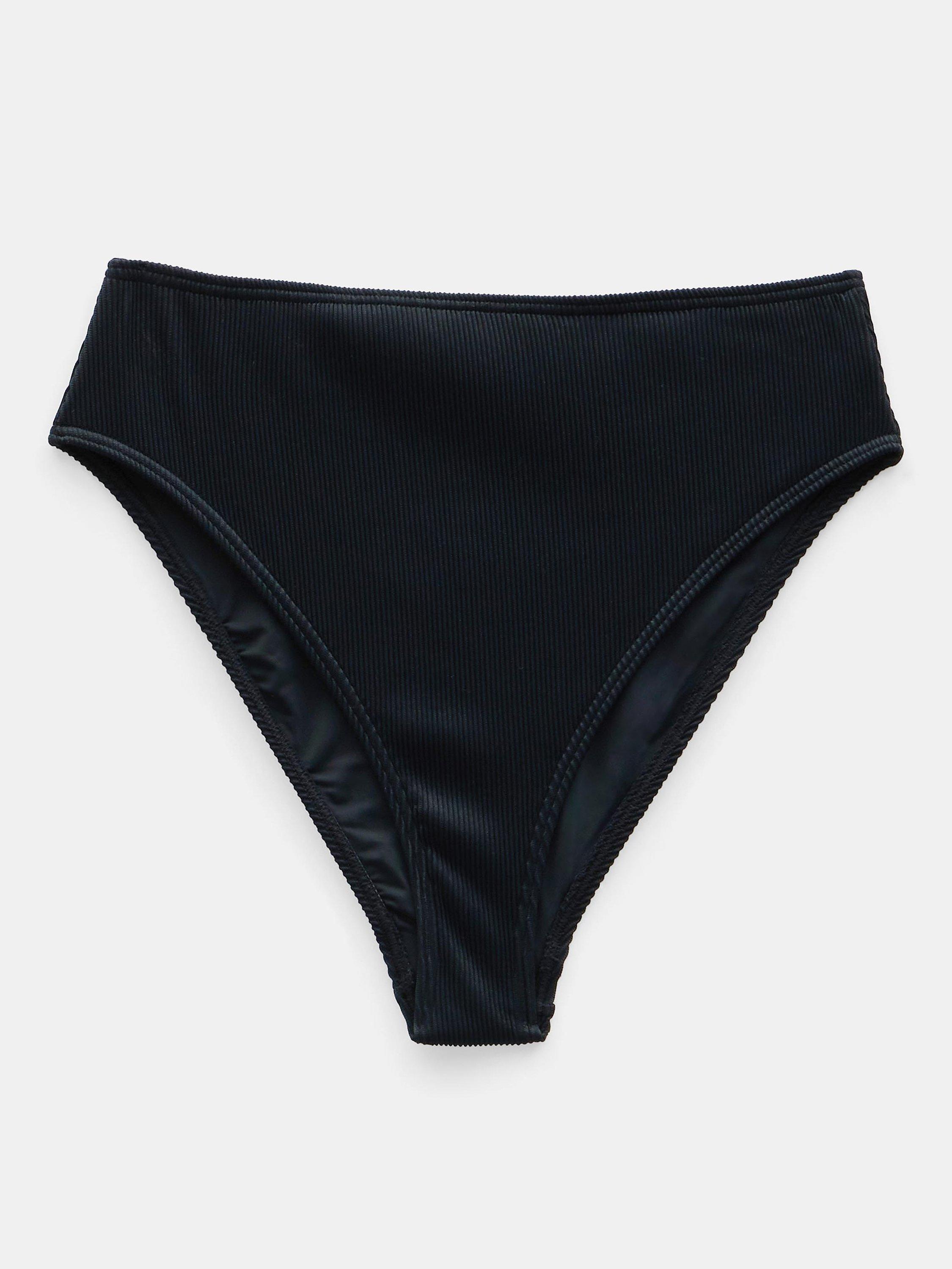 In a mini rib textured fabric, these high-waist bikini bottoms come in a super flattering higher leg shape.