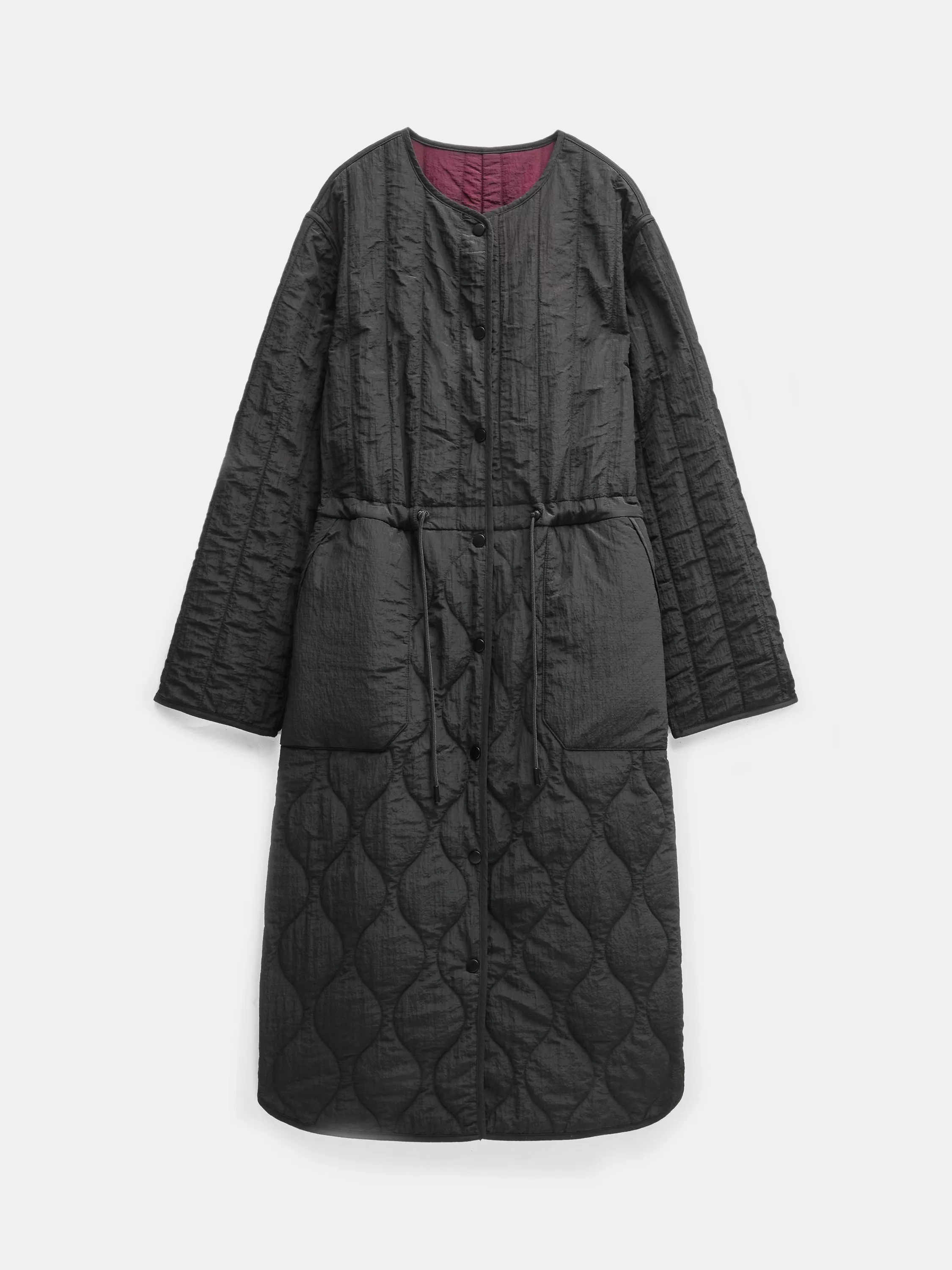 A relaxed fit fully reversible quilted liner jacket. Designed with a water resistant finish on all-over ripstop fabric (resistant to tearing and ripping and gives a nice surface texture to the fabric), it has collarless silhouette for easy layering and is fastened with centre front matt finish snaps.