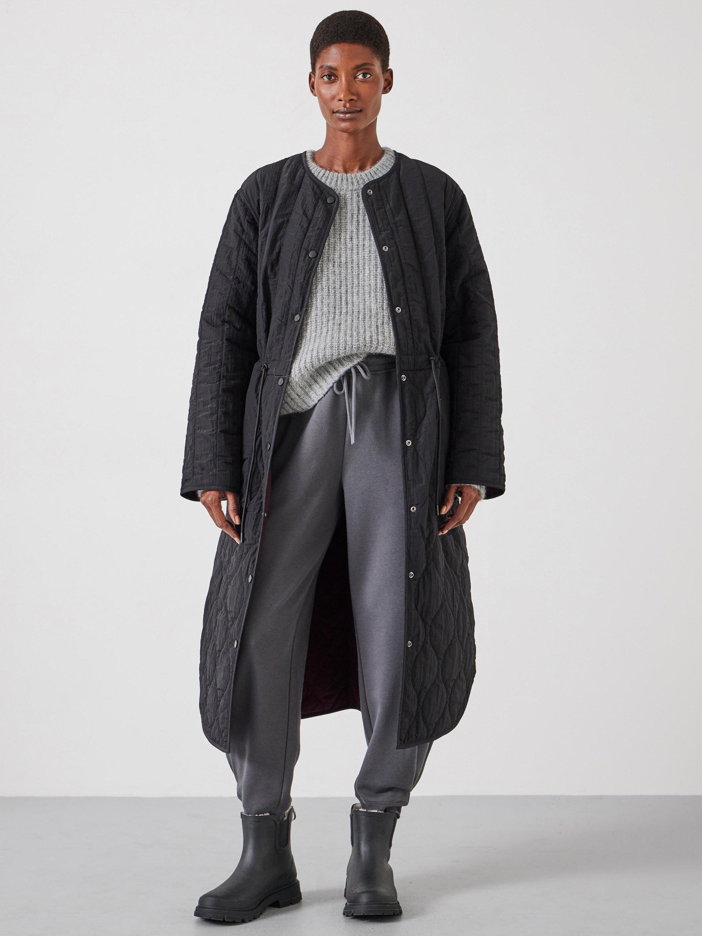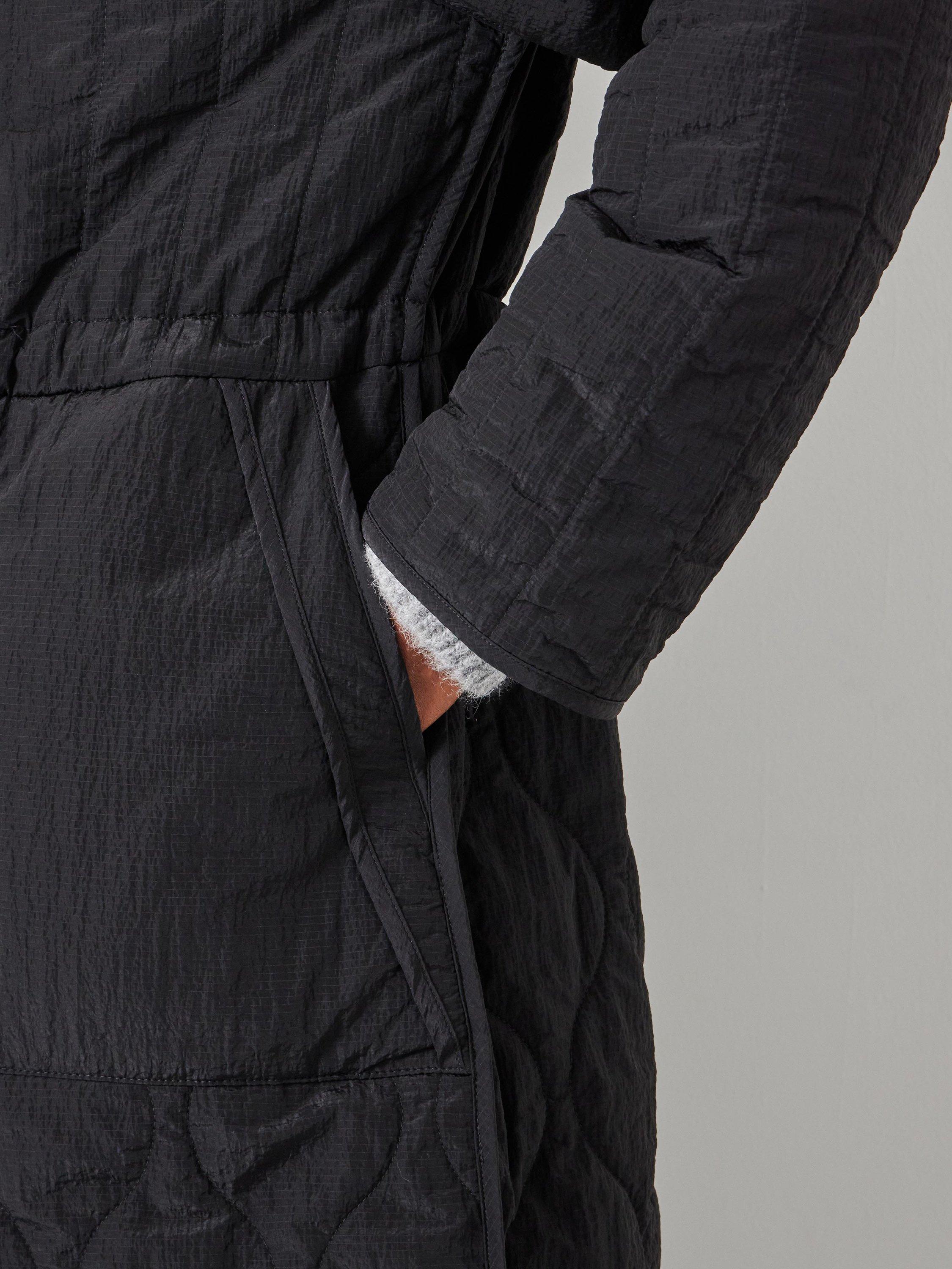 The top half and sleeves come in vertical quilting and bottom half has onion quilting. With an elasticated waist channel with drawcord and adjusters (able to pull in or release the waist for a more fitted or relaxed fit), large patch pockets on both sides (unquilted for contrast to main body), self fabric binding along seams for detailing and premium finish, hanging loop at back yoke seam of black side, and curved side hem shaping detail.