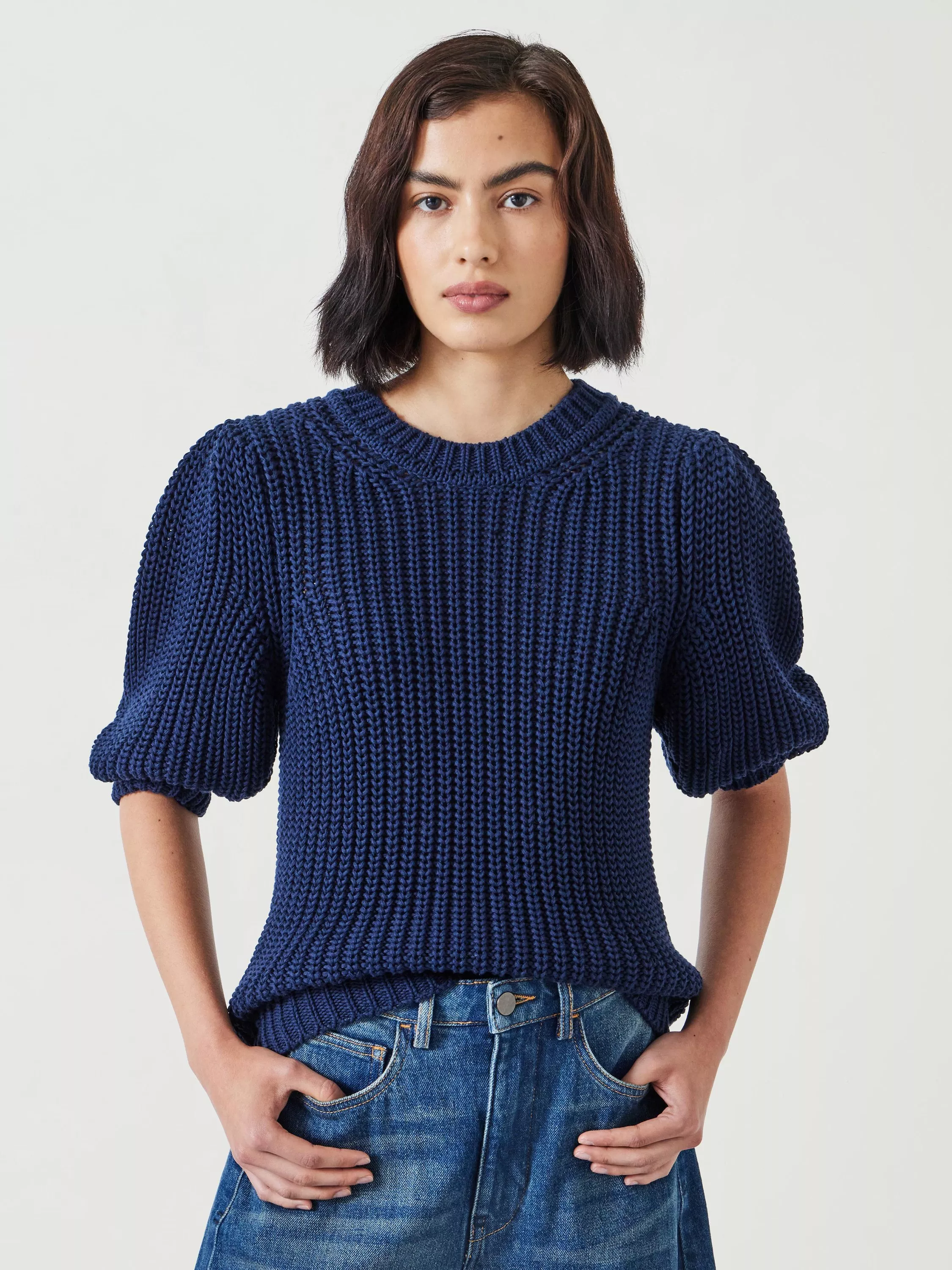 Feeling the chill? Our Jessie top will fix that. It's woven in a chunky rib knit from pure cotton yarns, meaning it's great at trapping warmth. Short sleeves give it a more put-together feel. We'll be pairing ours with barrel-leg denim to take on the week feeling like the best version of ourselves.