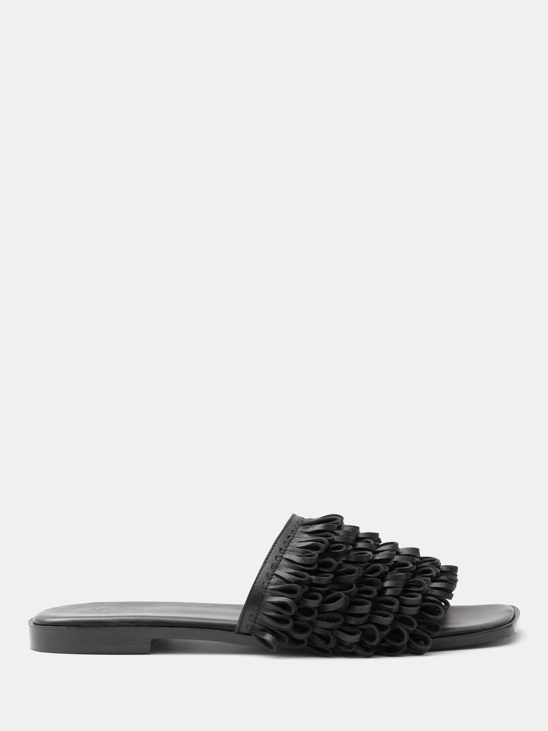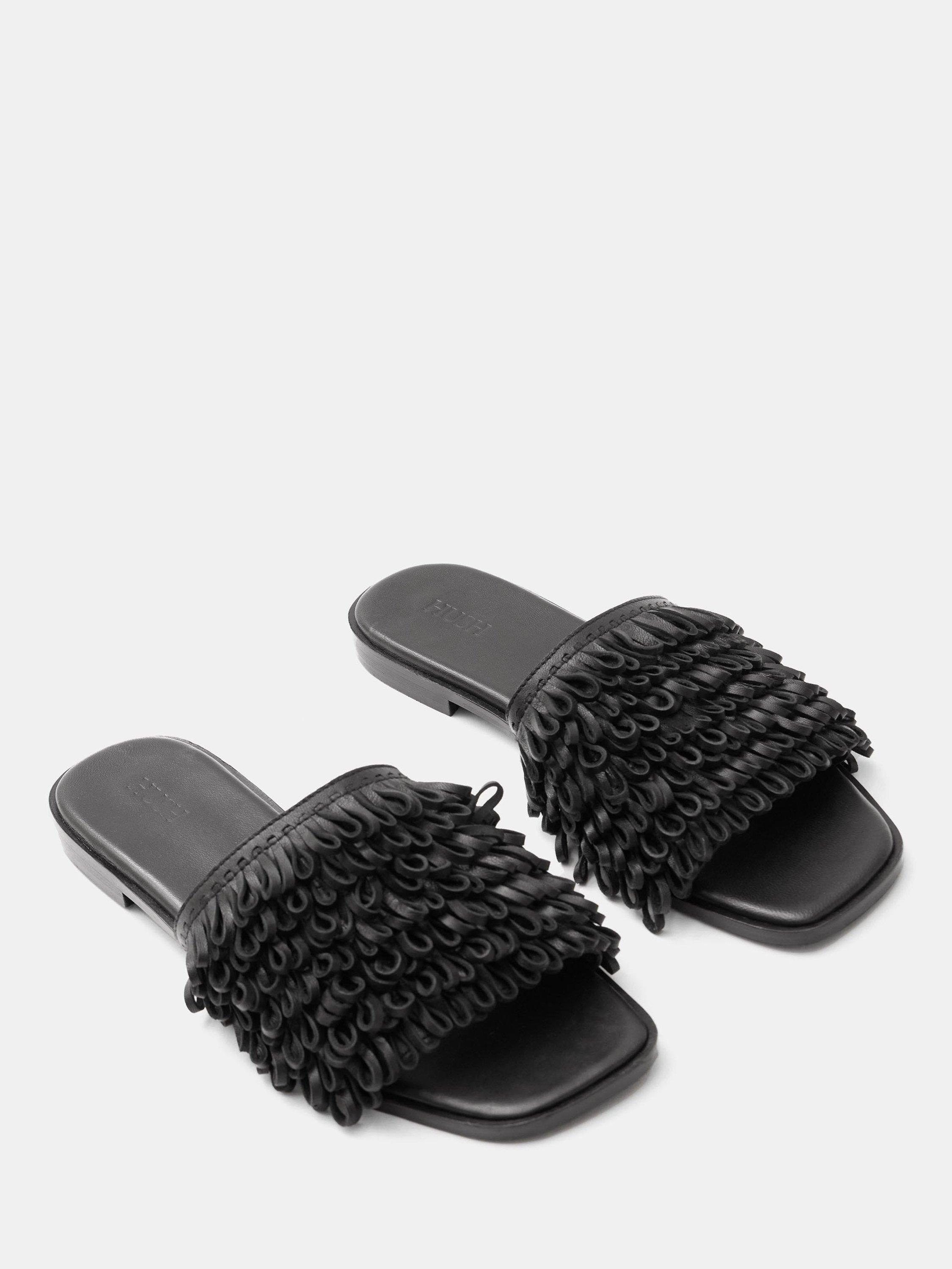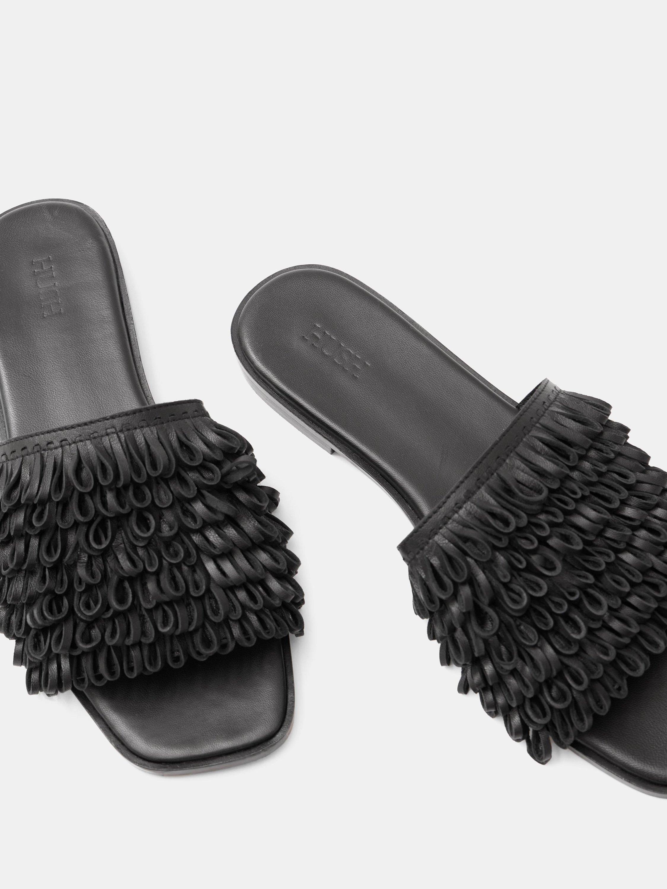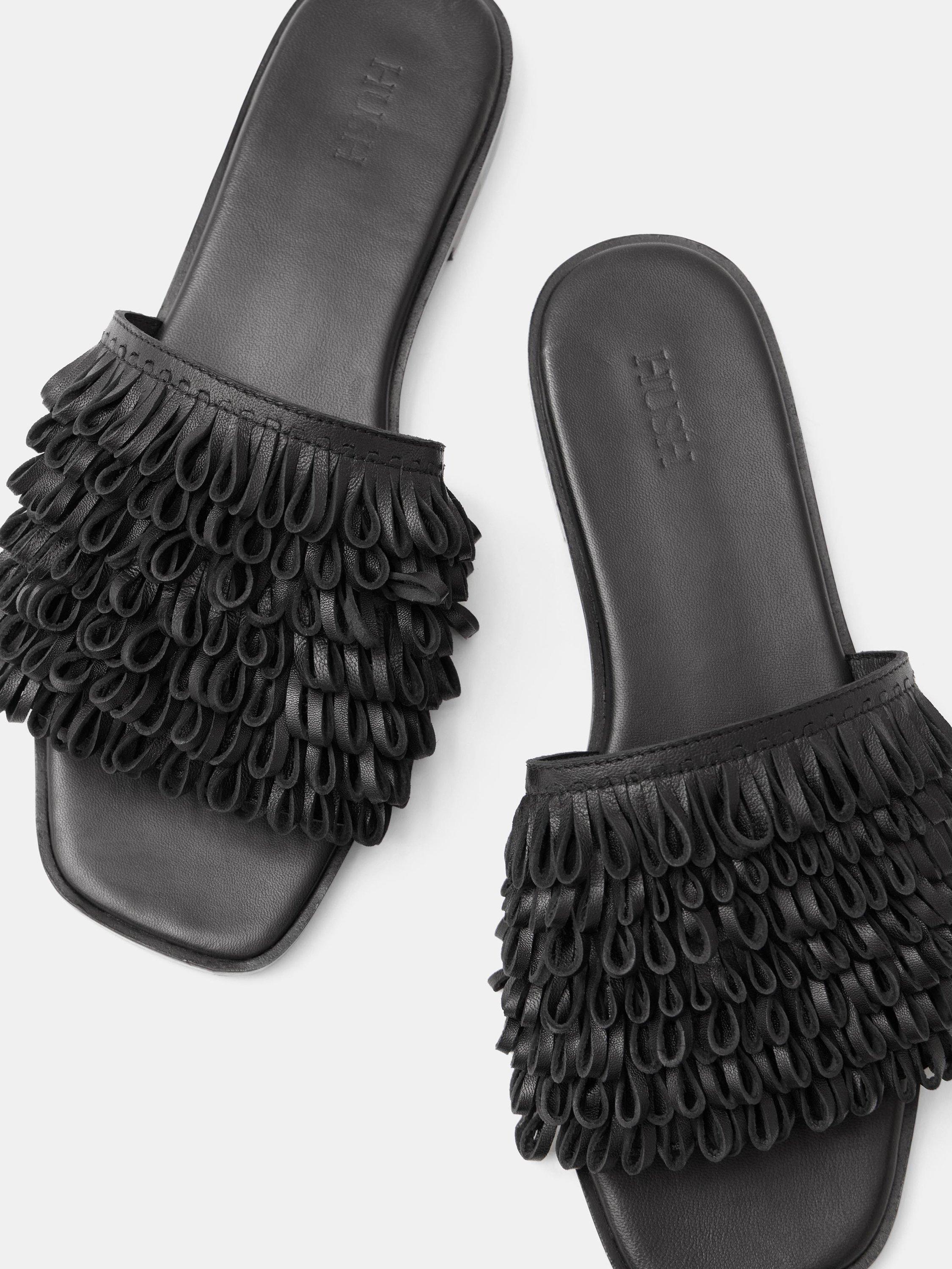 Where will HUSH's fringe slides take you this season? Whether it's city streets or a sandy beach (lucky you), they're guaranteed to add personality to whatever you're wearing. Designed in genuine leather for comfort with hundreds of tiny loops on each strap for unique texture.