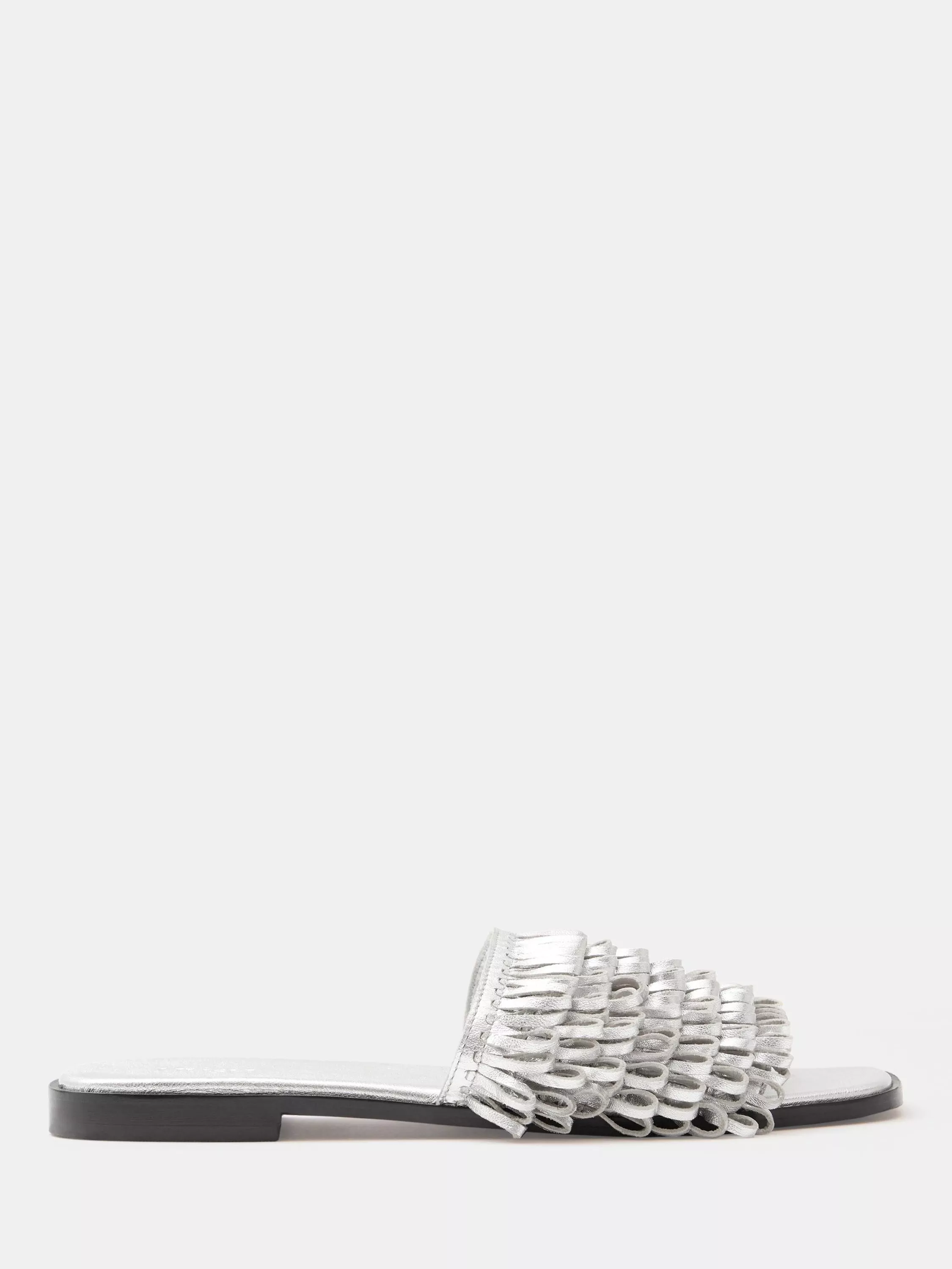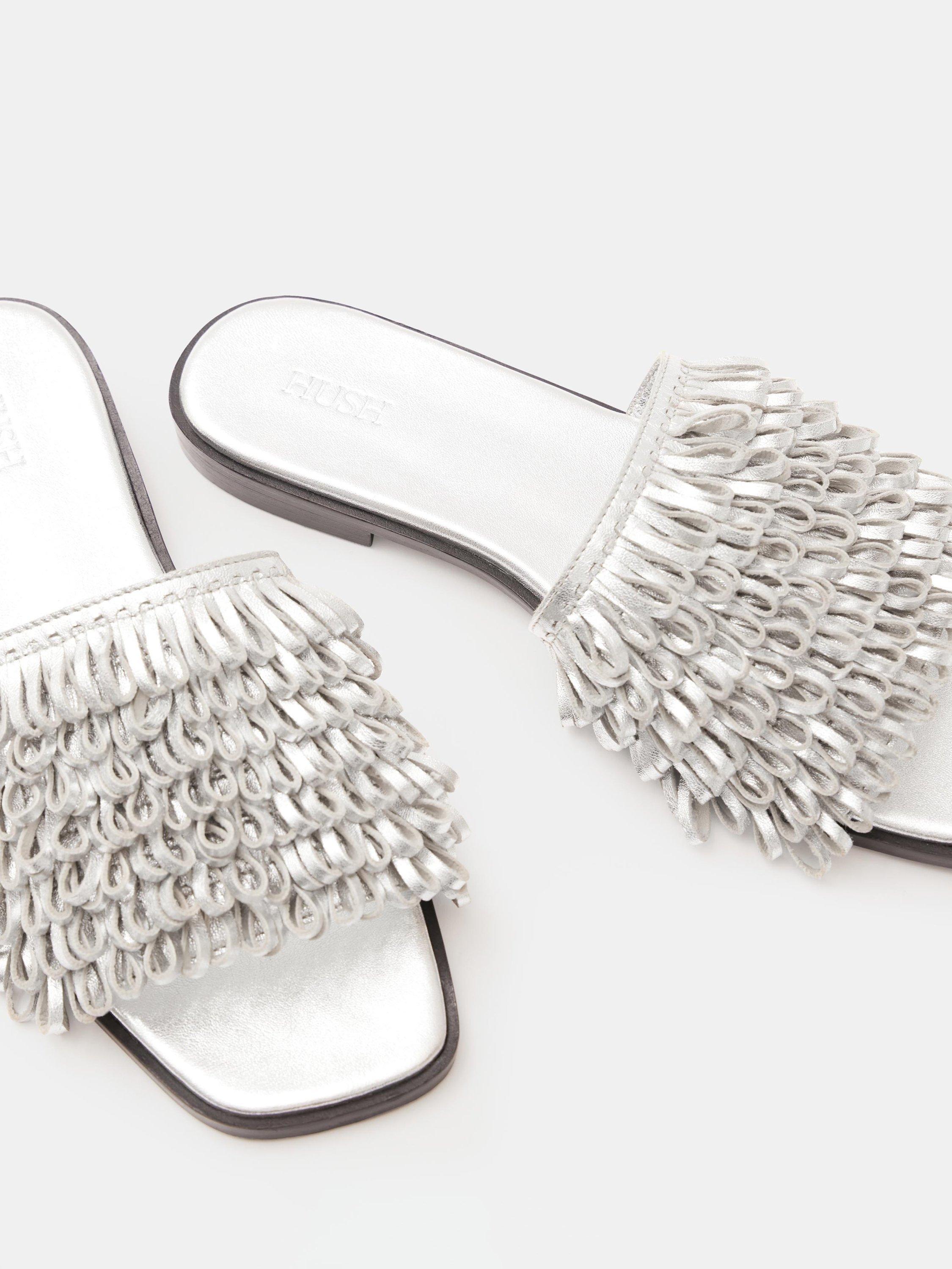 Where will HUSH's fringe slides take you this season? Whether it's city streets or a sandy beach (lucky you), they're guaranteed to add personality to whatever you're wearing. Designed in genuine leather for comfort with hundreds of tiny loops on each strap for unique texture.