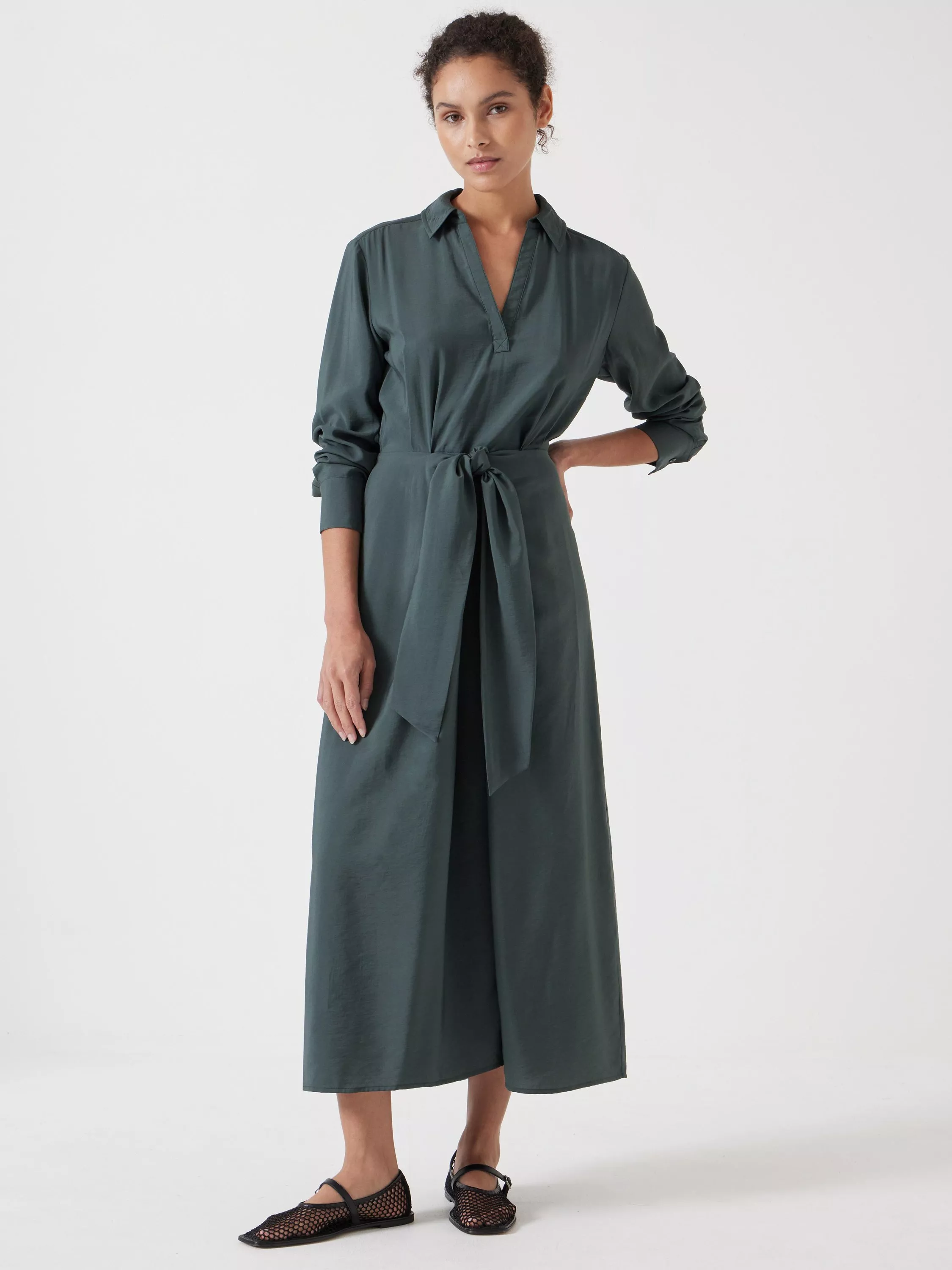 Every edit needs a transeasonal dress. Case in point, this midi from HUSH is made from a soft viscose blend with a collar, full-length sleeves and a tie front.