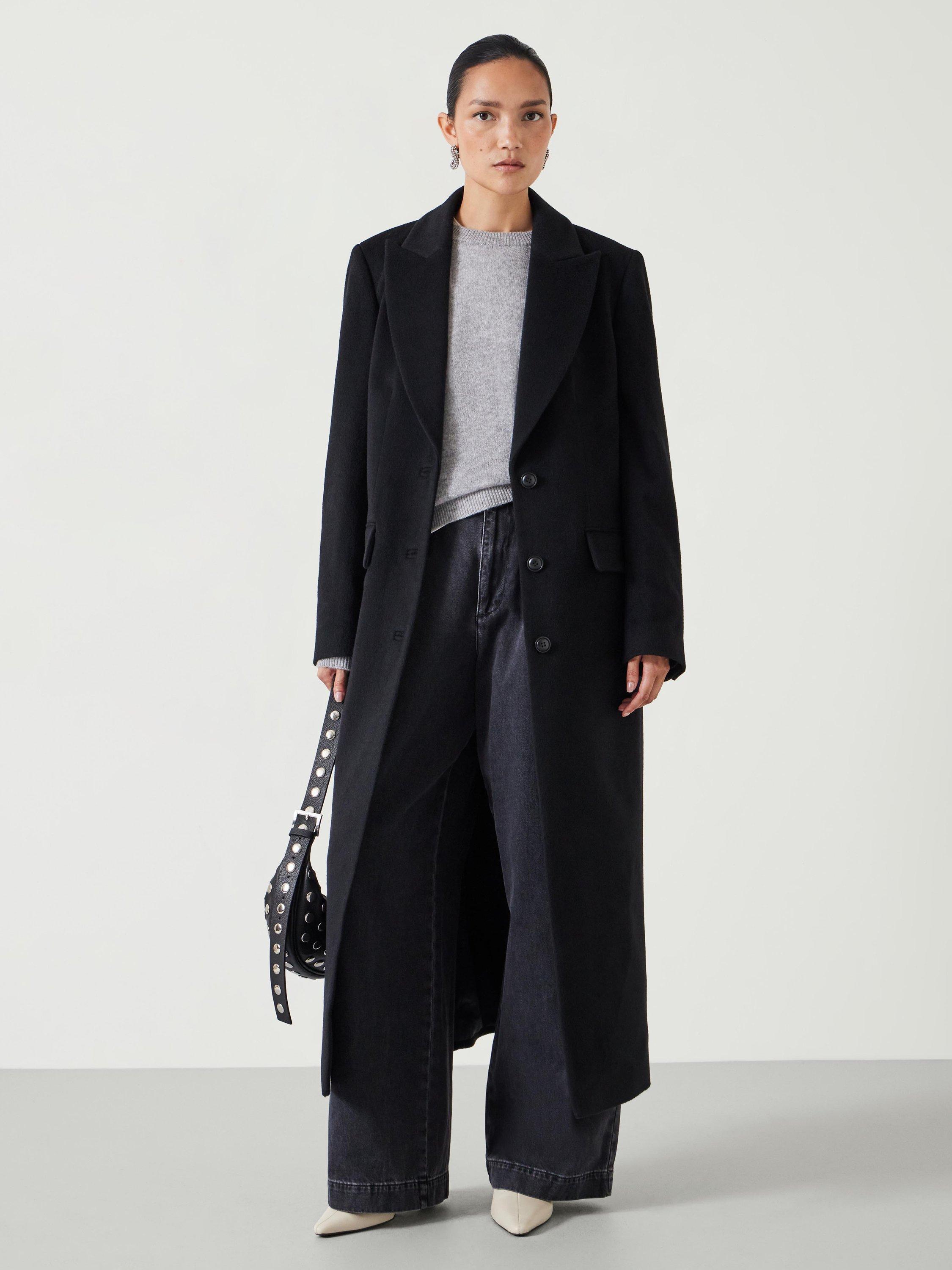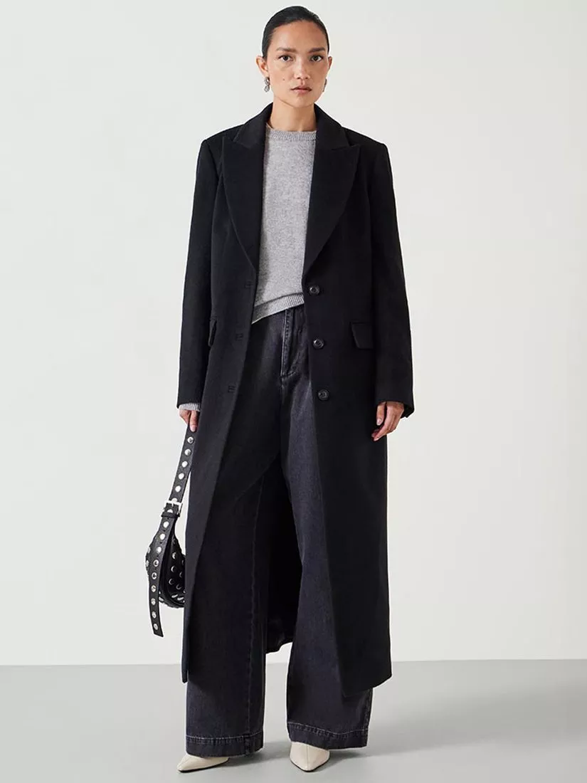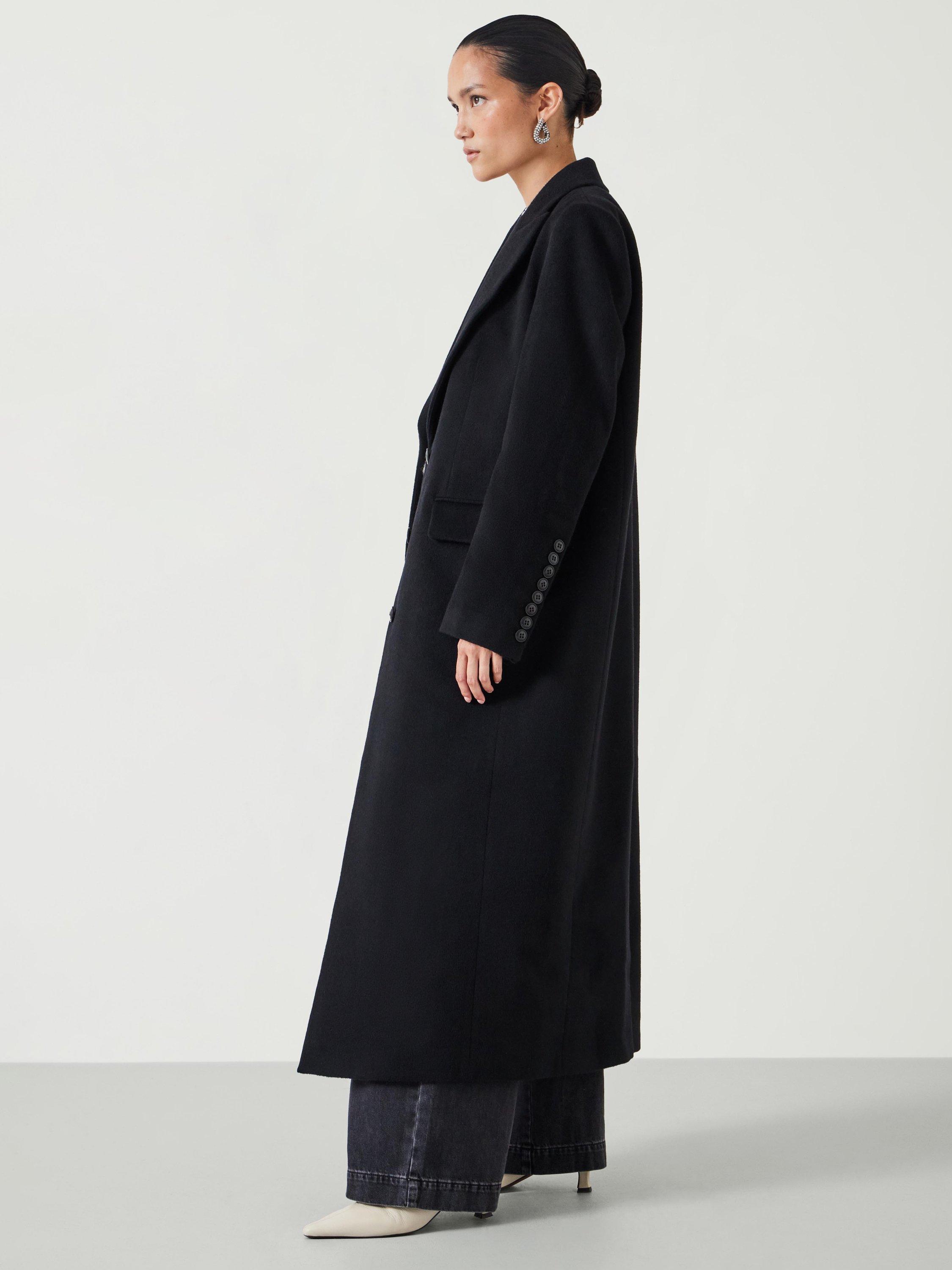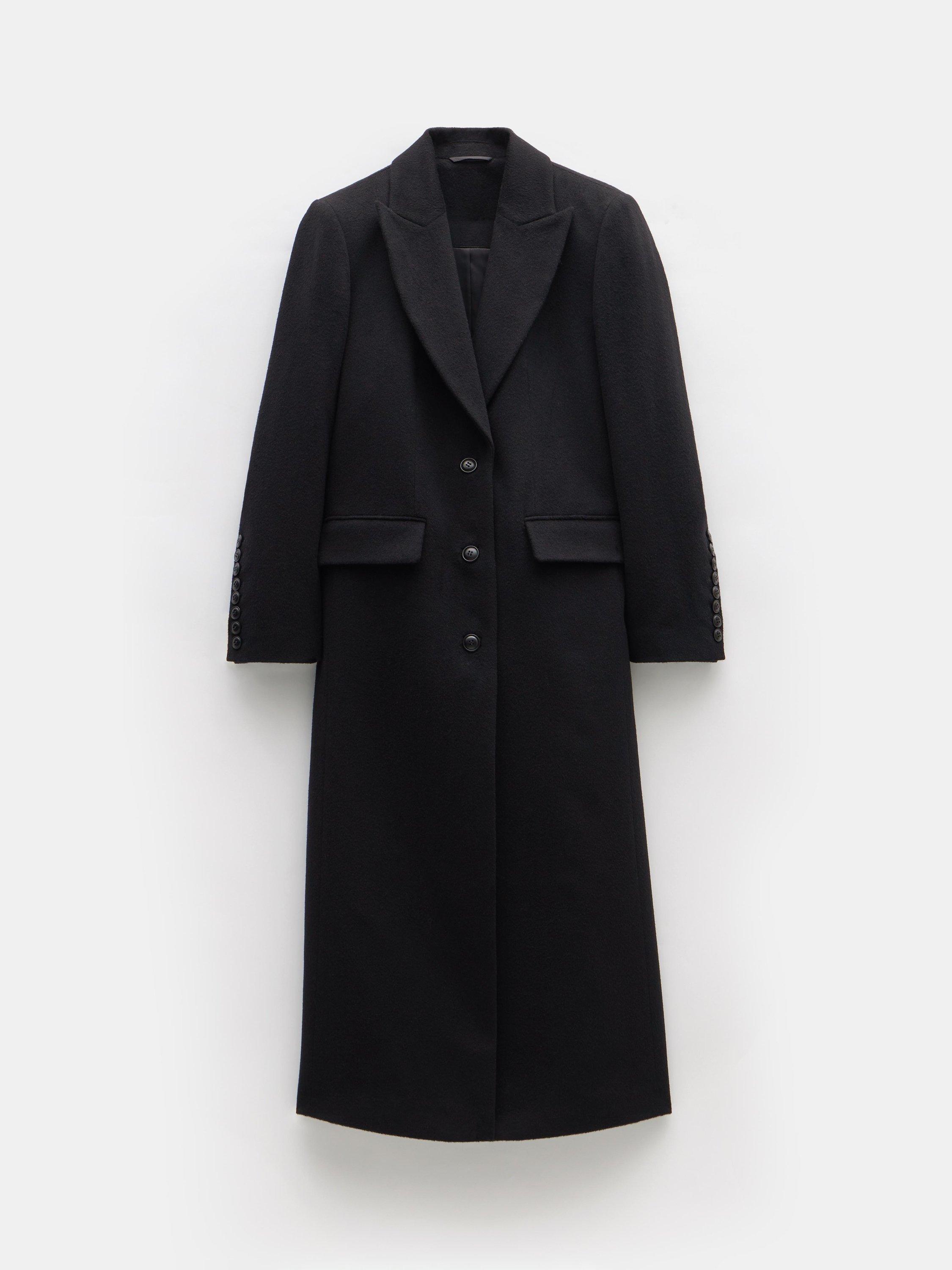 Luxurious structured cashmere blend coat in maxi length, single breasted silhouette. Signature 8 button cuff detail, peak lapel, jet pockets with flaps, back dart detail and back vent. Fully lined with internal welt pocket.