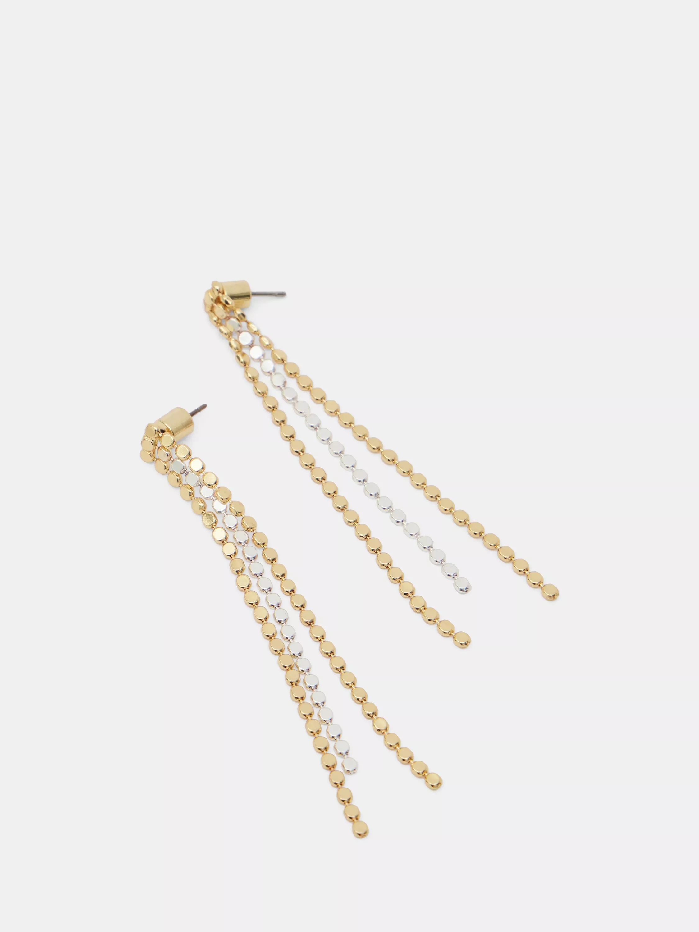 A pair of silver and gold drop earrings from HUSH, showcasing miniature disc detailing in a matte, plated-brass finish. Secured with a bullet fastening, they are suitable for pierced ears only.