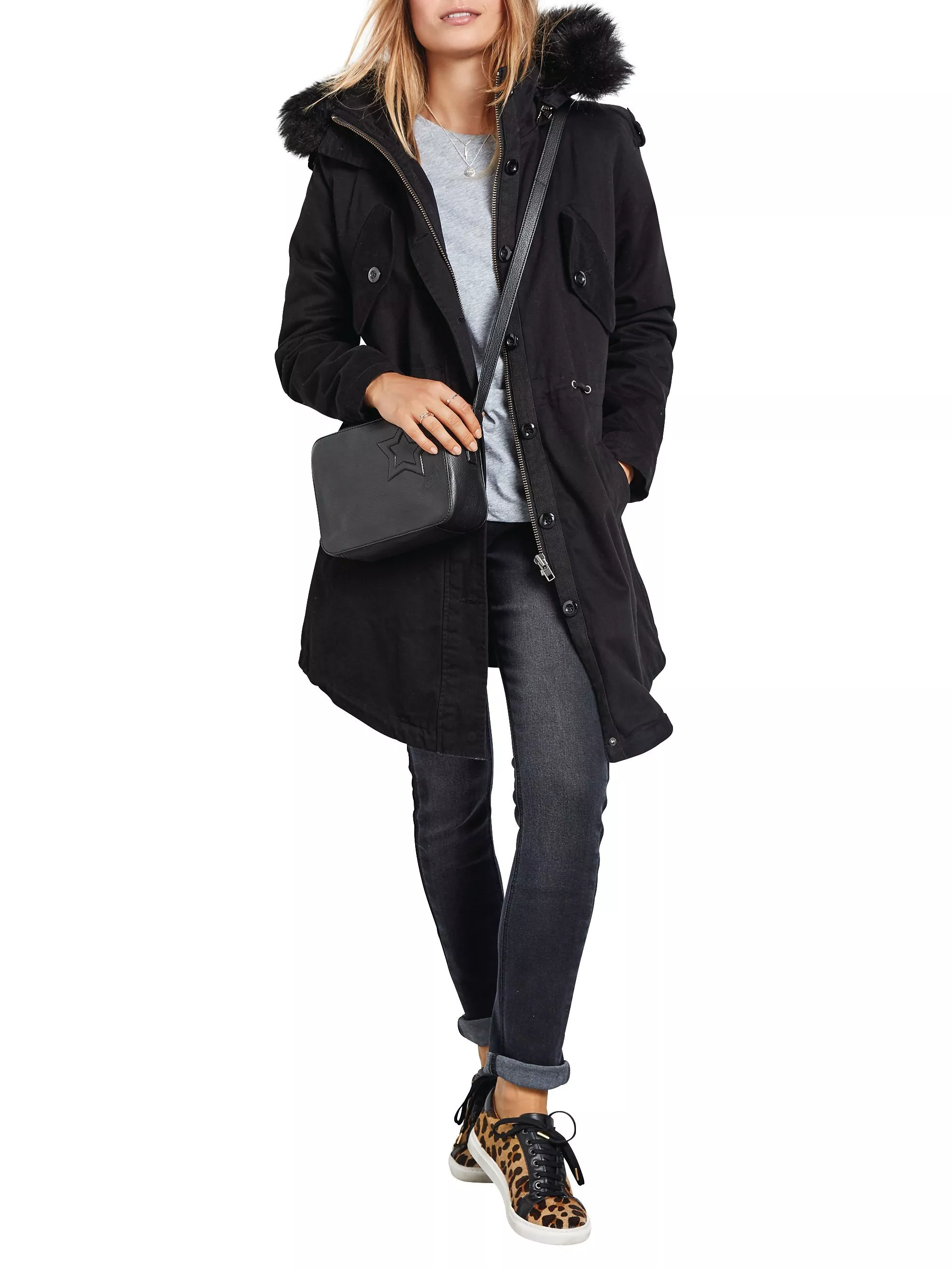 This design features a zip and button fastening, four front pockets and a statement hood with luxe faux fur fringing. Epaulette shoulder detail and an adjustable drawstring waist adds a flattering design twist. A coat for all weather, the style is finished with a removable plush lining.