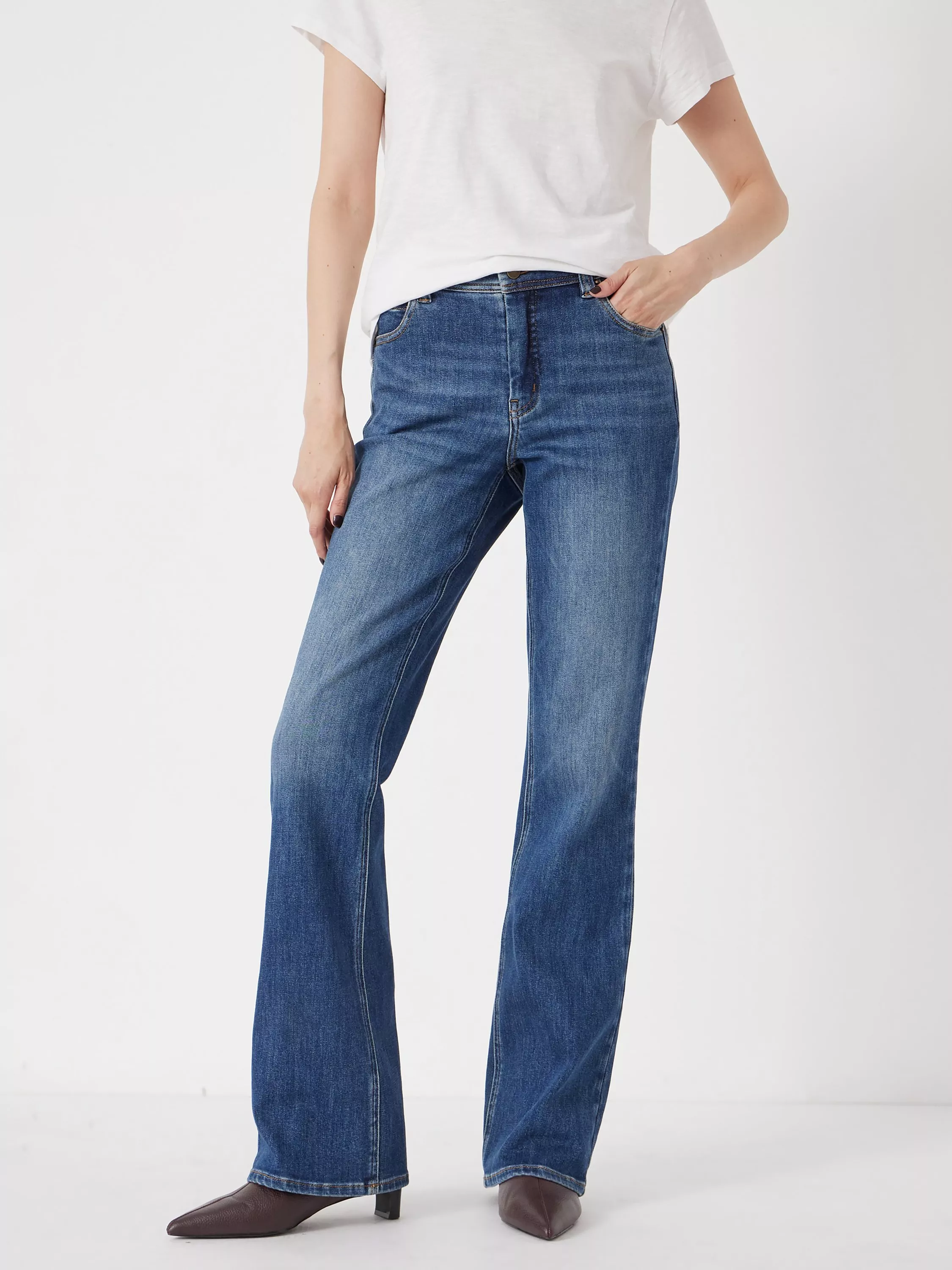 A pair with plenty of flair. Introducing this style from HUSH. Made in denim with a mid rise and a zip fastening.