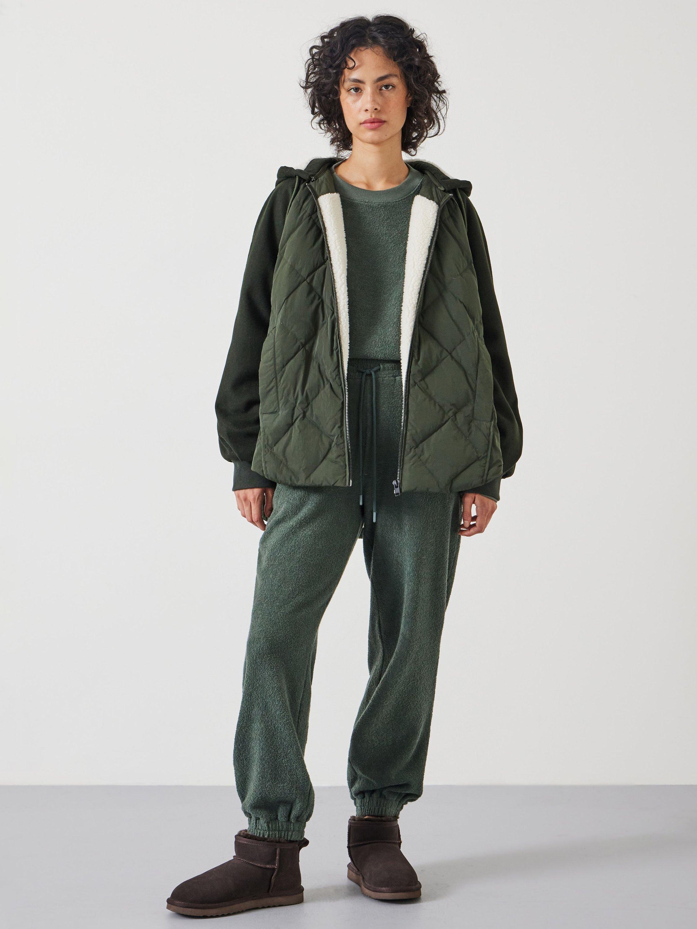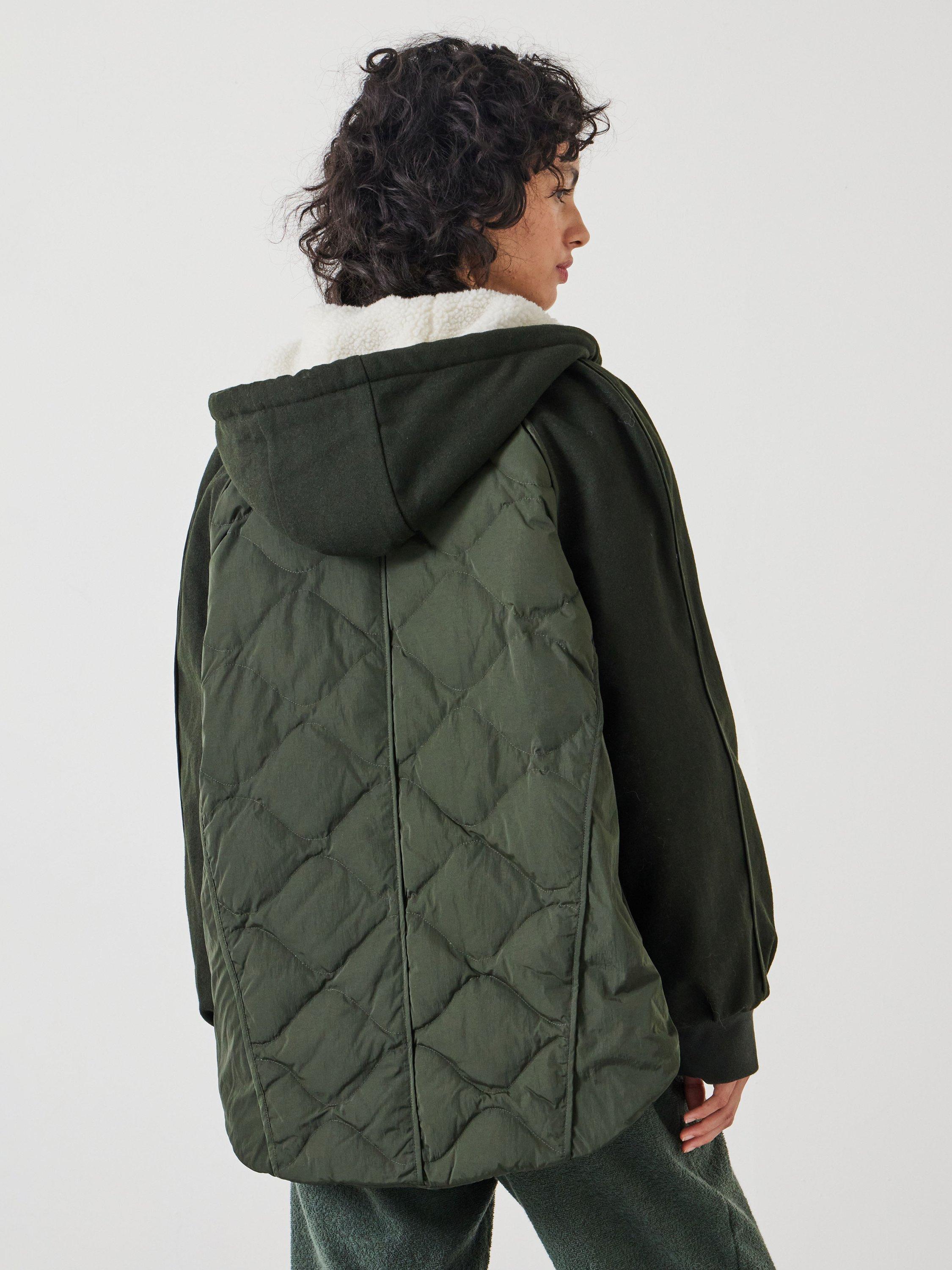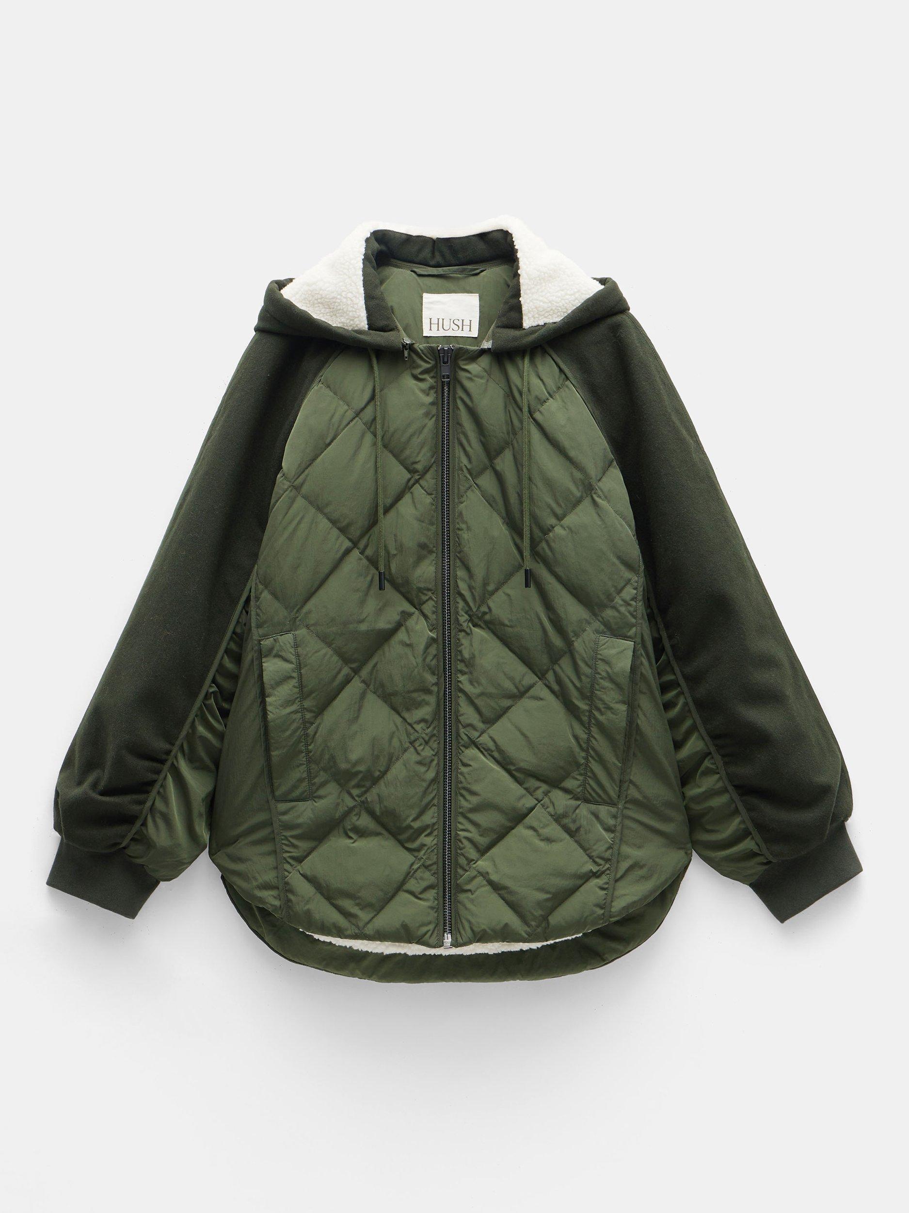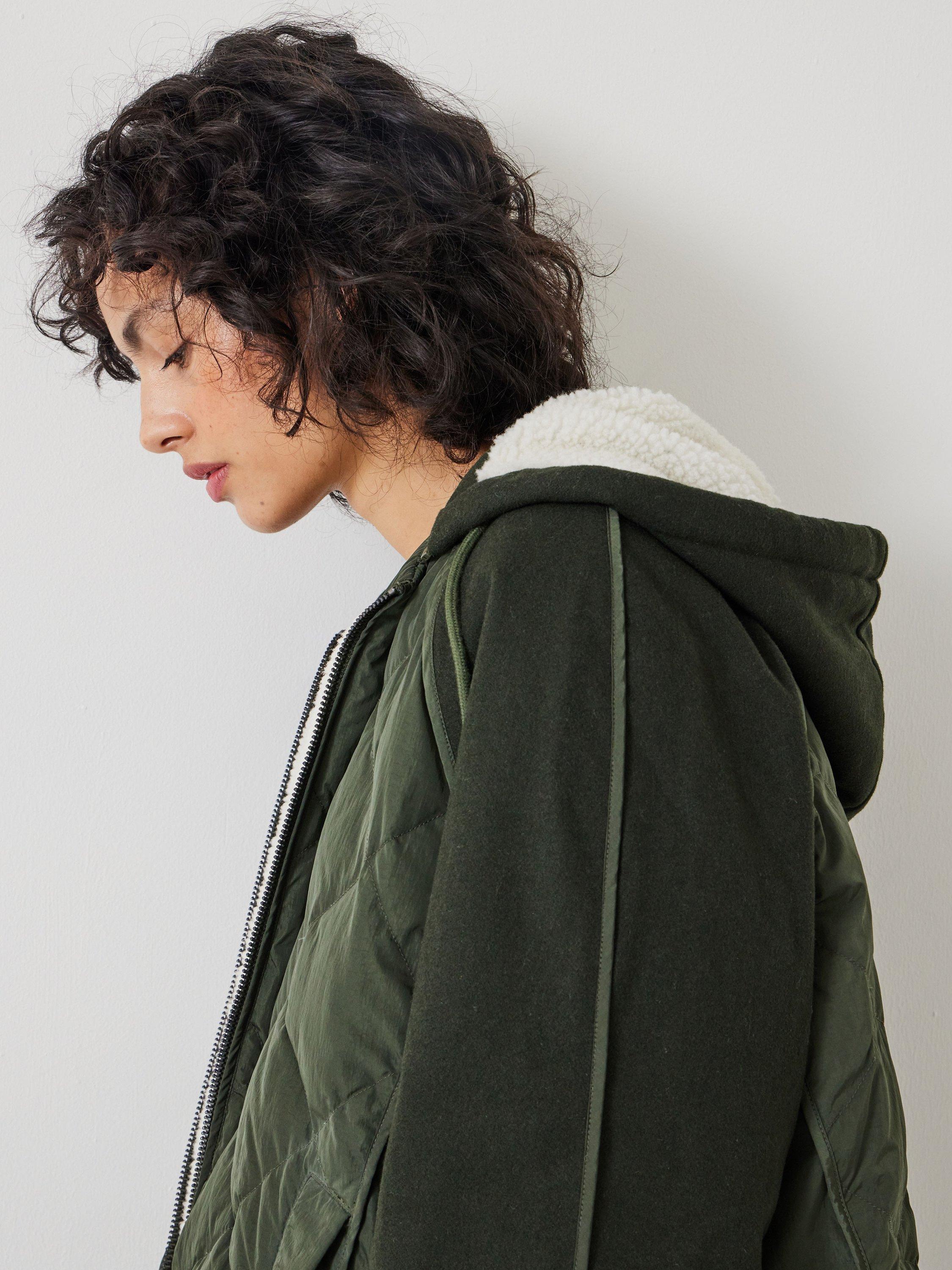 A relaxed zip through bomber style jacket utilising a mix of fabrications and quilting styles. Sleeve overarm and hood in wool blend melton, underarm and body in nylon, body and hood lined in sherpa. Front panels in diamond quilting, back panel uses a mix of vertical and horizontal onion quilting, sides and underarm are unquilted. Raglan sleeve shaping with relaxed 'swing' body silhouette. Fully detachable hood with drawcord, centre front zipper fastening, 2x angled welt pockets, self binding details across seams throughout, curved hem shaping.