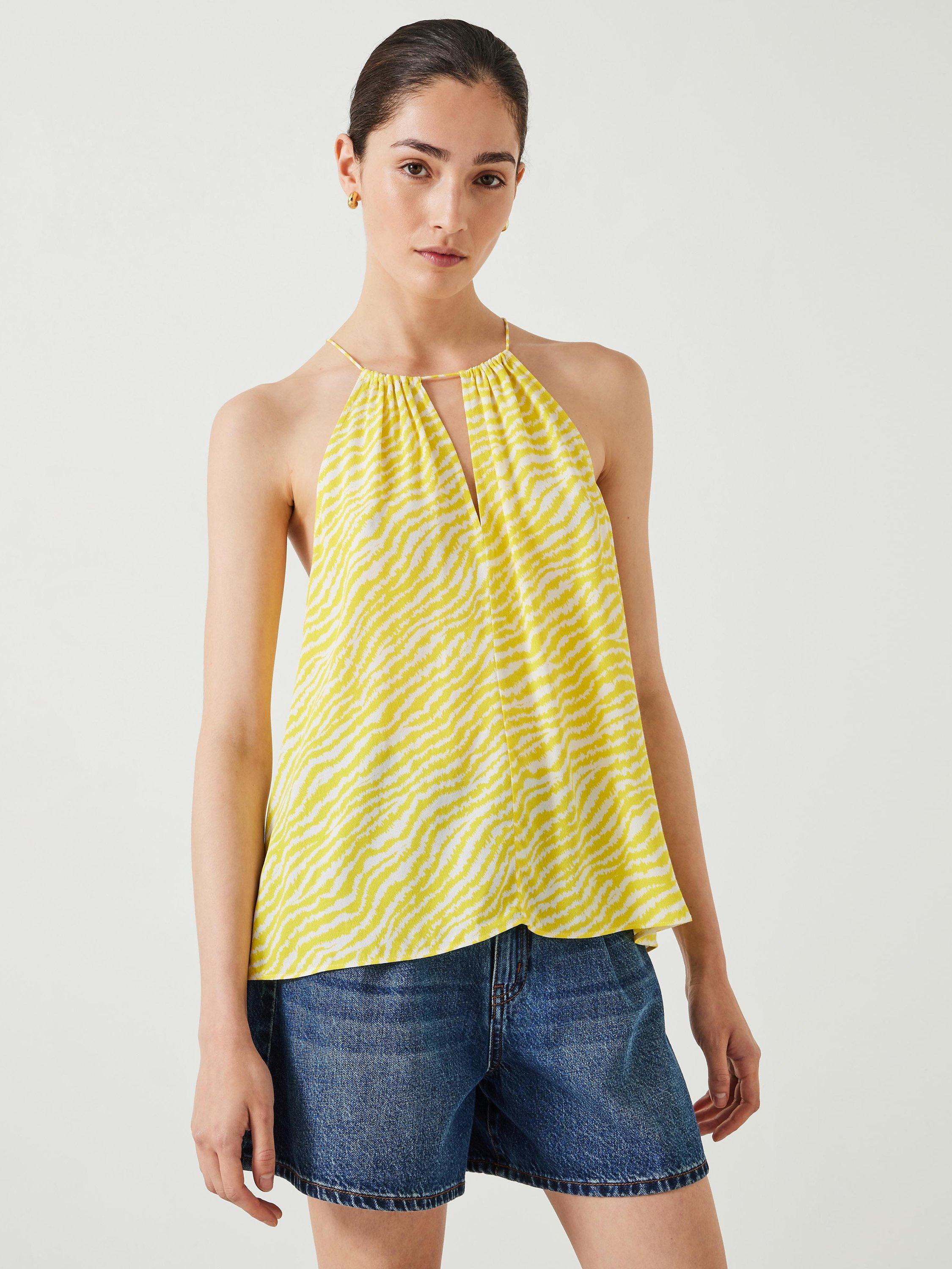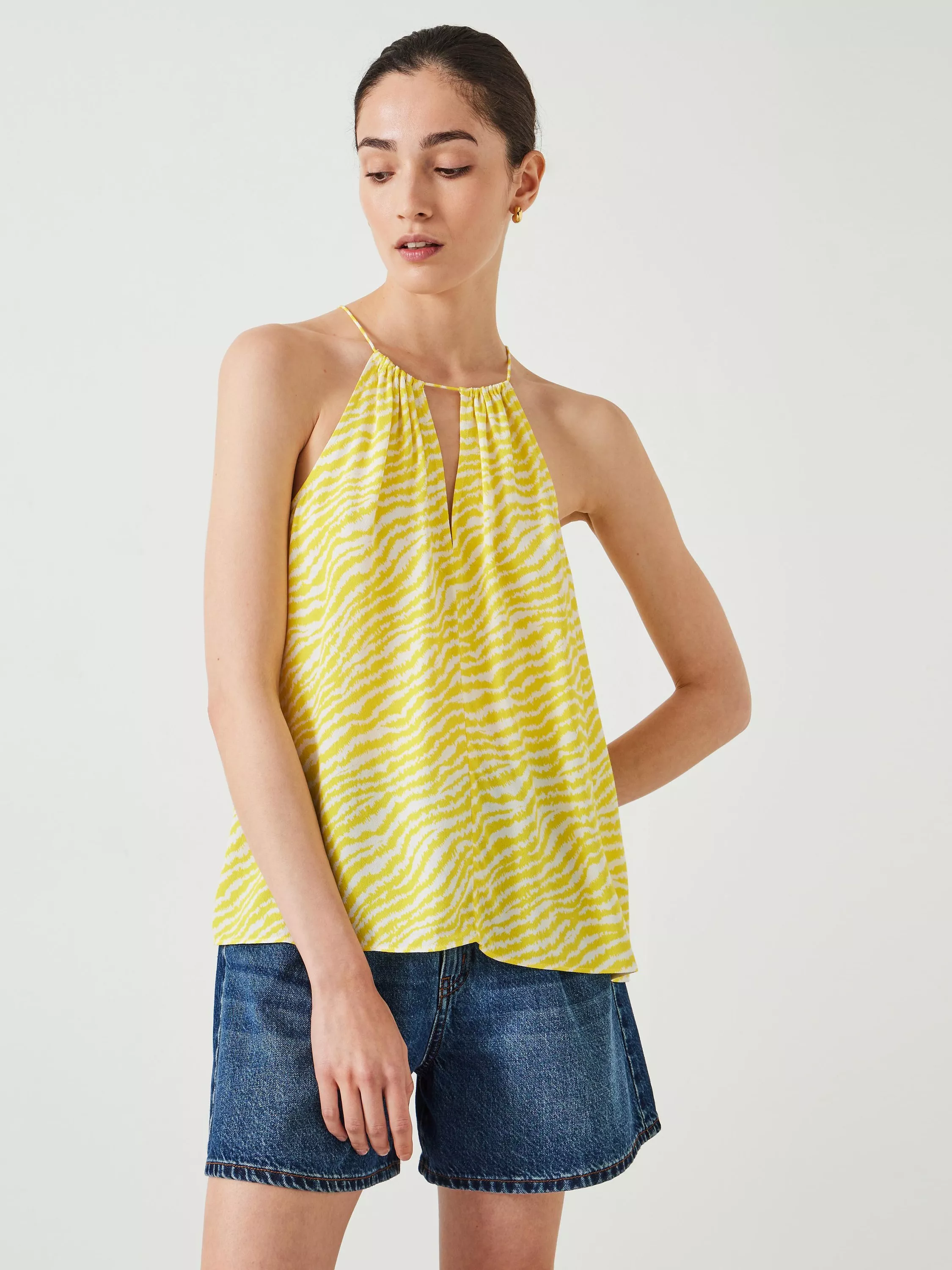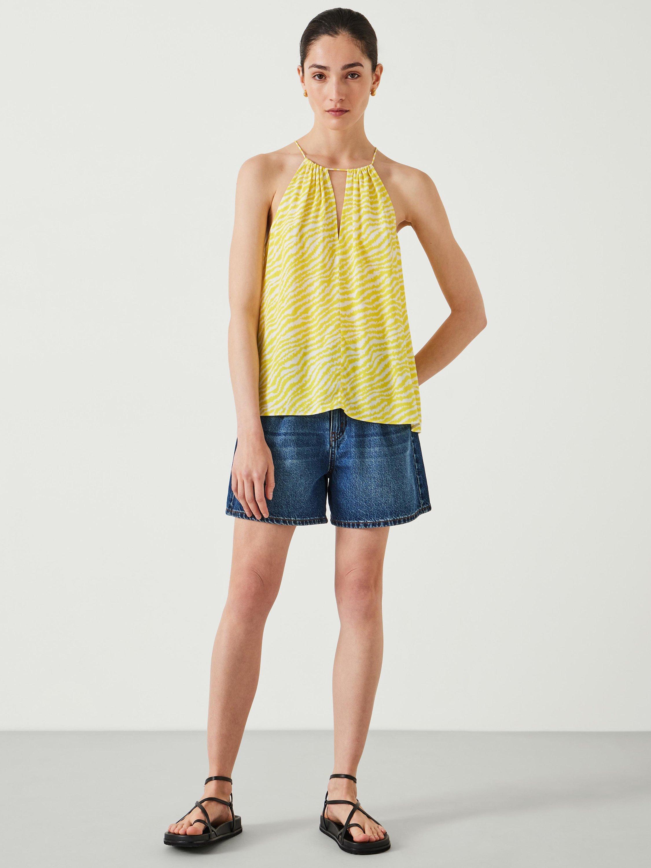 HUSH's Tina halter top is perfect for pairing with denim shorts this season, but there are plenty of other ways to style it: with loose linen trousers, silky midi skirts and (of course) your favourite jeans. The all-over animal print is a great way to bring a pop of colour to our look, but it still feels really fresh thanks to the unexpected shade of yellow.