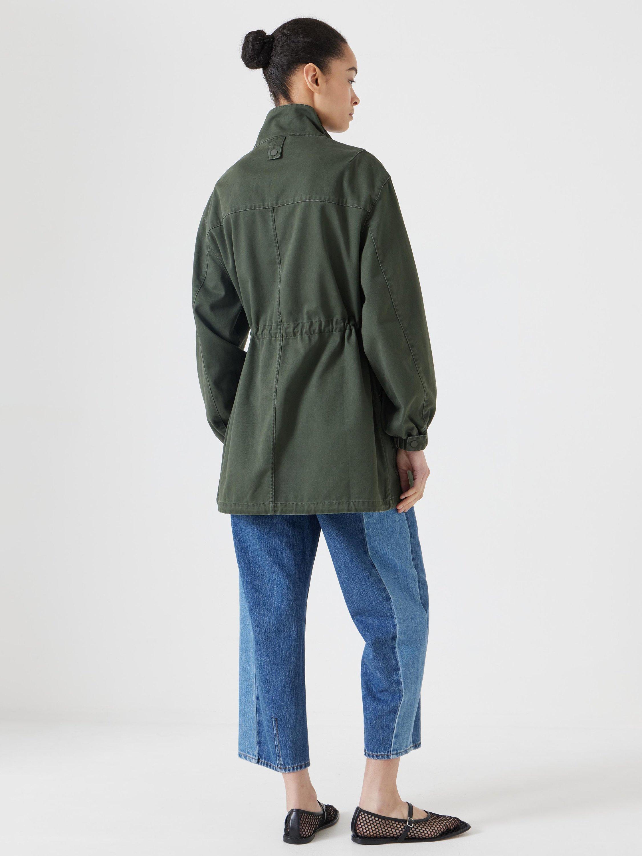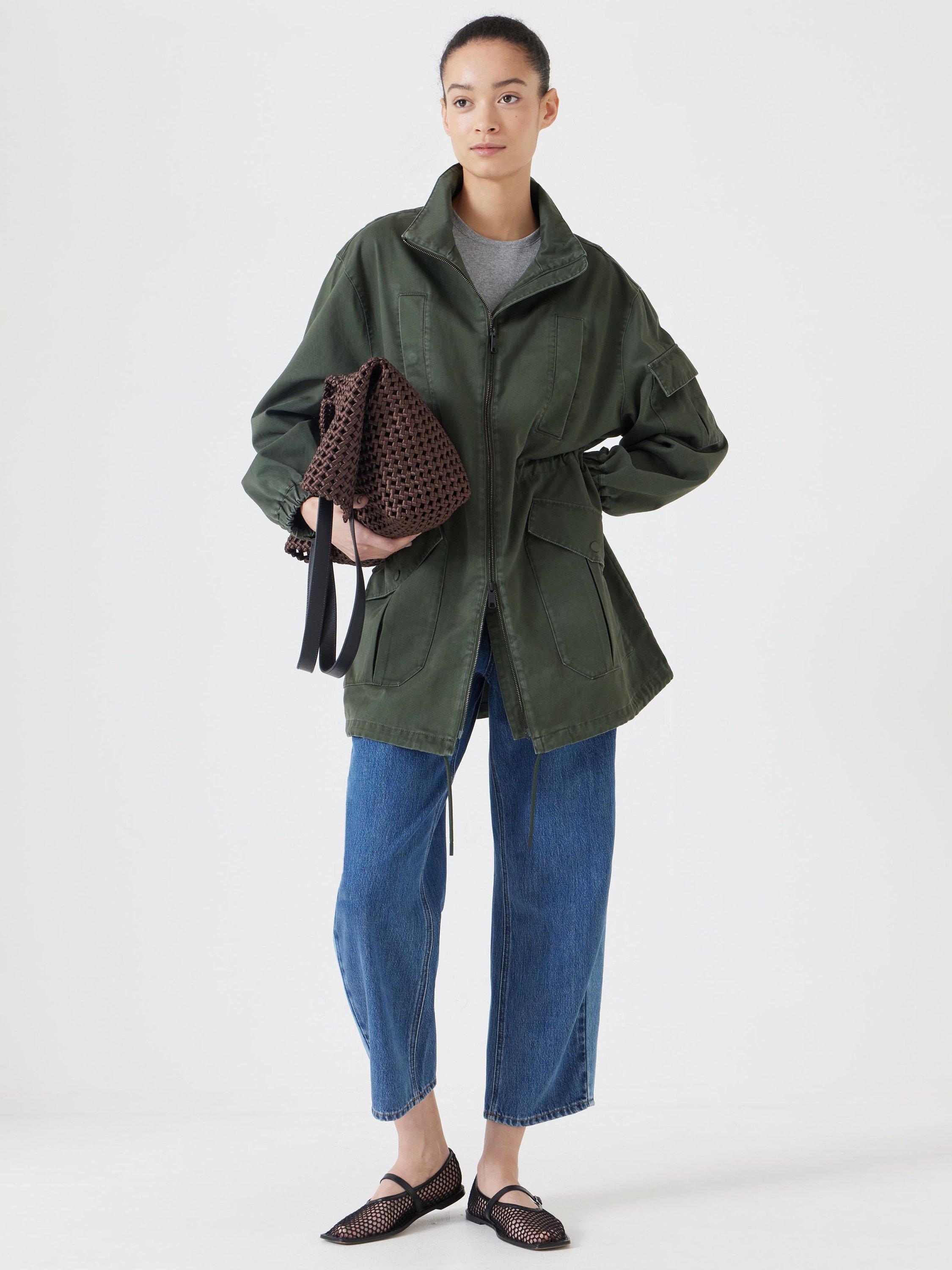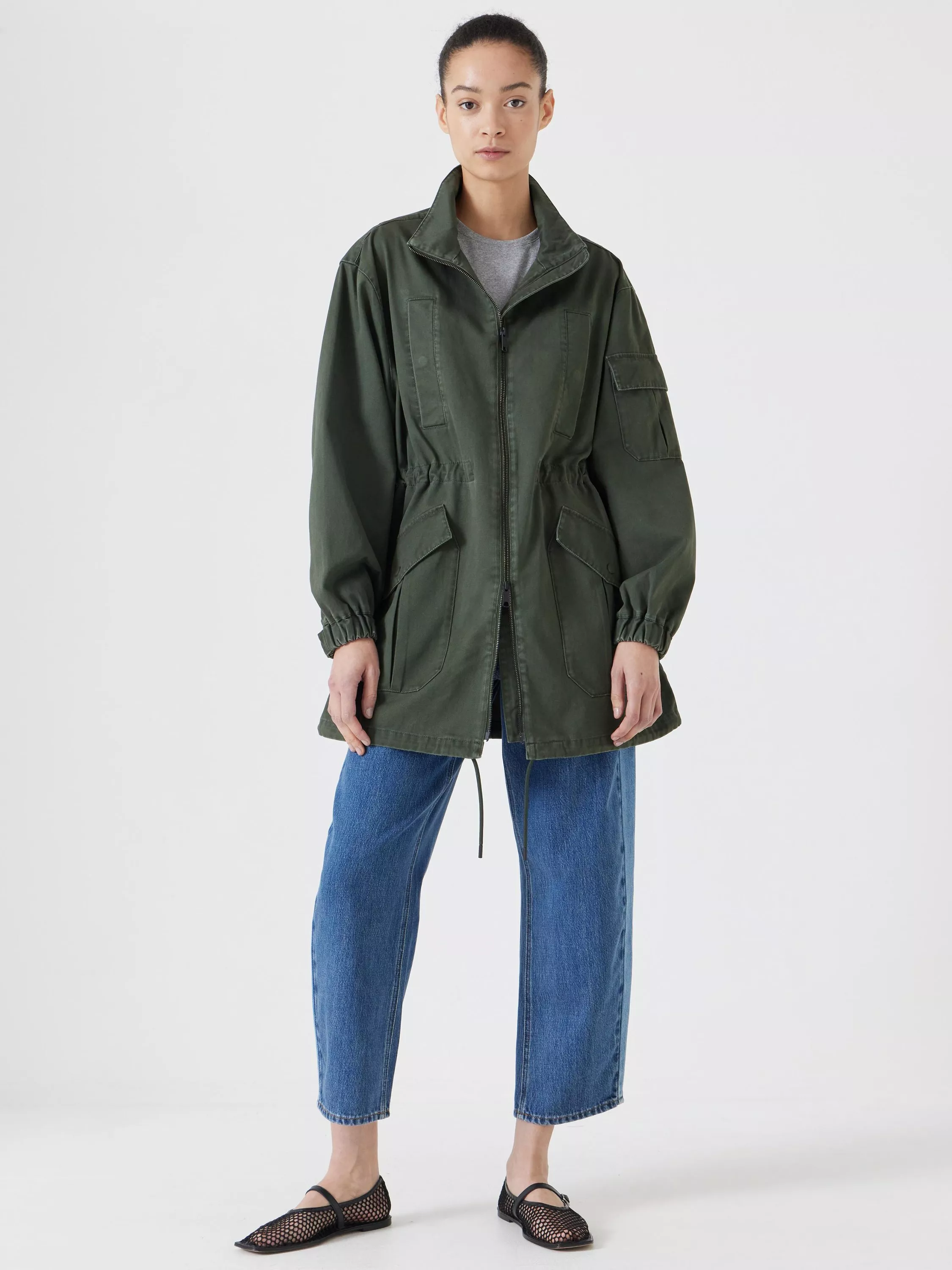 A super easy chuck on utility jacket. It has a relaxed silhouette but the internal drawcord makes it easy to cinch in the figure. With unique pocket shaping, tab detail at the back neck and plain design, this jacket is both flattering and versatile.