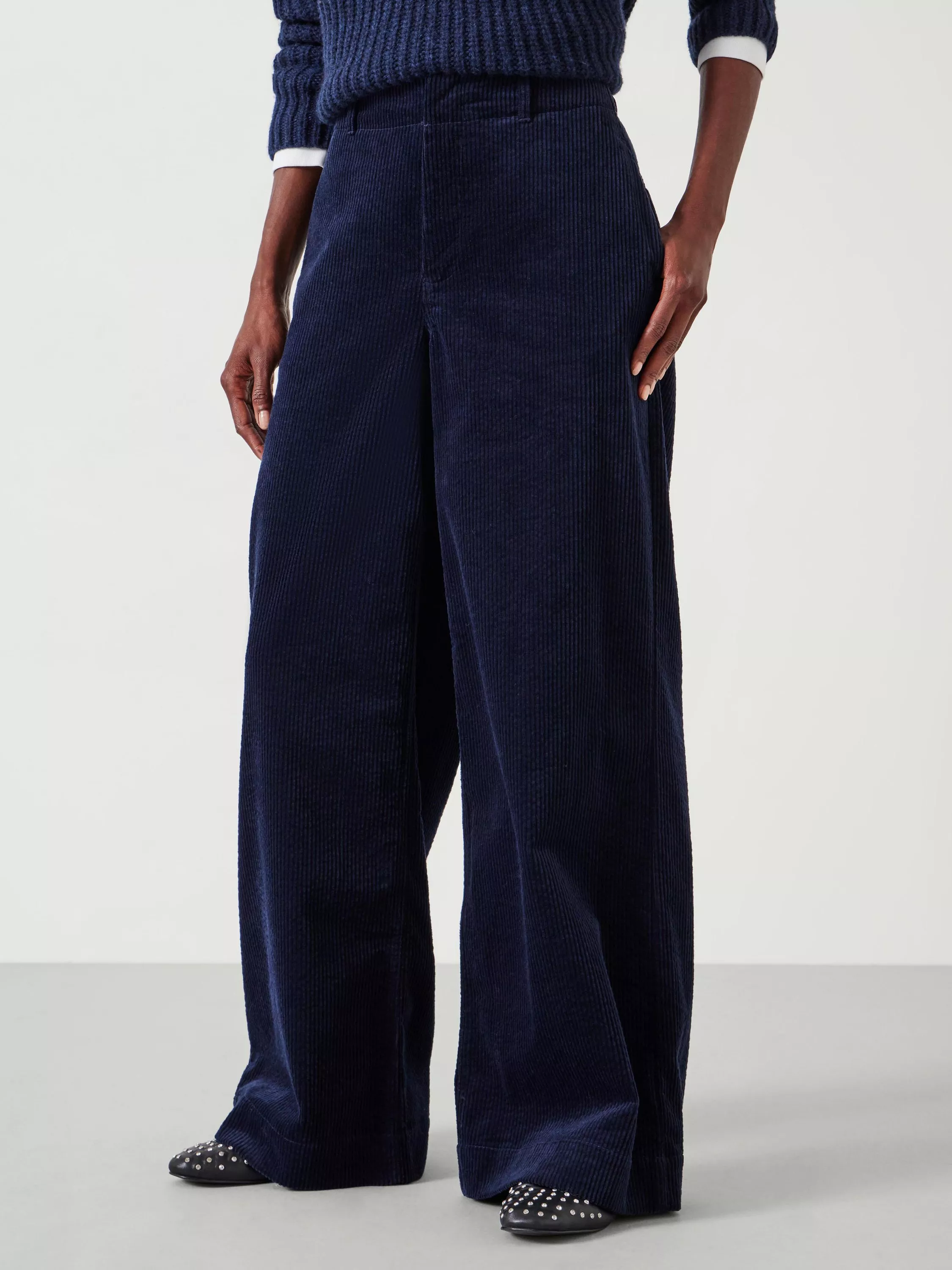 Something about these trousers always seems to create a leg-lengthening effect whenever we pull them on. It's all down to two clever design choices: the vertical corduroy pattern and the wide silhouette which extends right down to the tips of our toes. We love styling them with cropped jumpers to highlight the fitted waist.