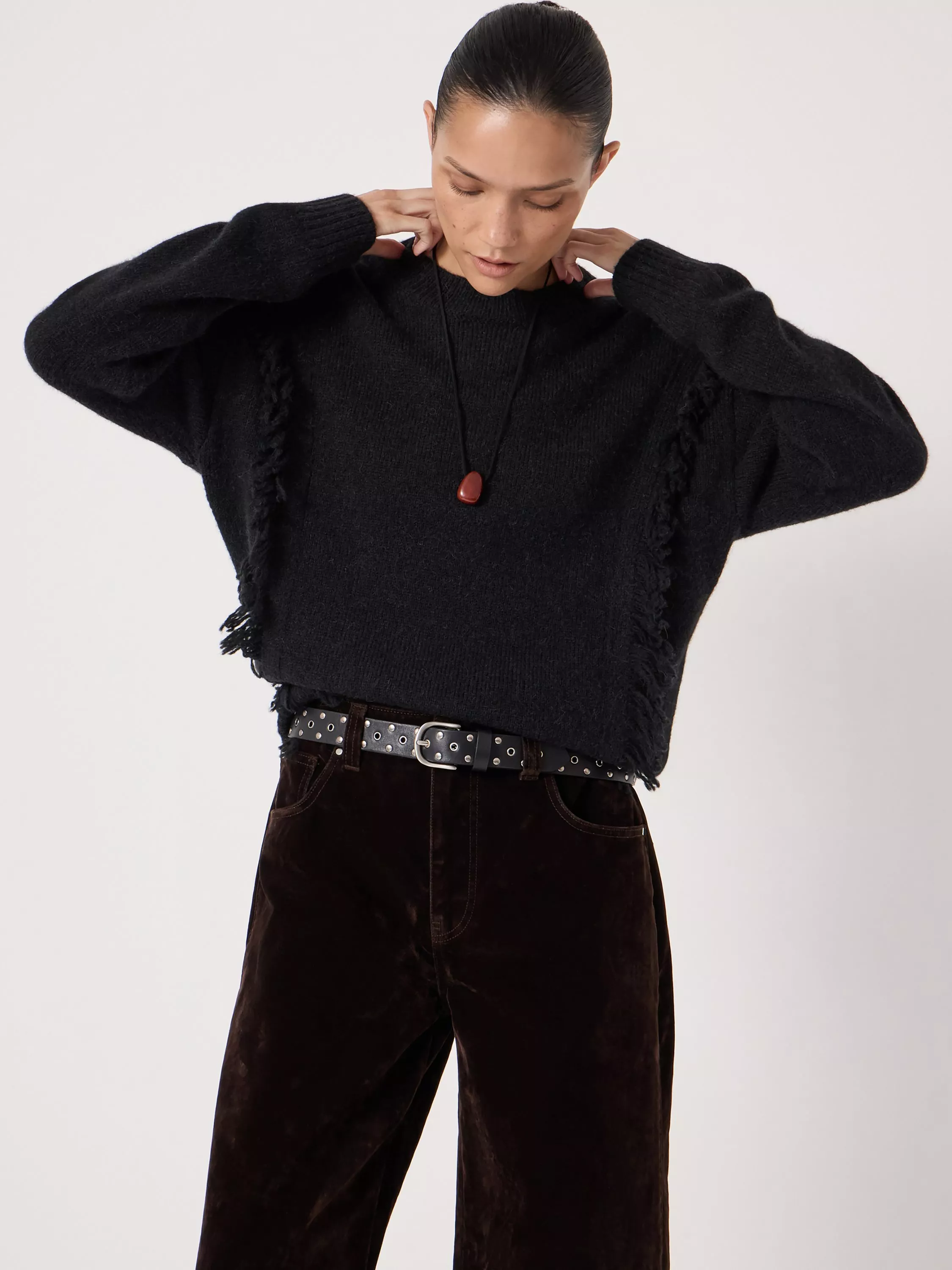 Making layering up easy with a crew neckline and long sleeves, this fringed jumper by HUSH is a fine match for grey skies in a warming woollen blend.