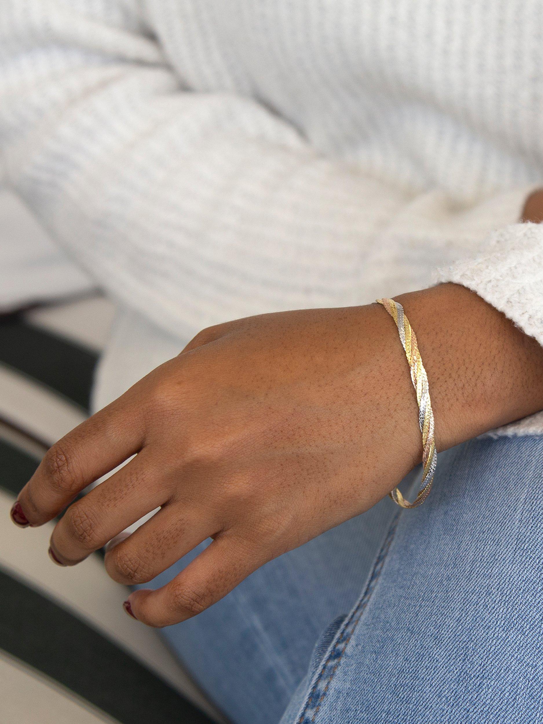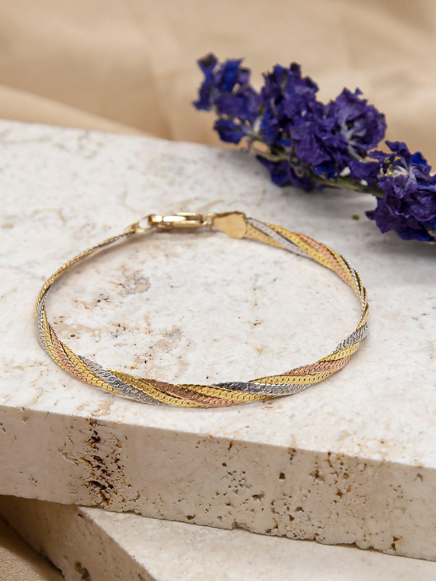 Combining rose, white and yellow gold together for a stunning effect, this herringbone bracelet from IBB is a unique wrist accessory. Intricately twisted together for a great finish, the bracelet has a reliable lobster clasp at the end to ensure it stays on.